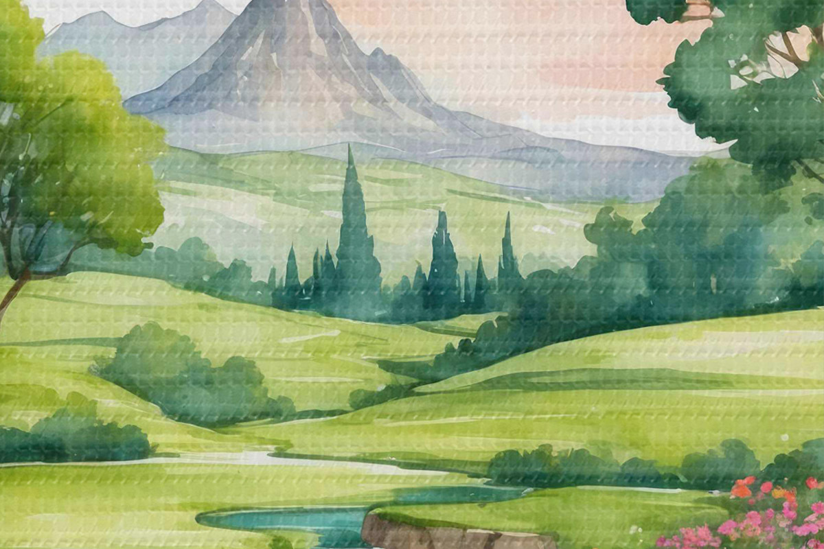 Image Aquarelle représentant une rivière et des fleurs Nr r37116