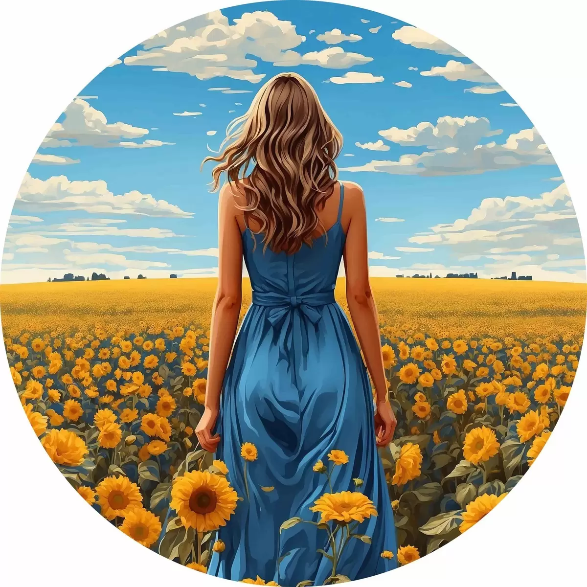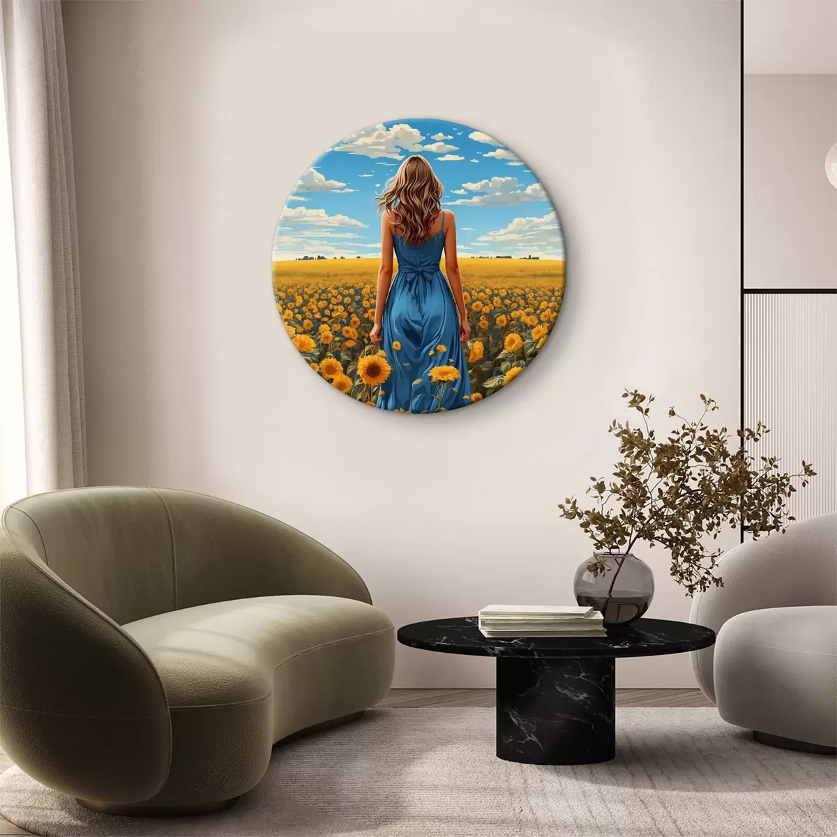 Tableaux ronds Femme en robe bleue dans un champ de tournesols r37164