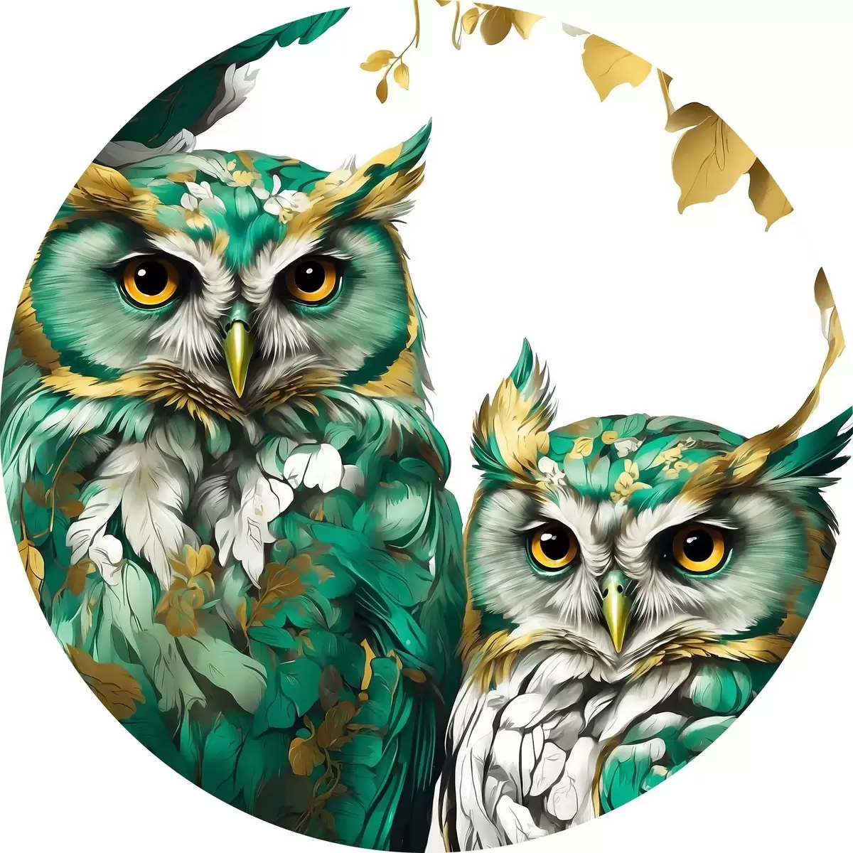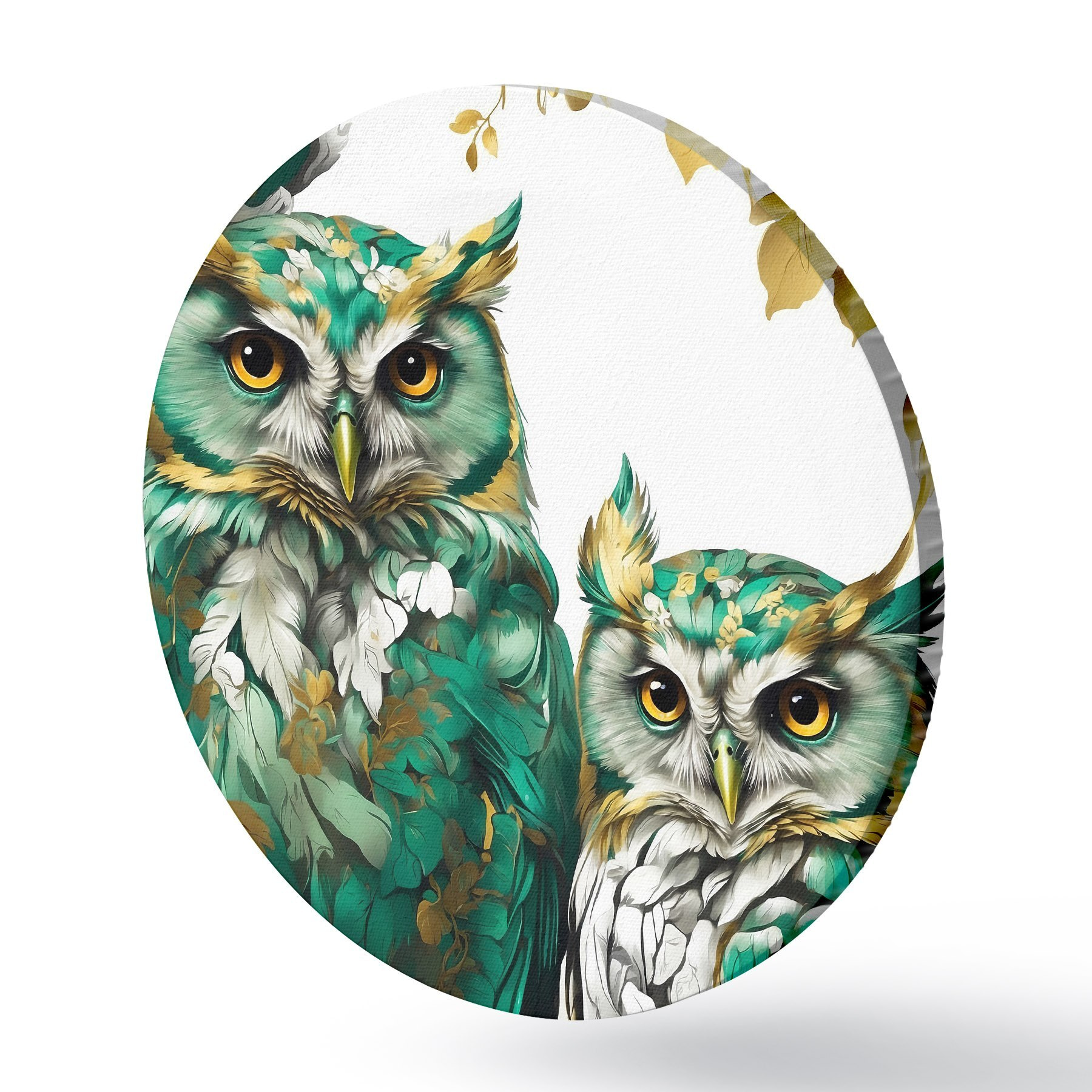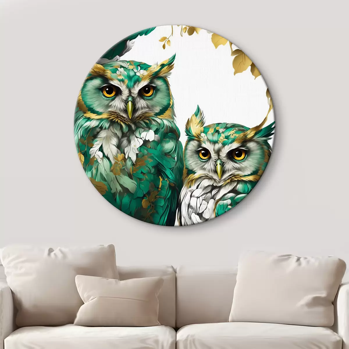 Tableaux ronds Deux chouettes vertes dans les feuilles r37569