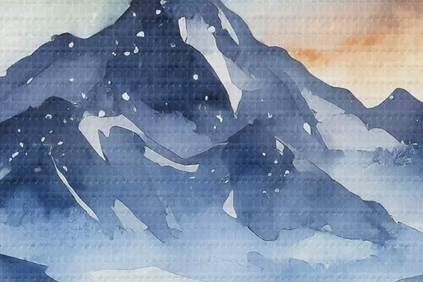 Image Aquarelle paysage de montagne, forêt, ciel étoilé, couleurs du coucher de soleil Nr r37946