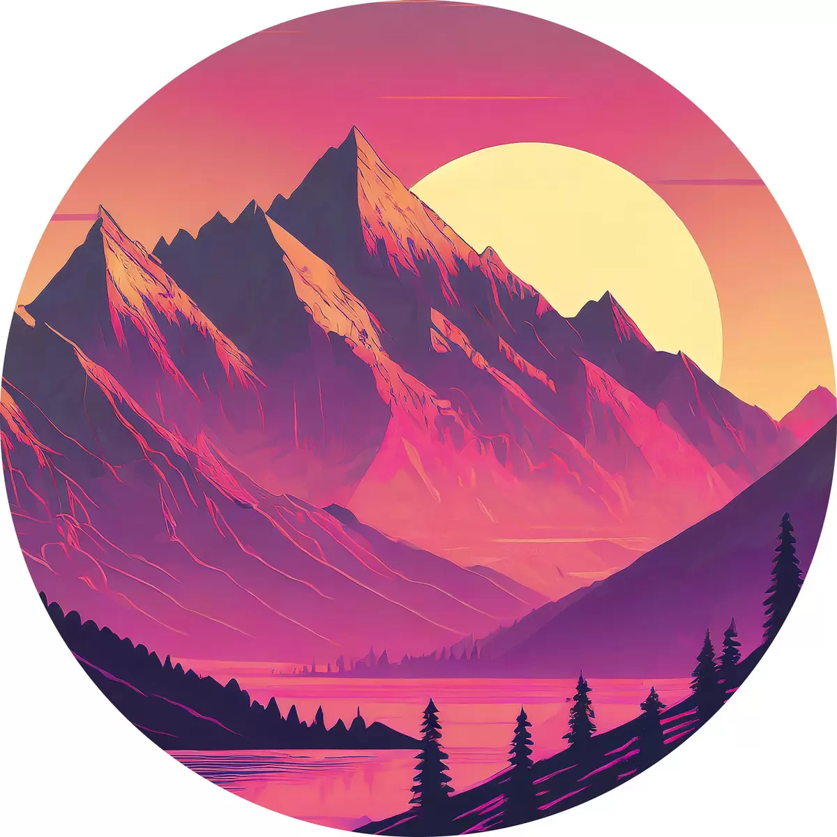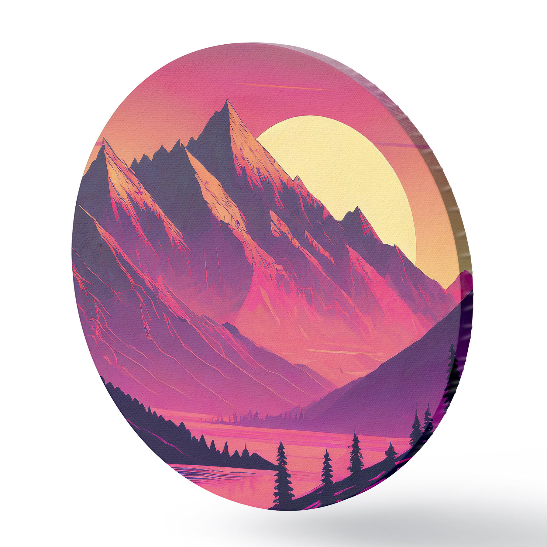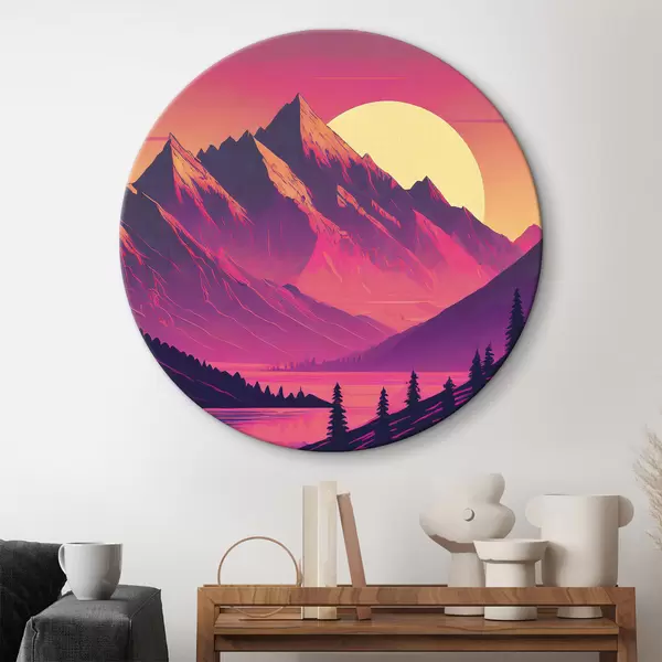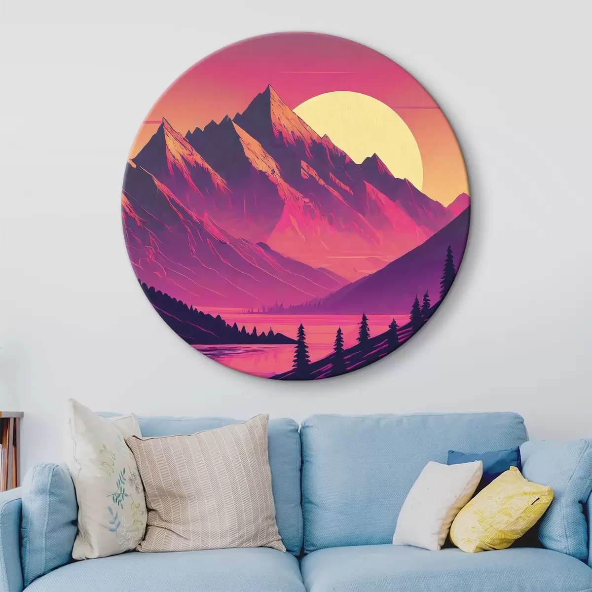 Tableaux ronds Abstrait paysage de montagne, couleurs vives, rose, ciel couchant, futuriste, soleil, forêt r38000