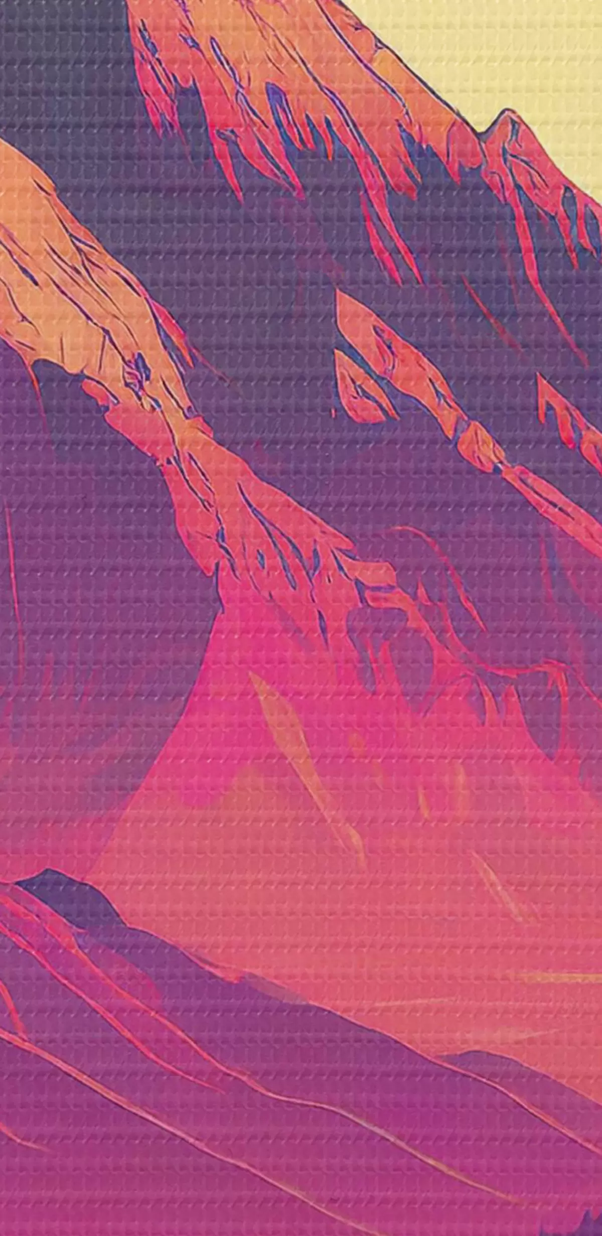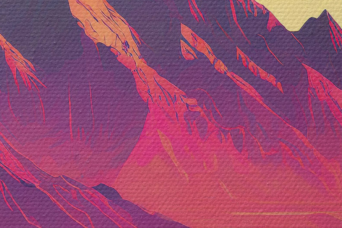 Image Abstrait paysage de montagne, couleurs vives, rose, ciel couchant, futuriste, soleil, forêt Nr r38000