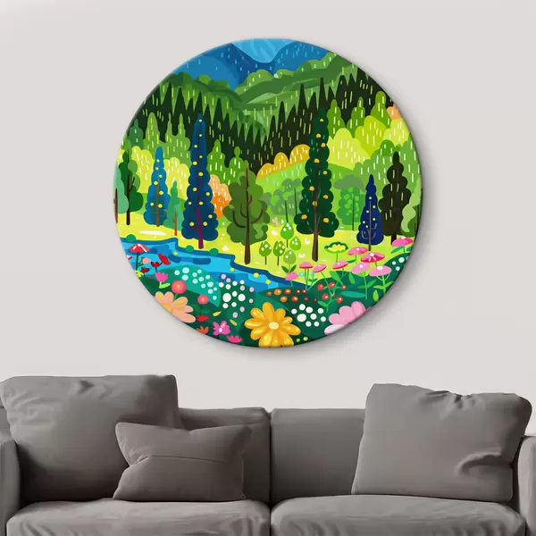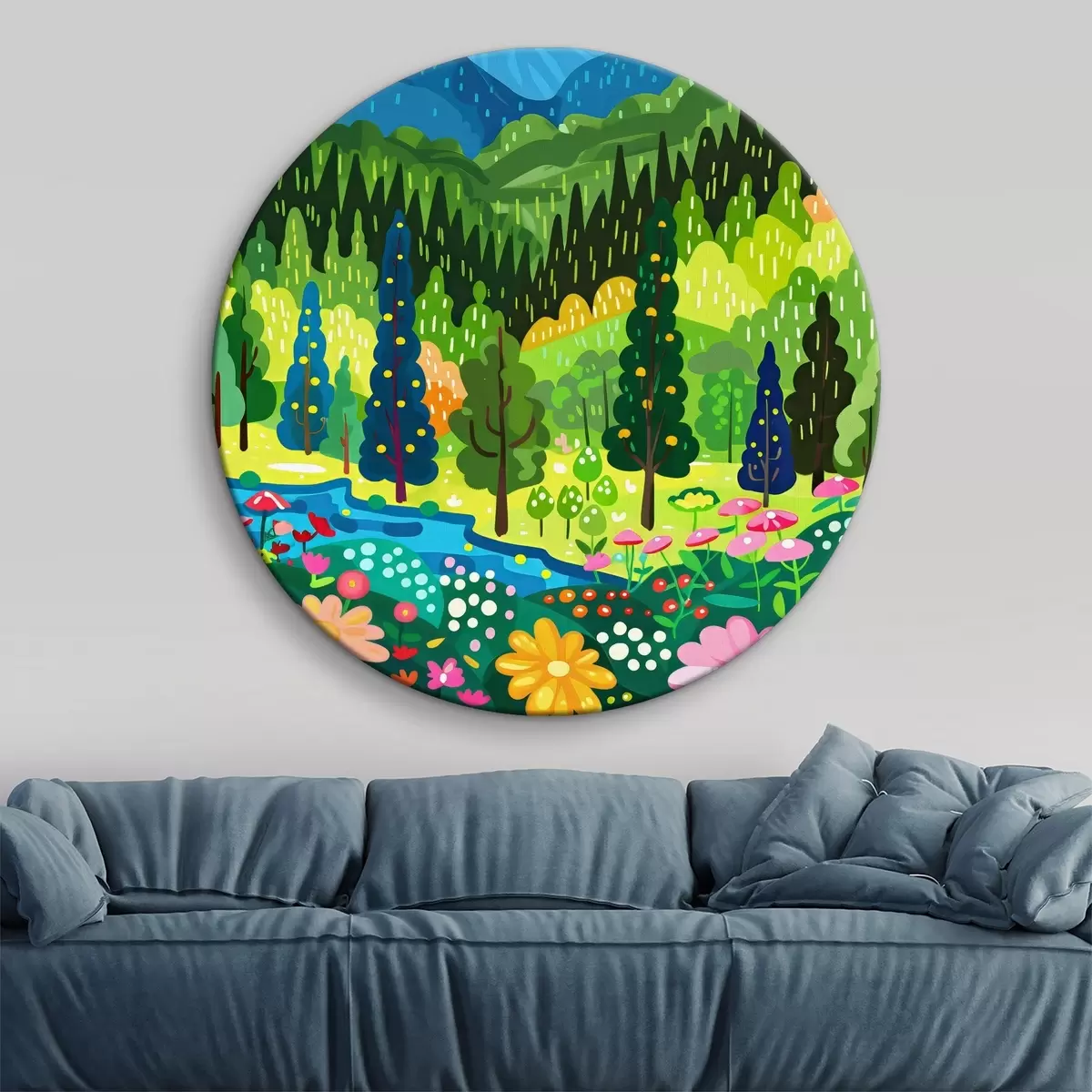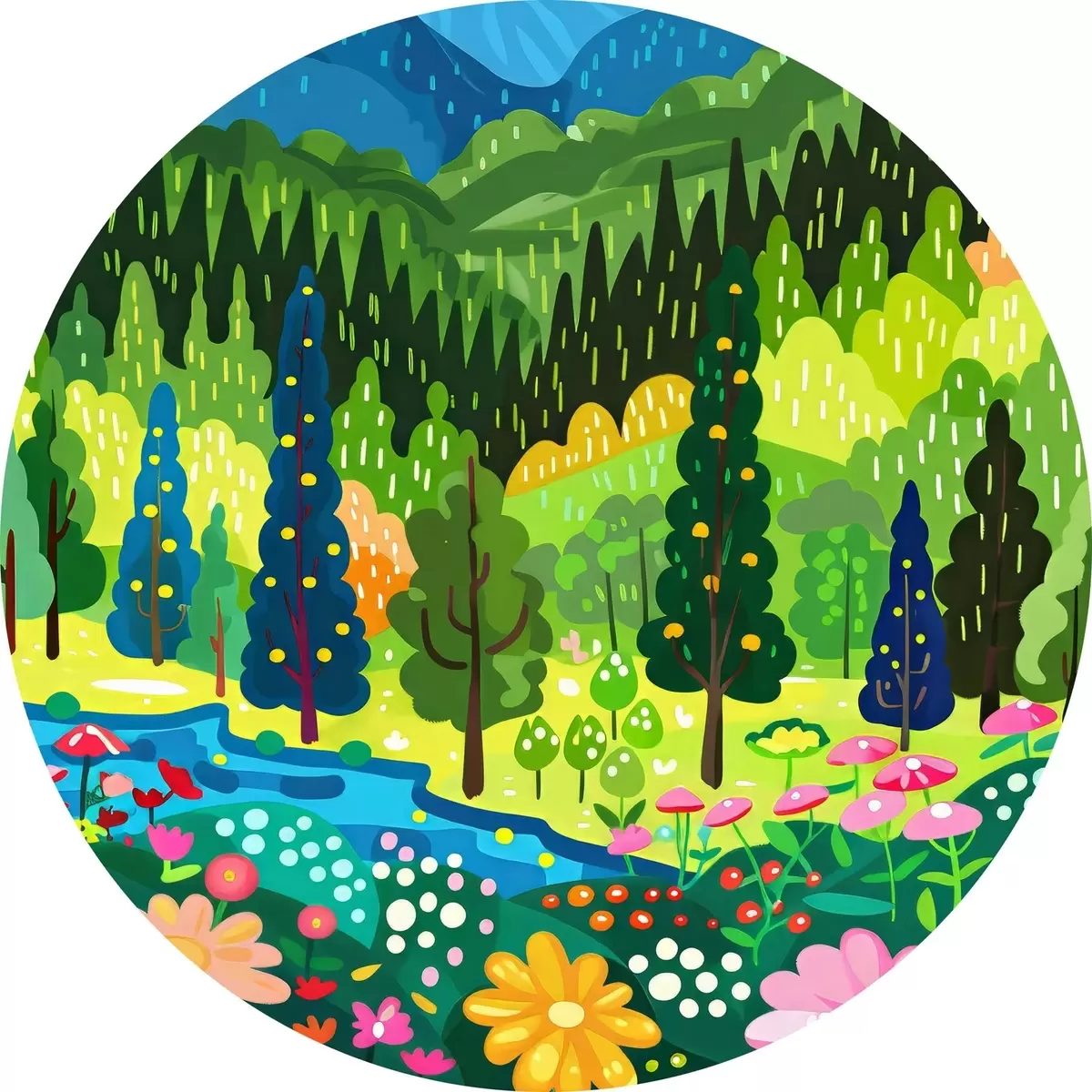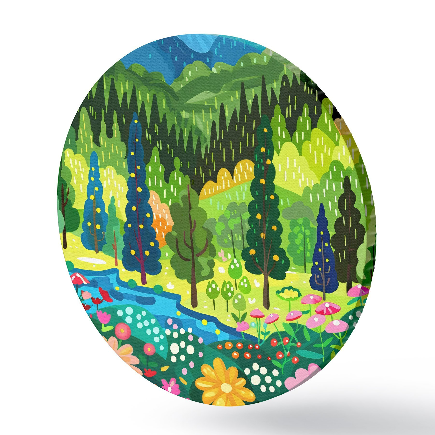 Tableaux ronds Paysage de dessin animé avec des arbres et des fleurs r38140