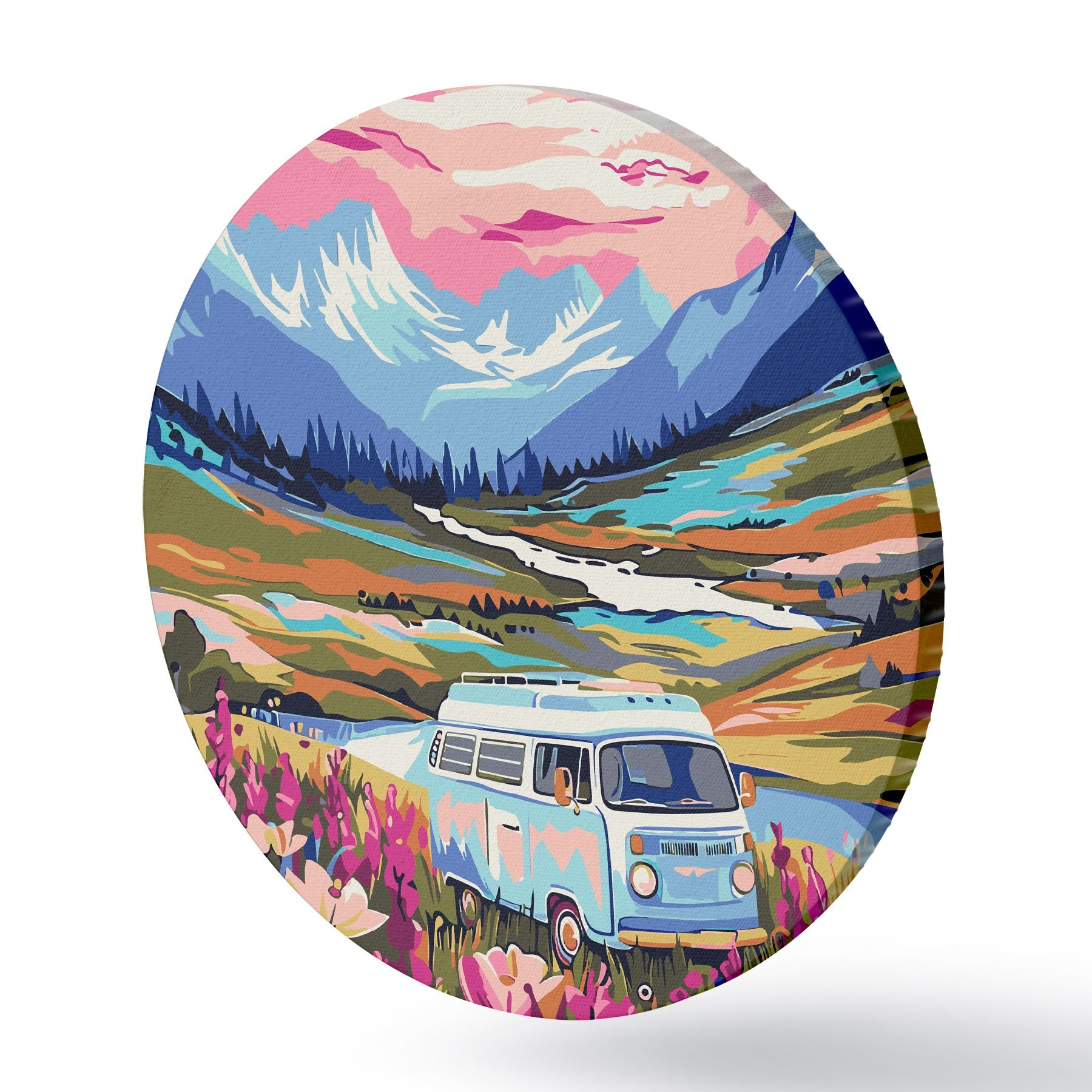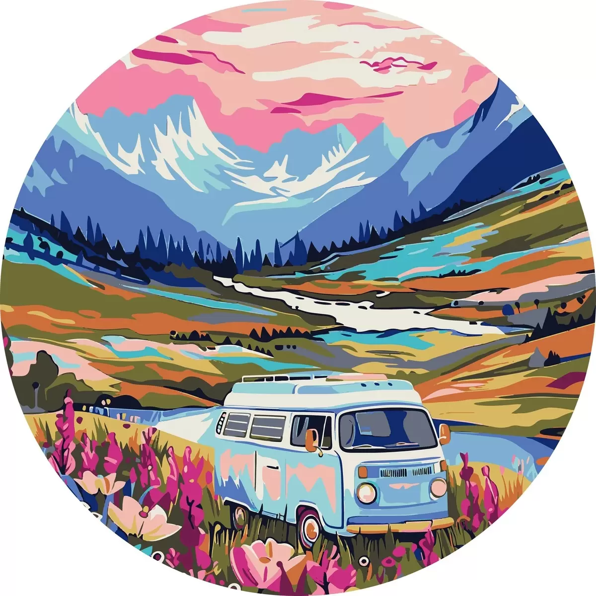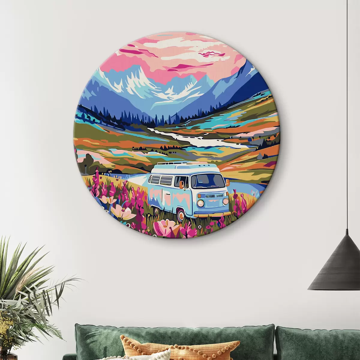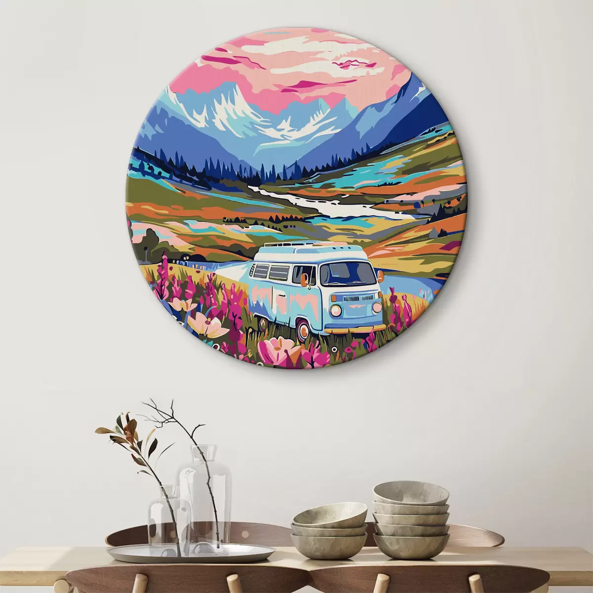 Tableaux ronds Une camionnette traversant un champ de fleurs r38260