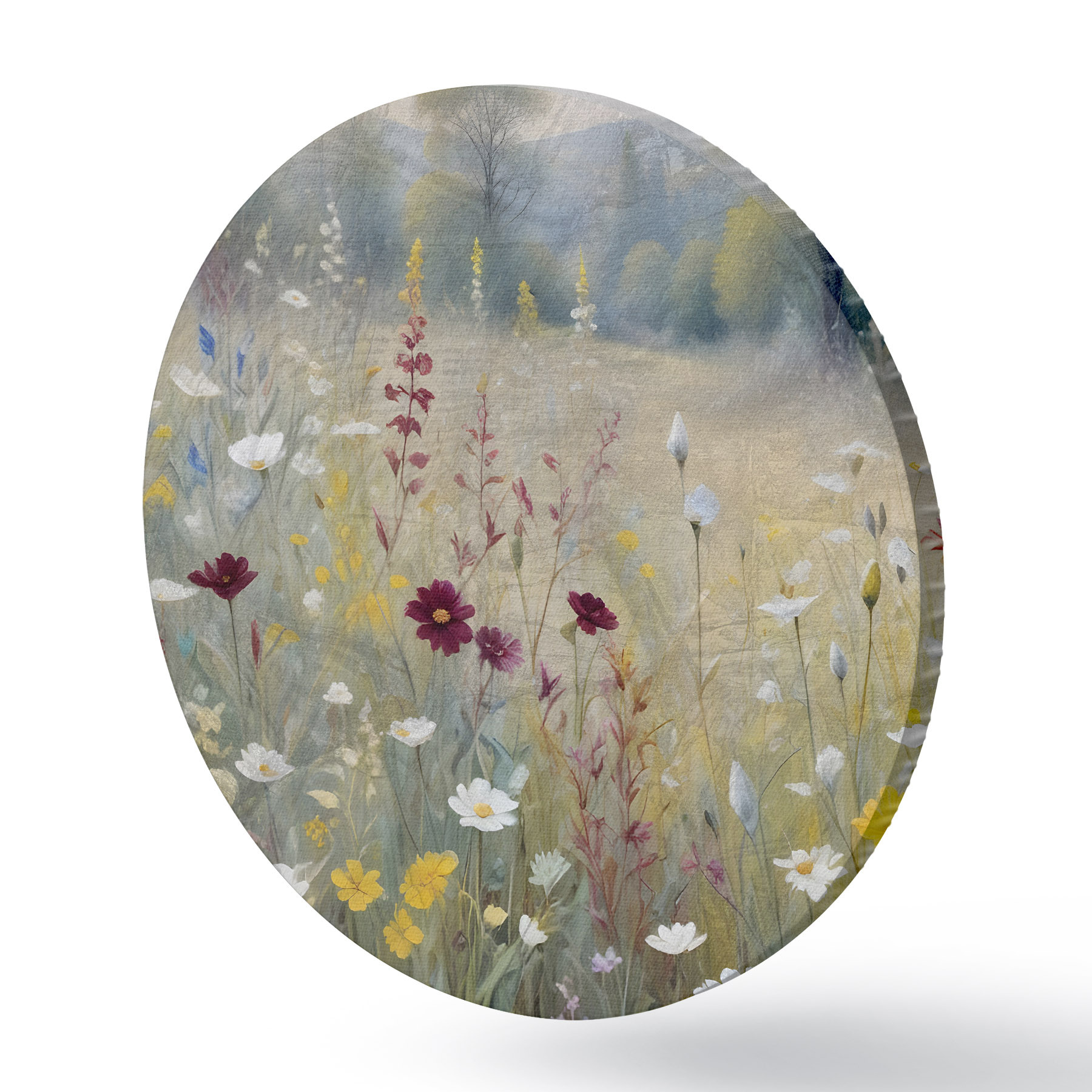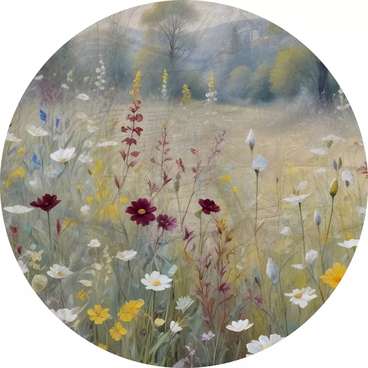 Tableaux ronds Une prairie colorée avec des fleurs sauvages avec une forêt floue en arrière-plan r38368