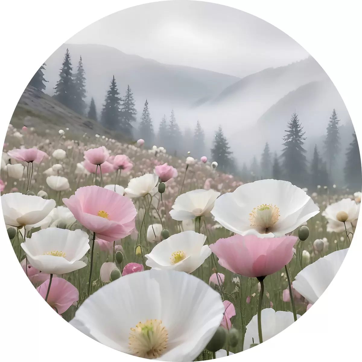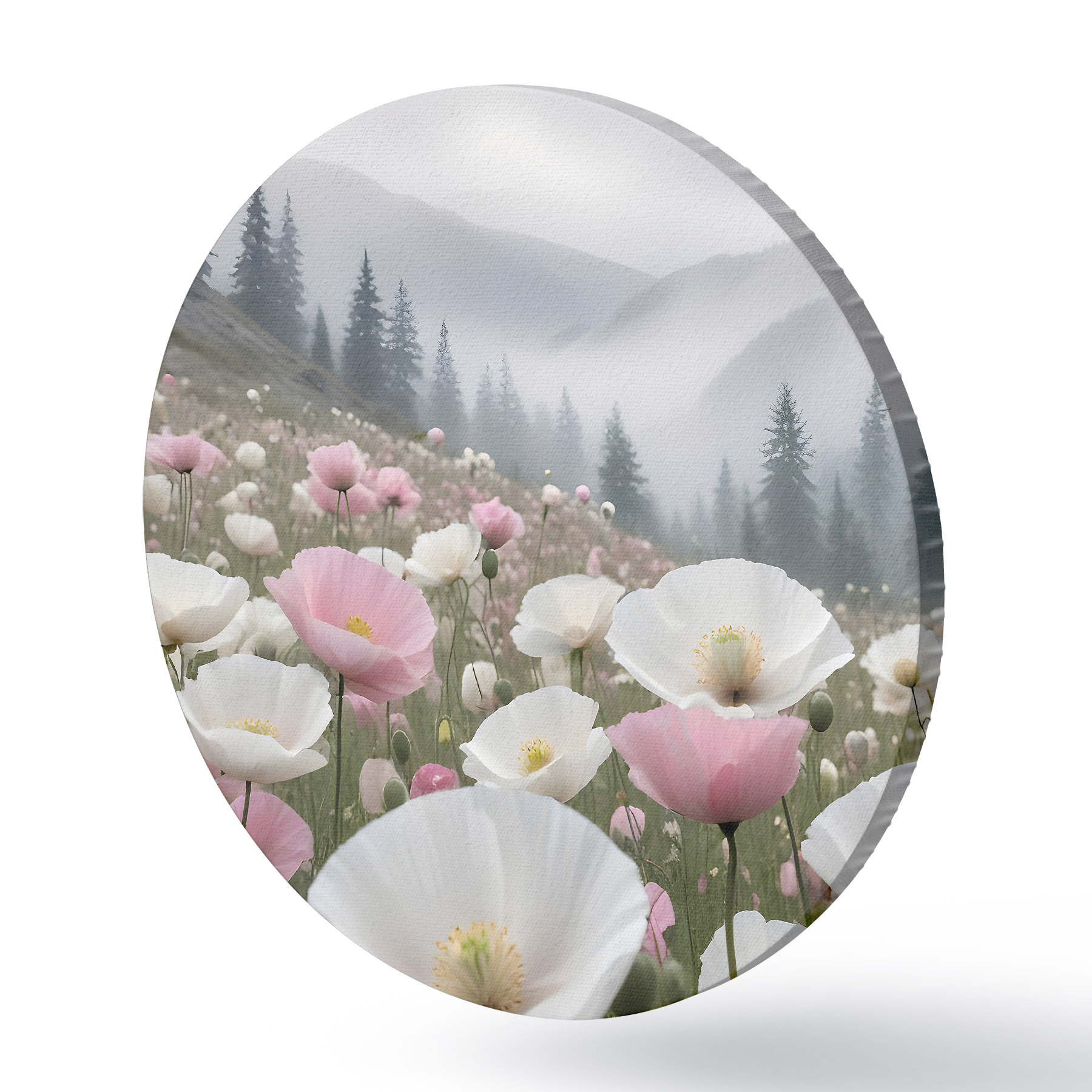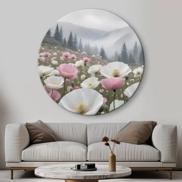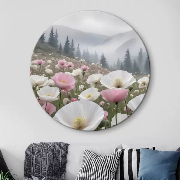 Tableaux ronds Un champ de coquelicots roses et blancs dans le paysage de montagne en arrière-plan r38369