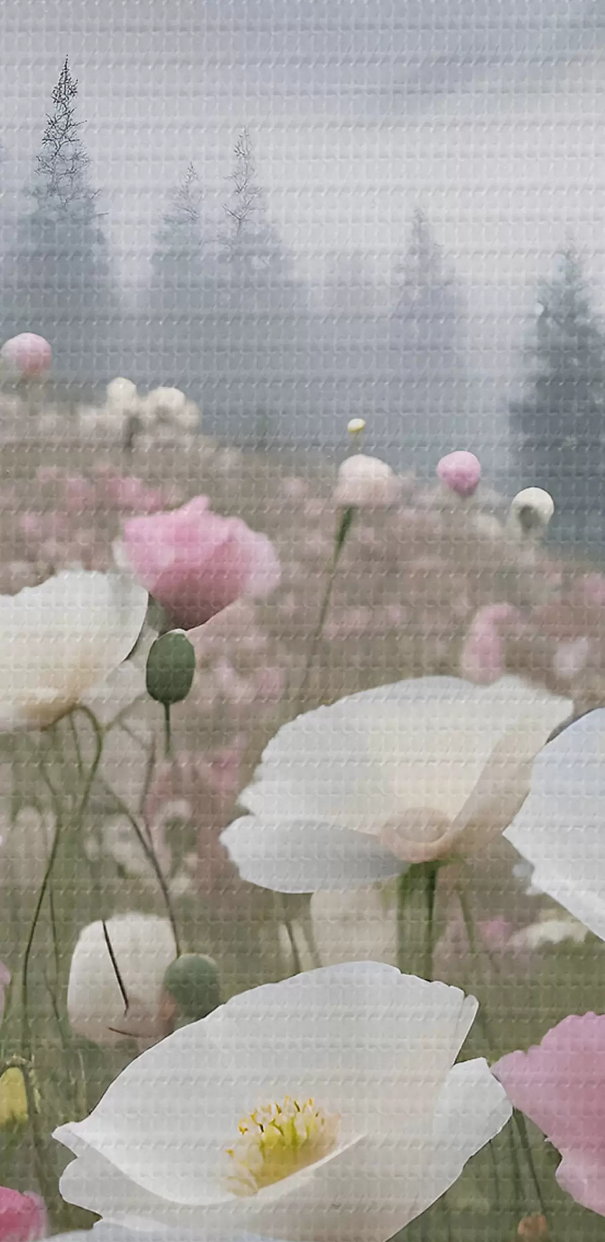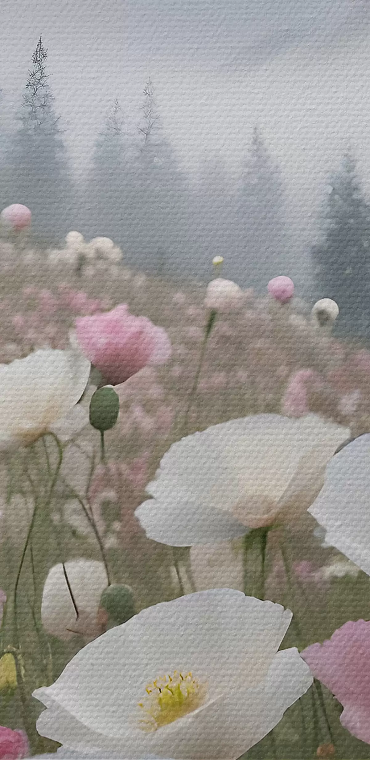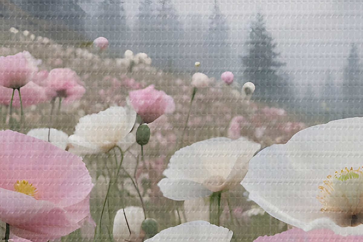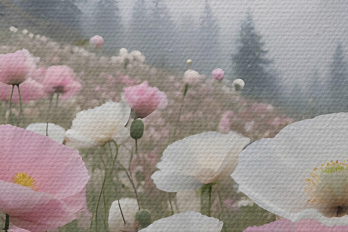 Image Un champ de coquelicots roses et blancs dans le paysage de montagne en arrière-plan Nr r38369