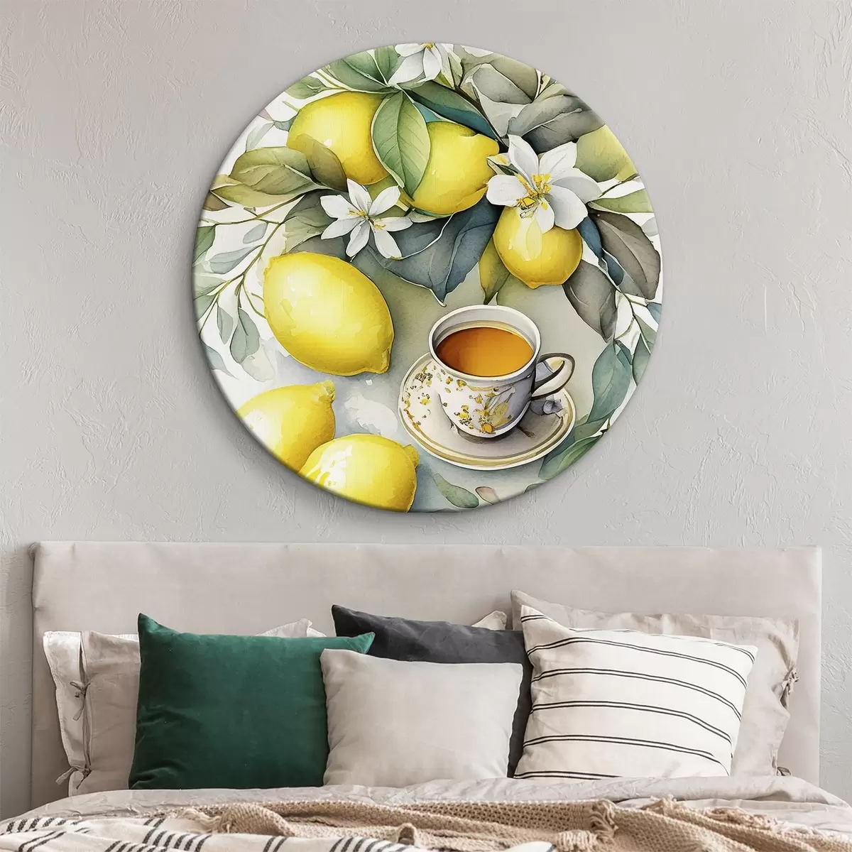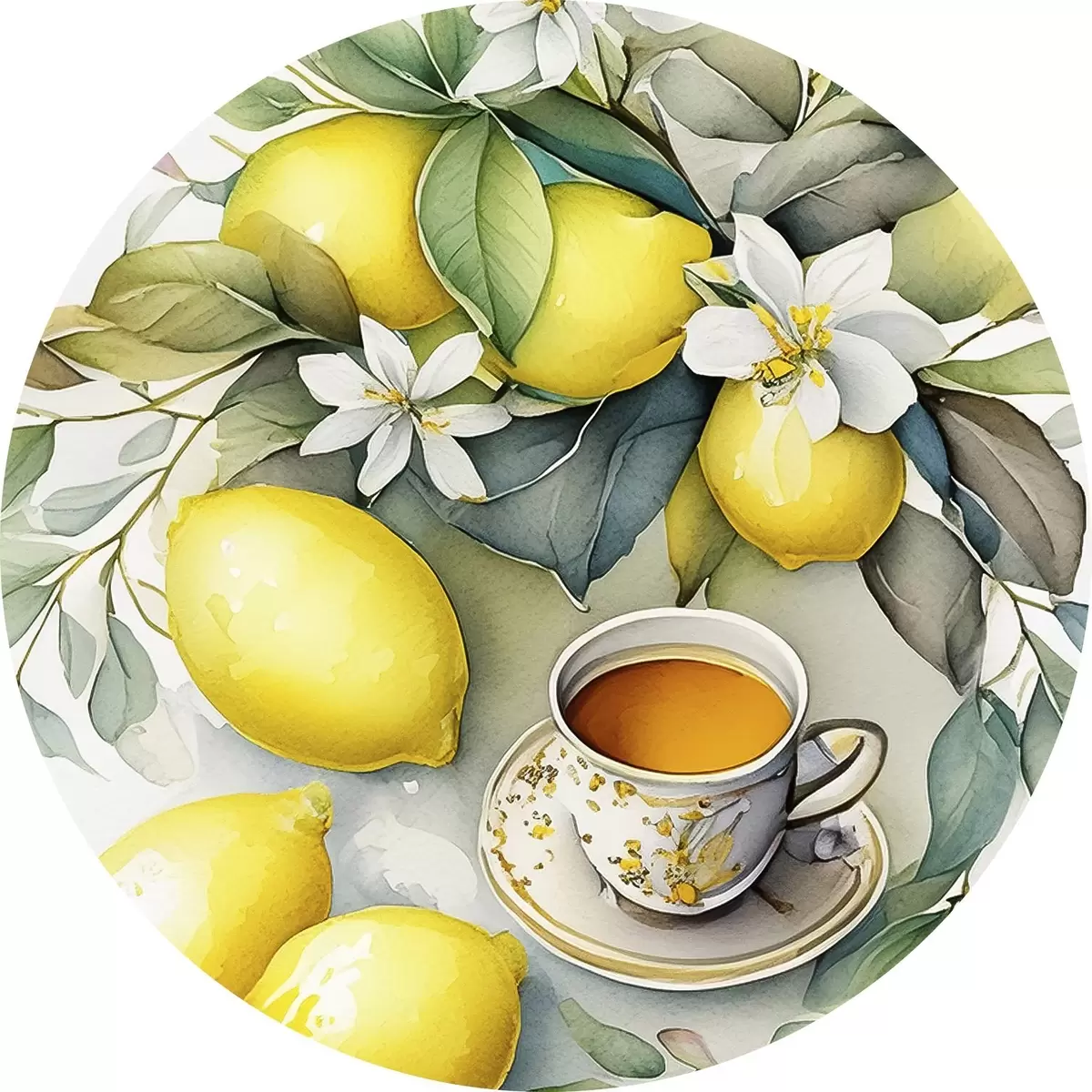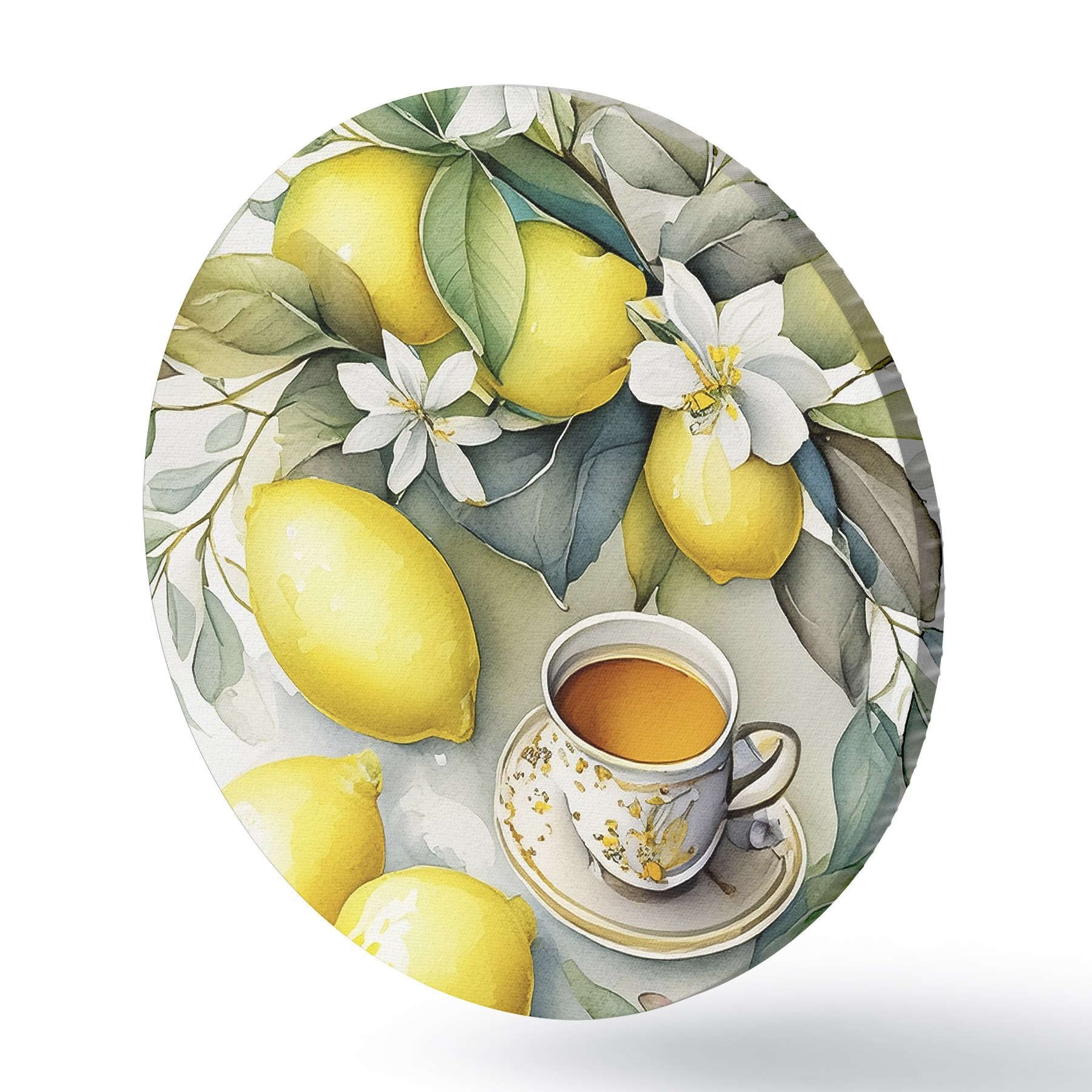 Tableaux ronds Citrons et fleurs, aquarelle, petit déjeuner, tasse de thé, style bohème r38403