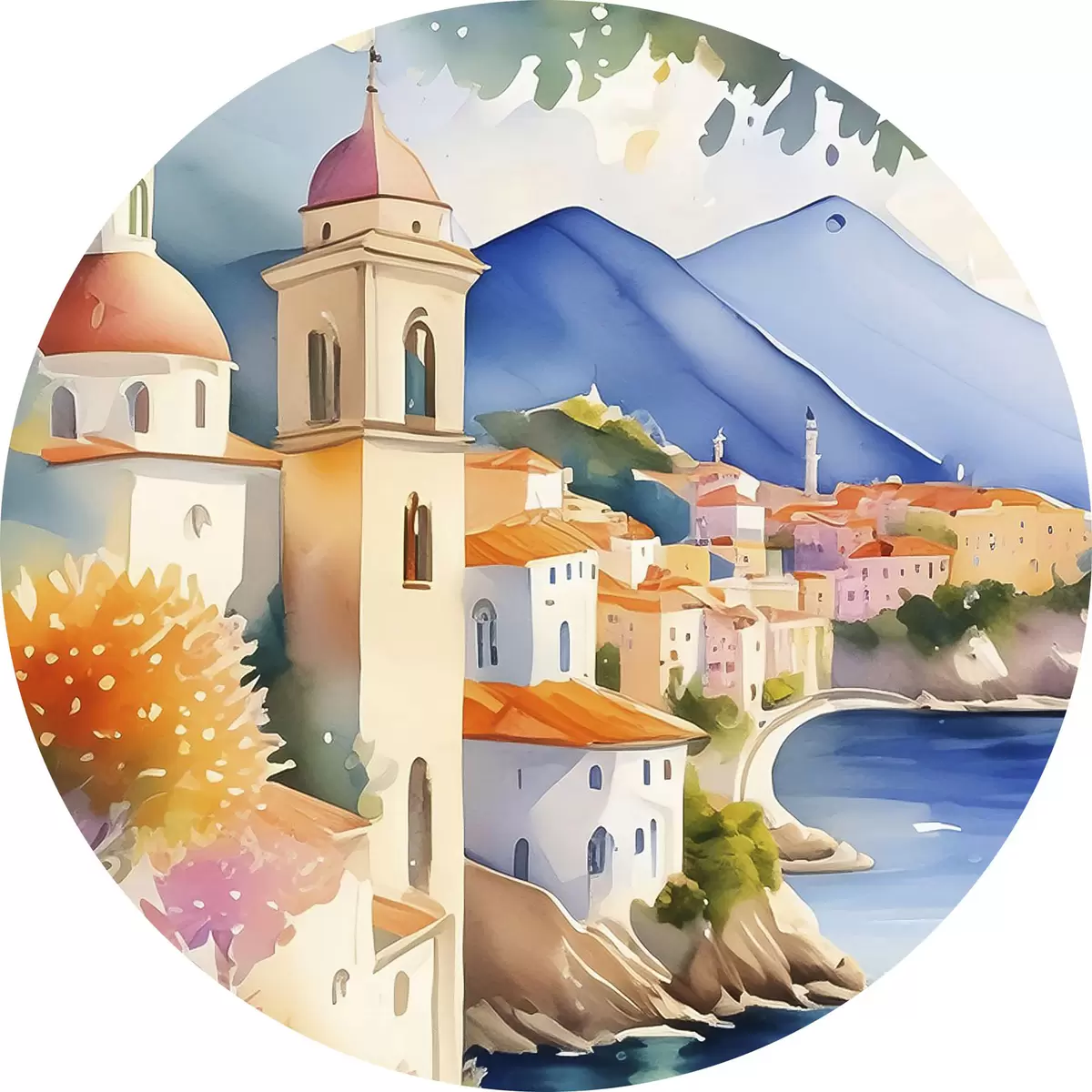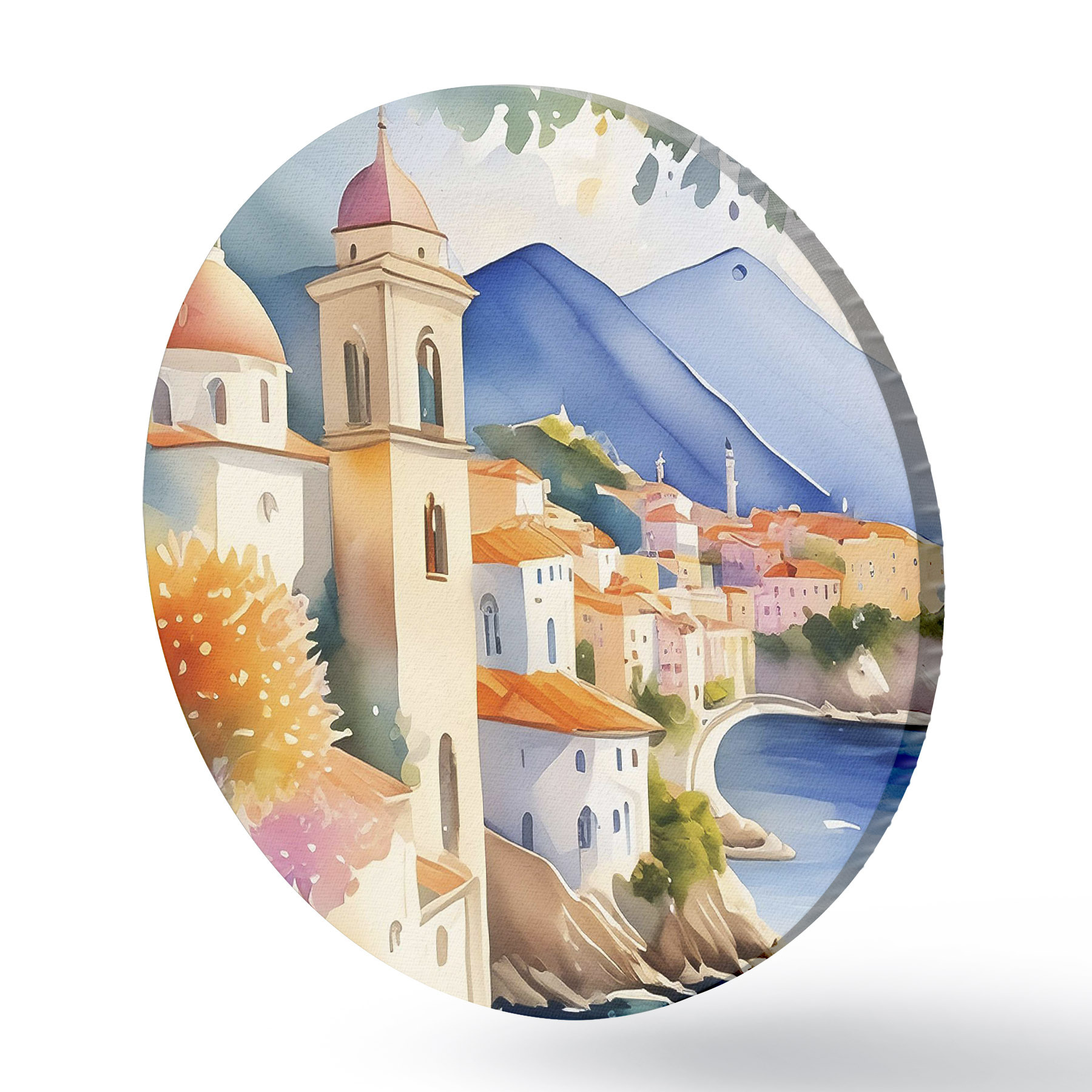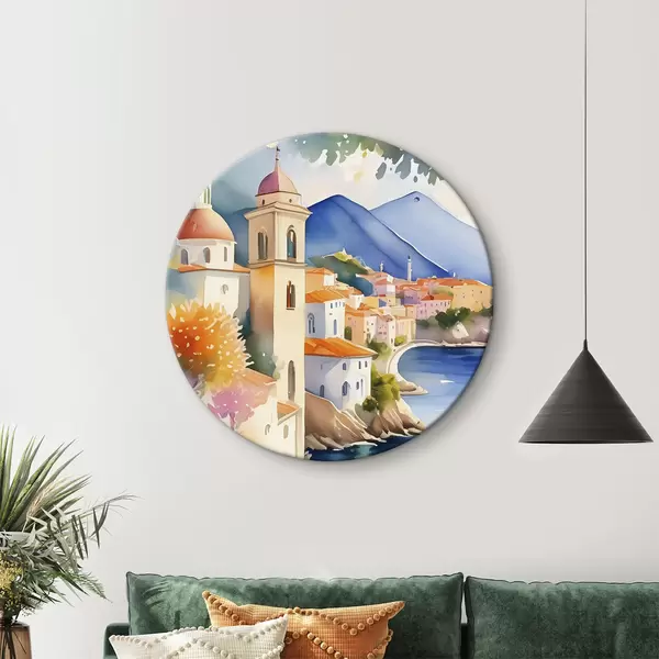 Tableaux ronds Une aquarelle représentant une ville au bord d'un réservoir r38407