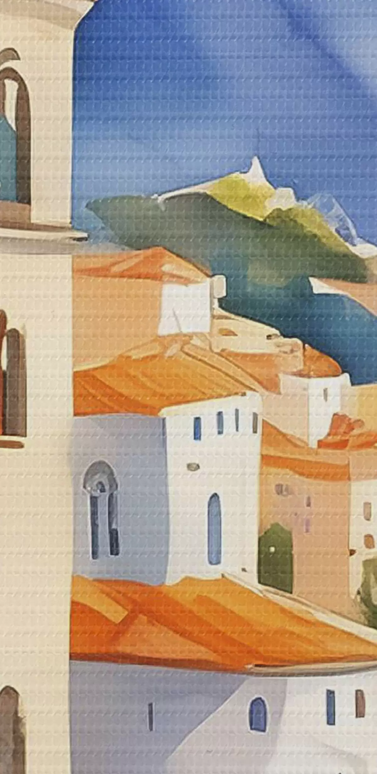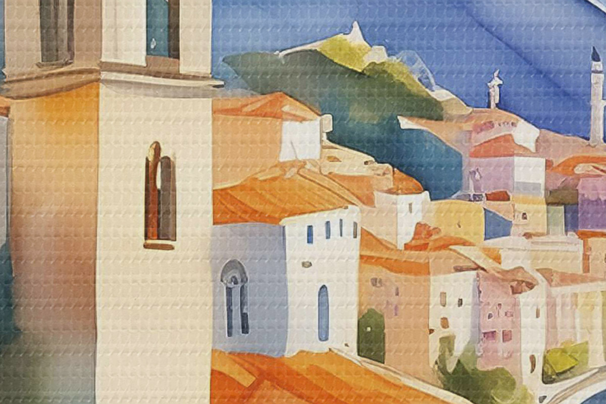 Image Une aquarelle représentant une ville au bord d'un réservoir Nr r38407