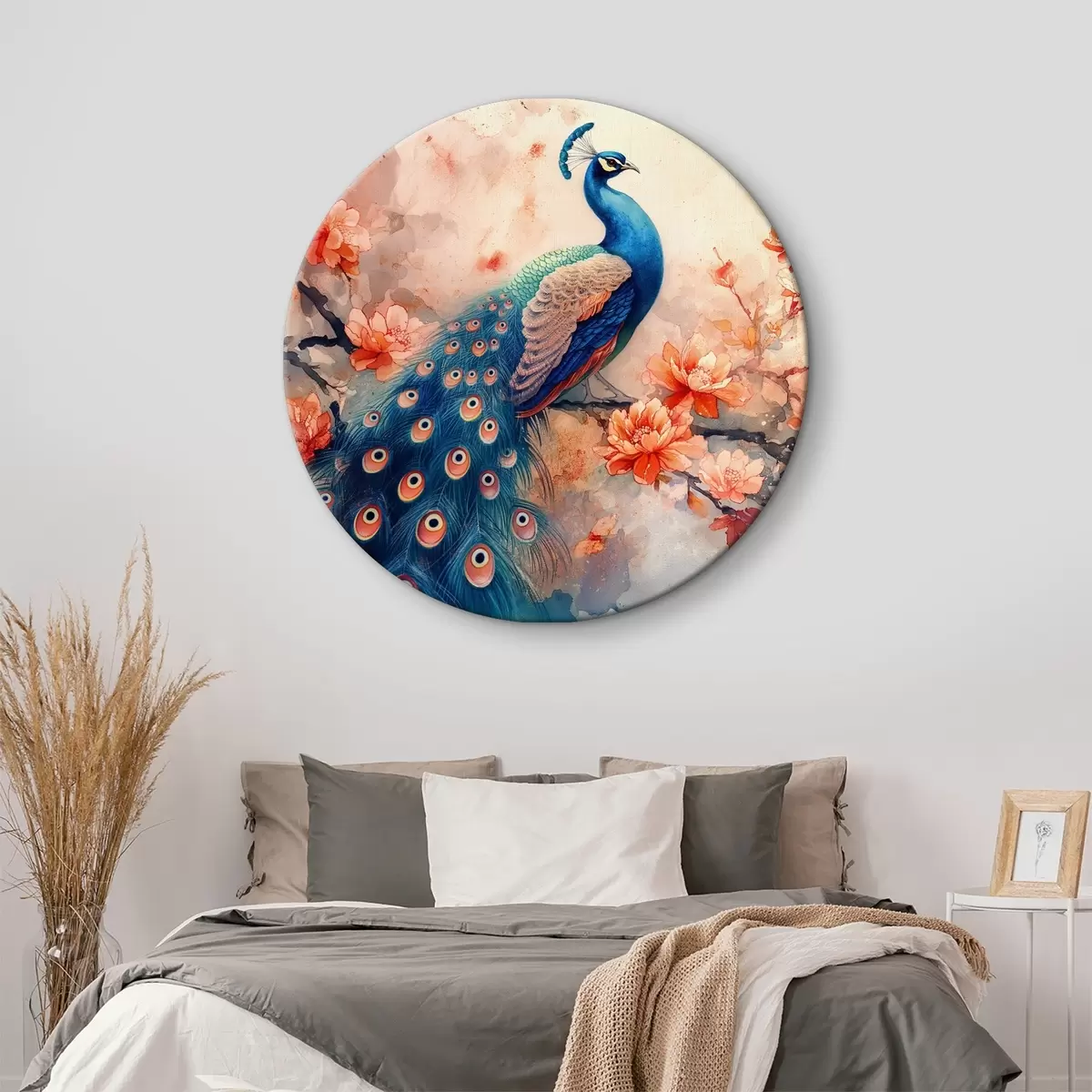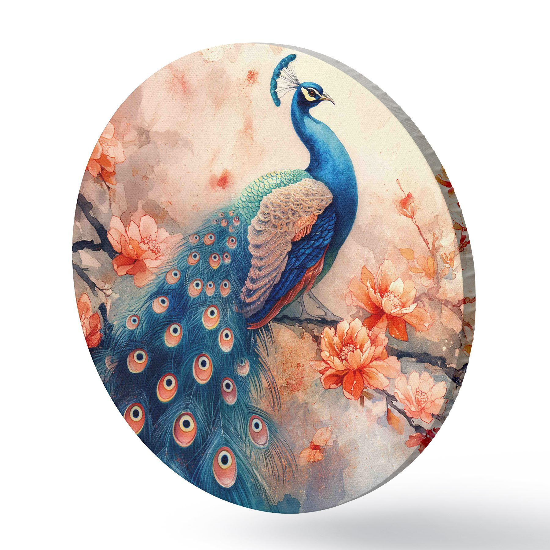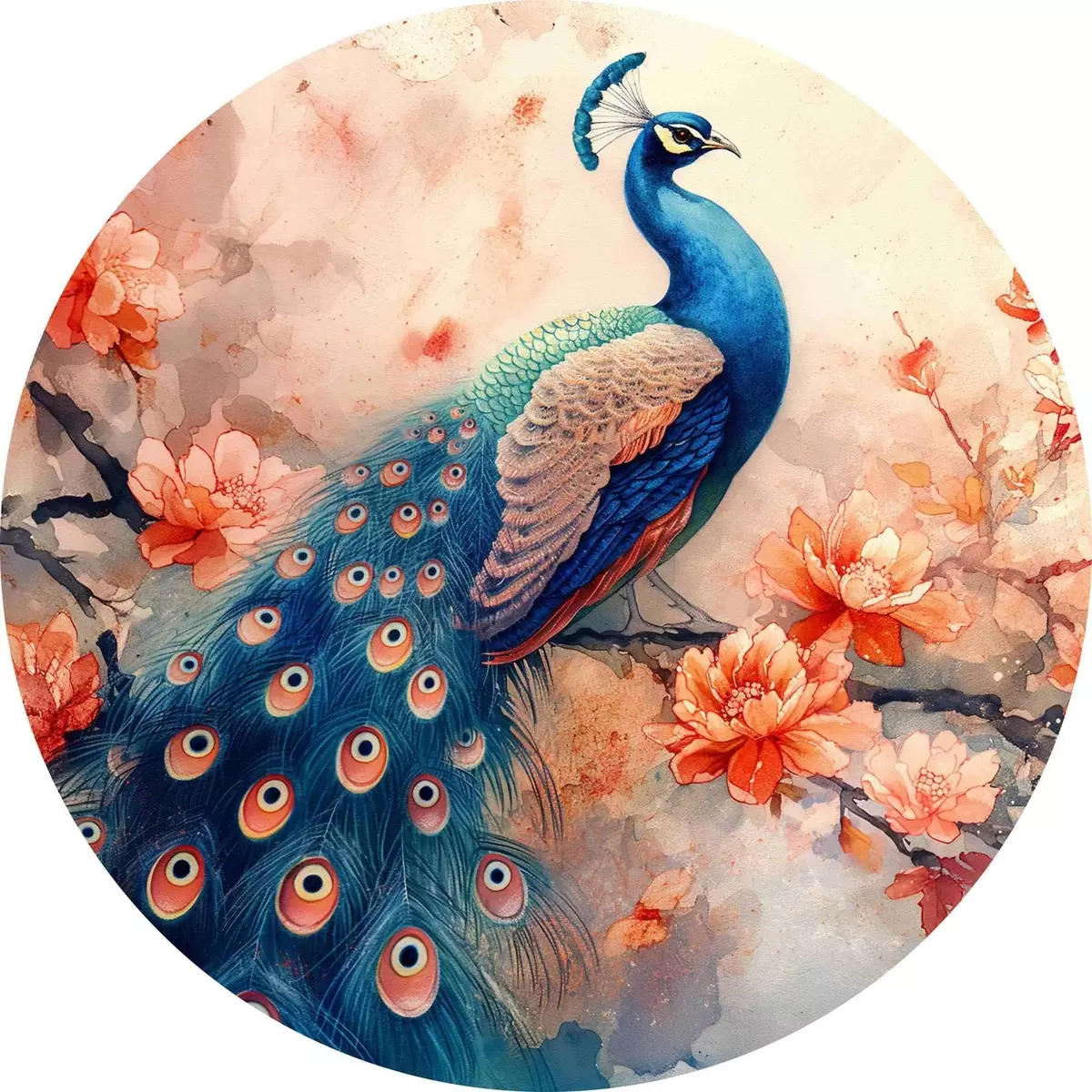 Tableaux ronds Peinture représentant un paon sur une branche avec des fleurs r38455