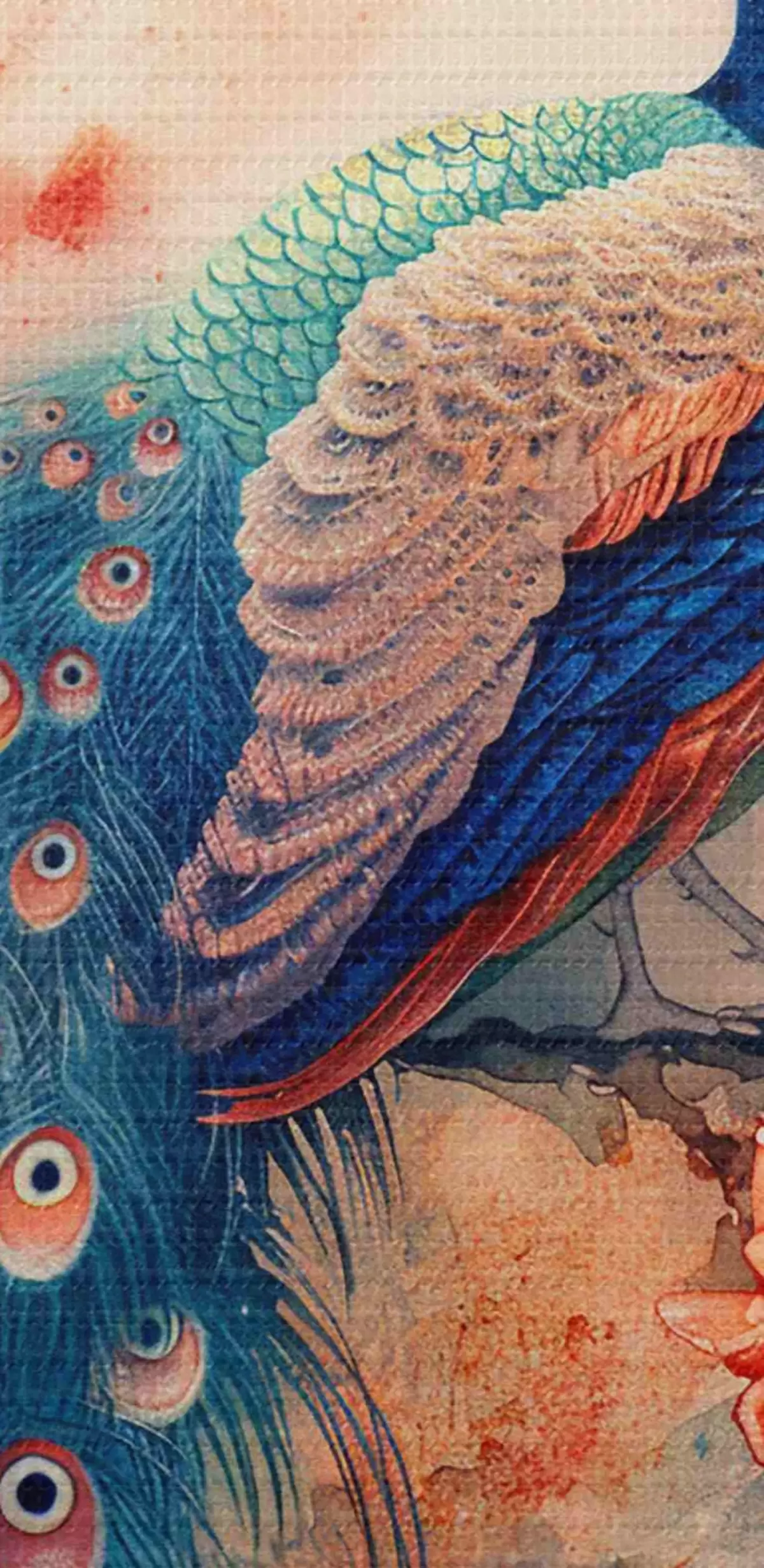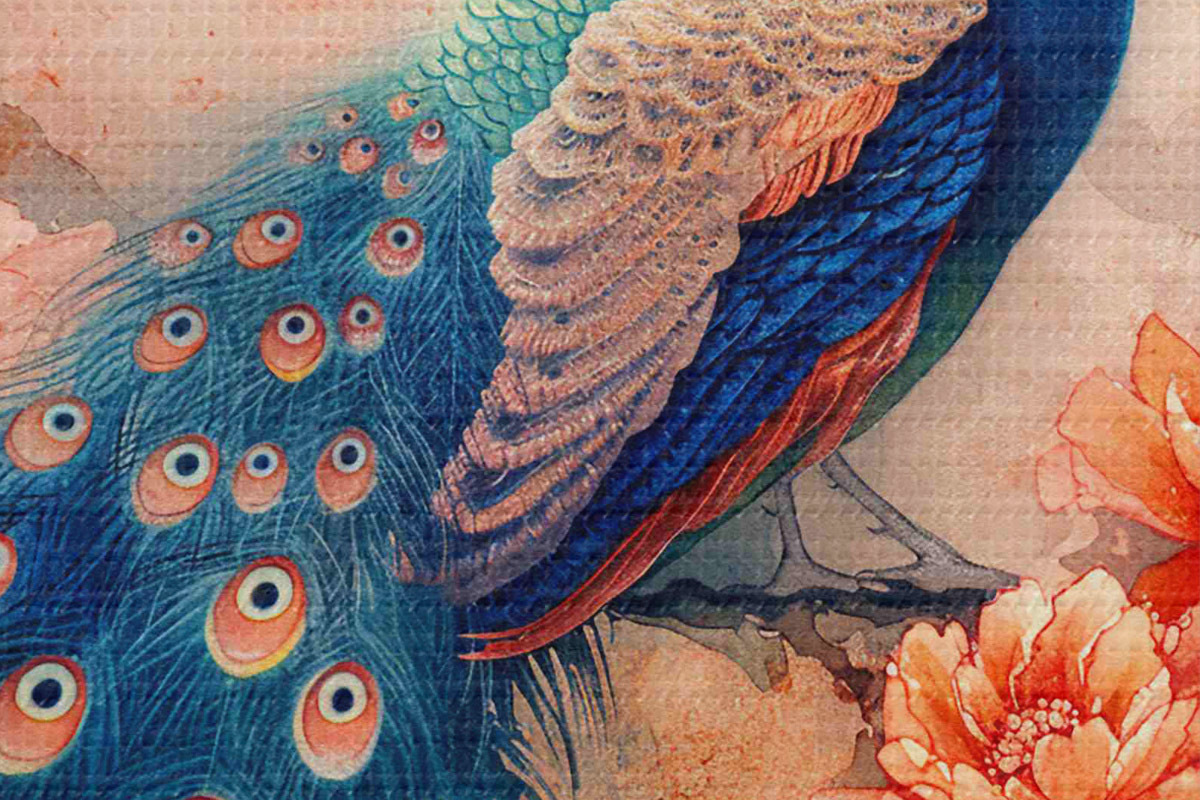 Image Peinture représentant un paon sur une branche avec des fleurs Nr r38455