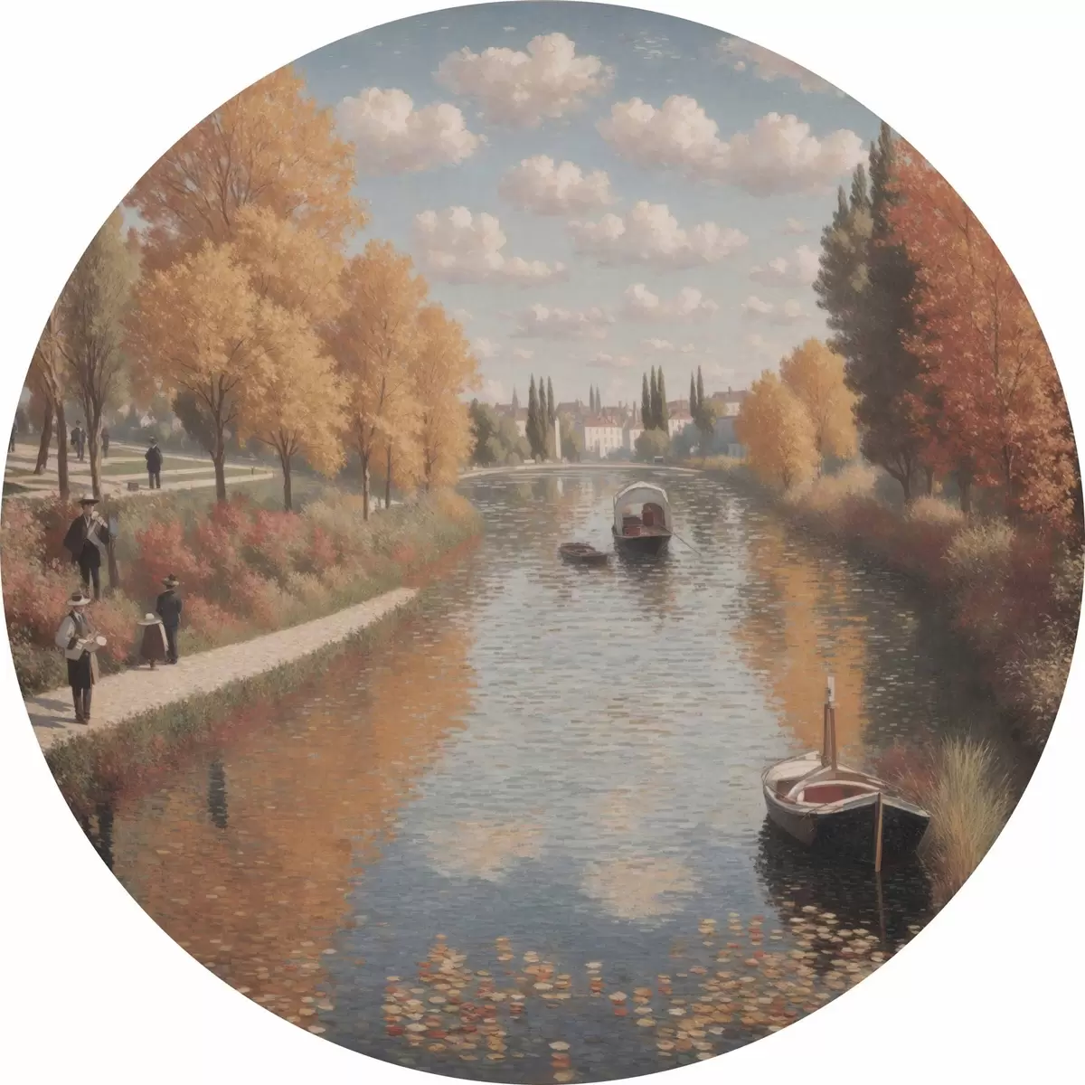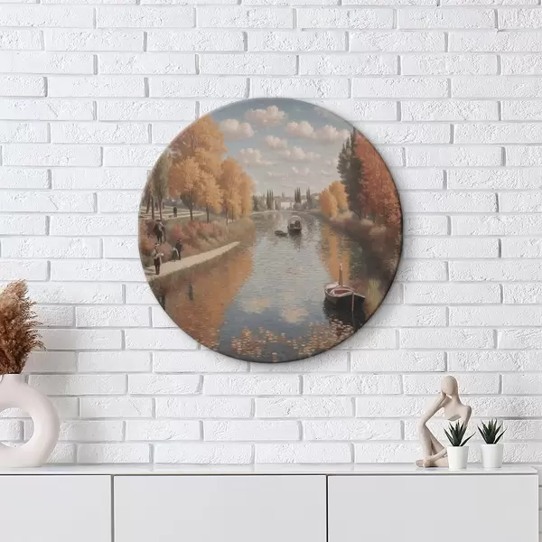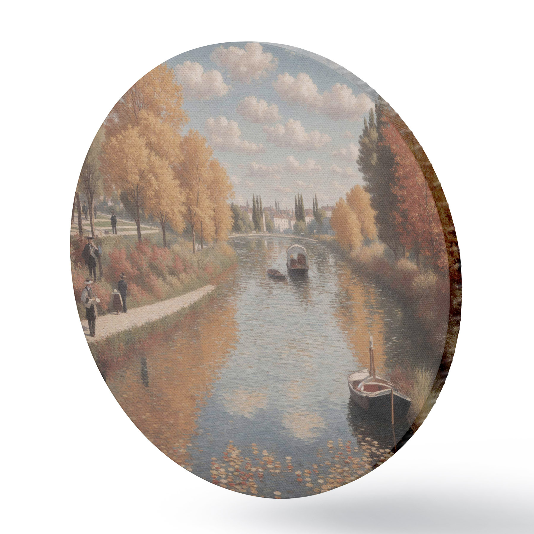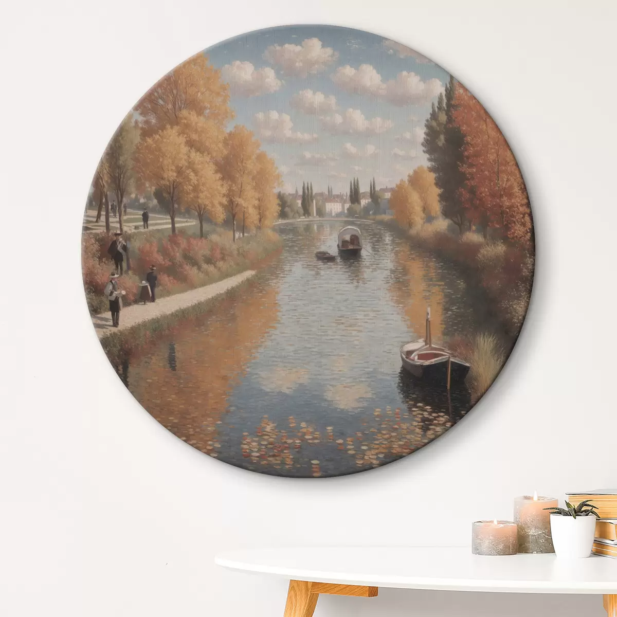 Tableaux ronds Peinture d'une rivière avec des bateaux et des gens r38598