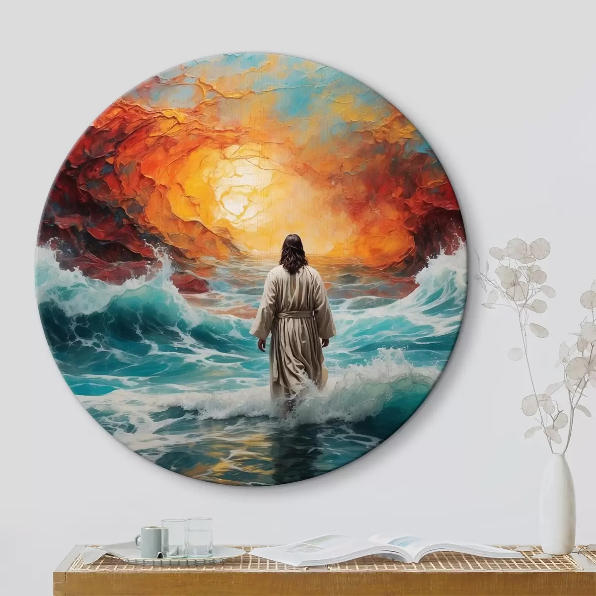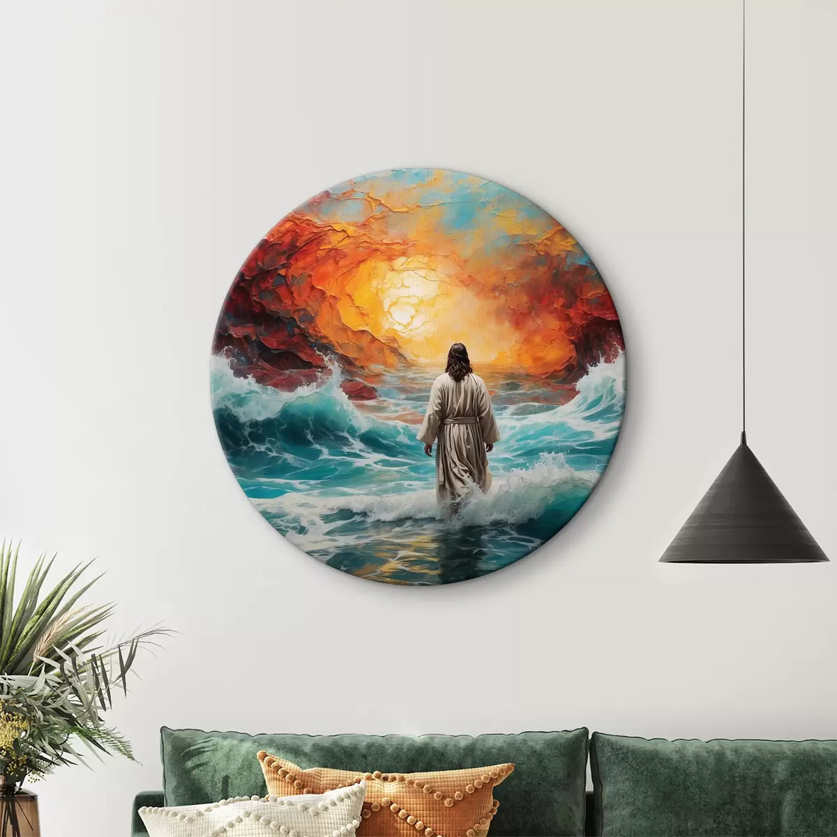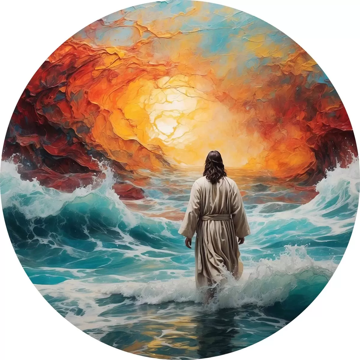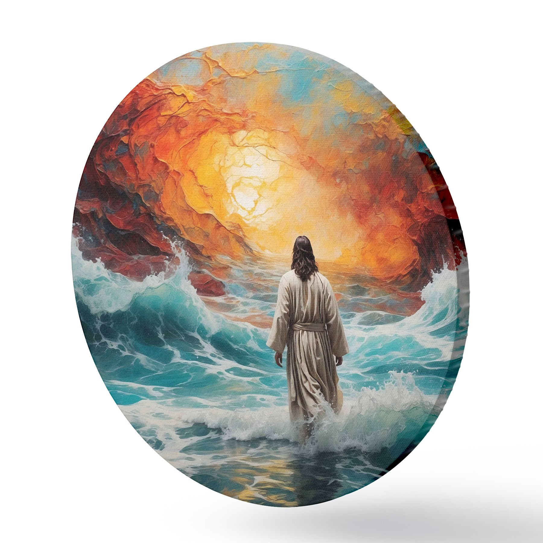 Tableaux ronds Un homme marche entre le ciel enflammé et la mer r38612