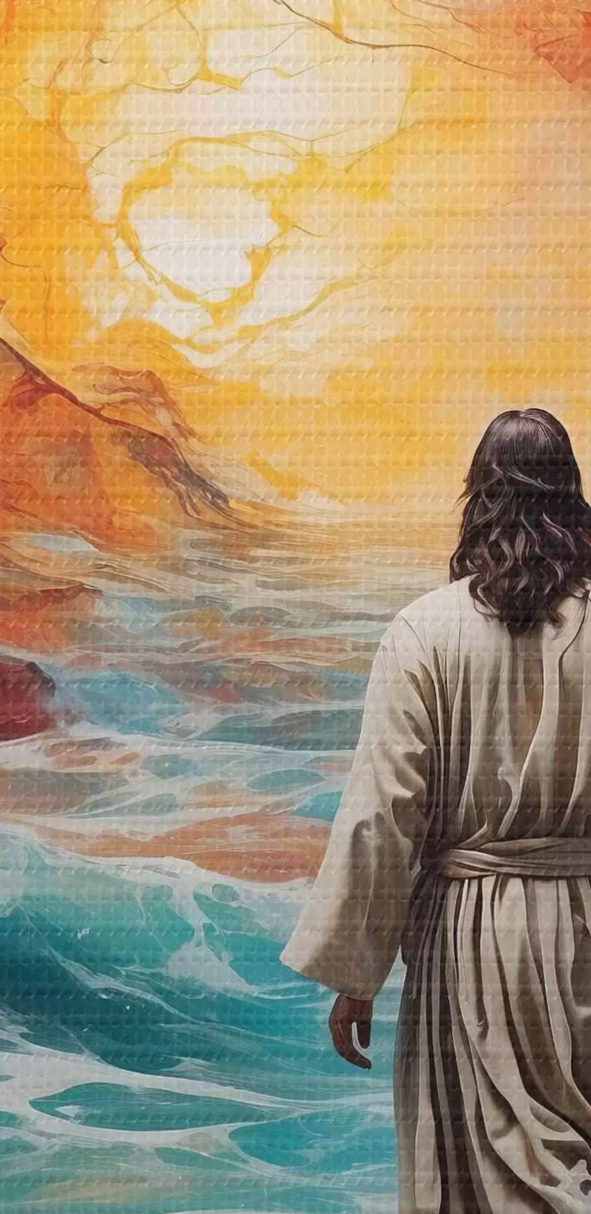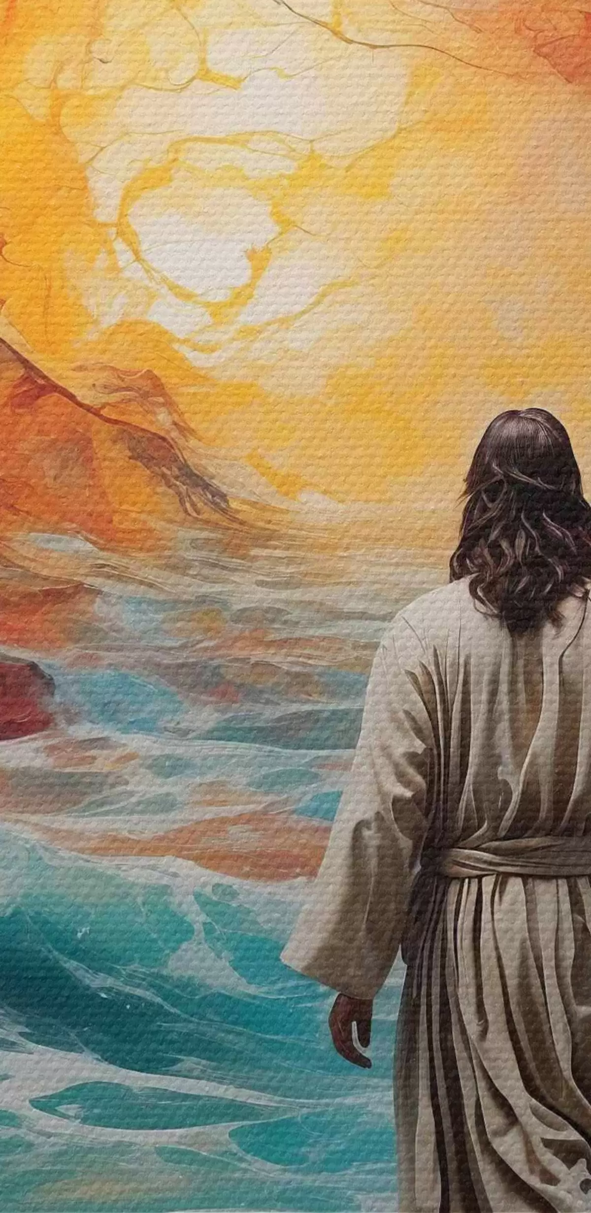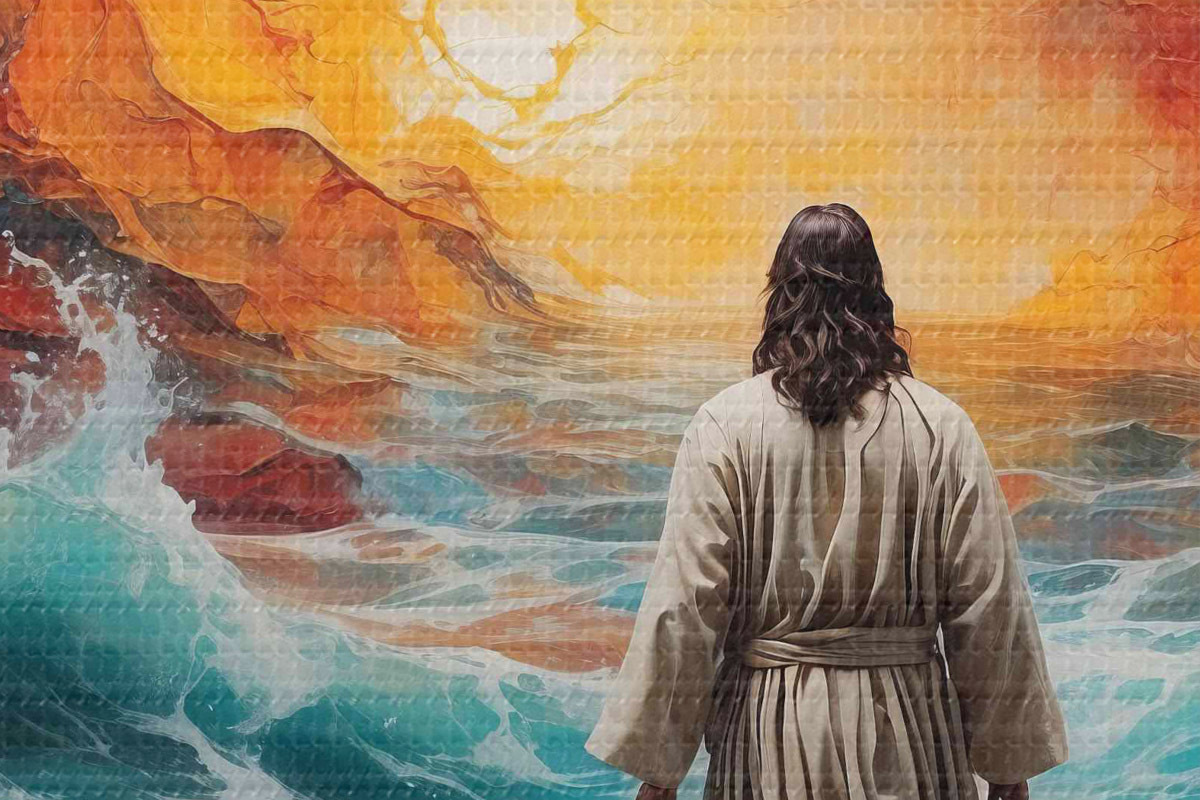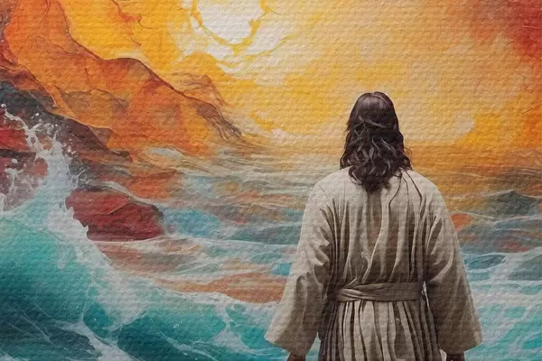 Image Un homme marche entre le ciel enflammé et la mer Nr r38612