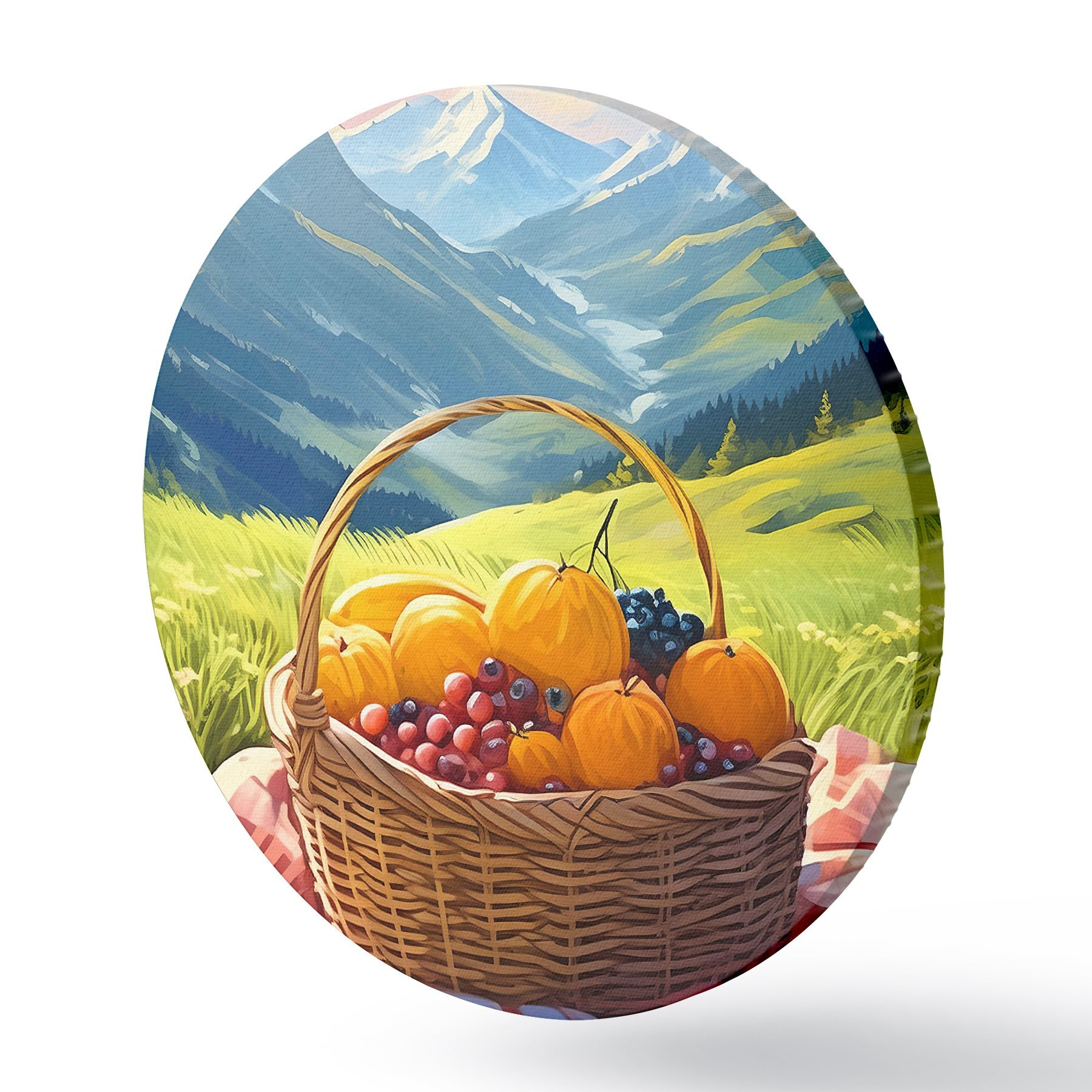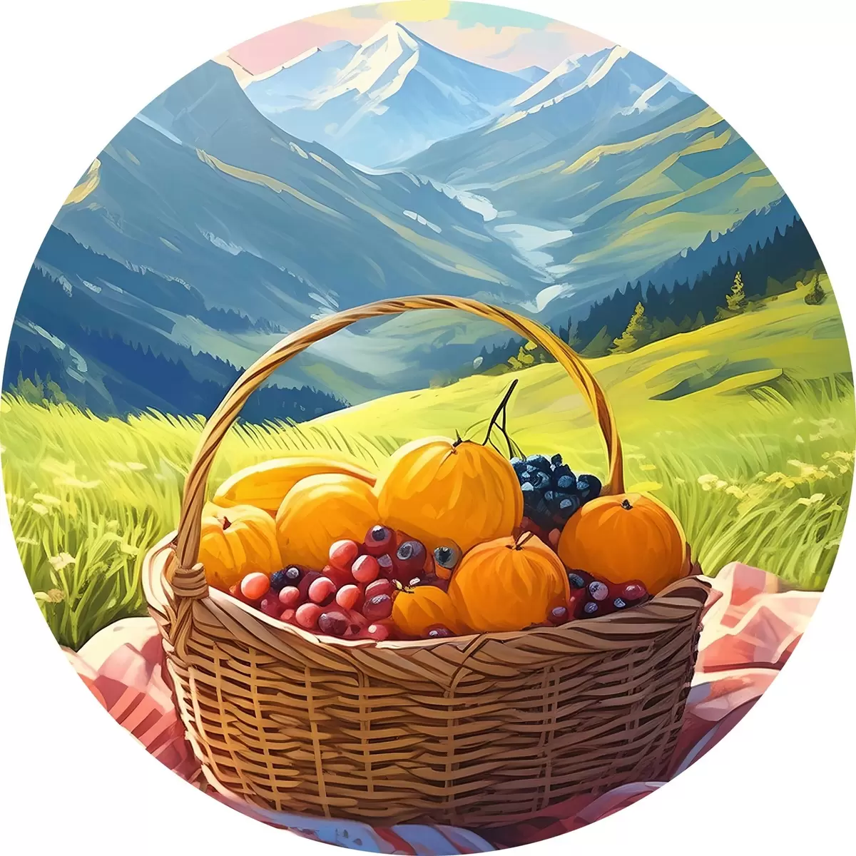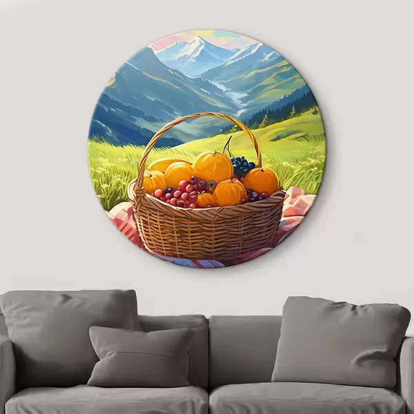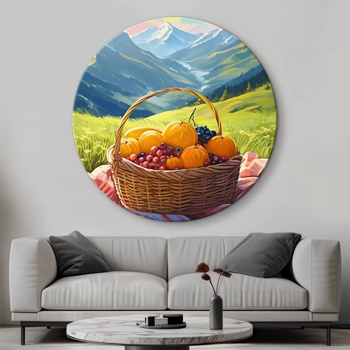 Tableaux ronds une corbeille de fruits sur un pré dans les montagnes r38654