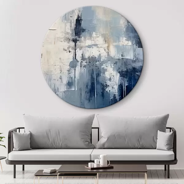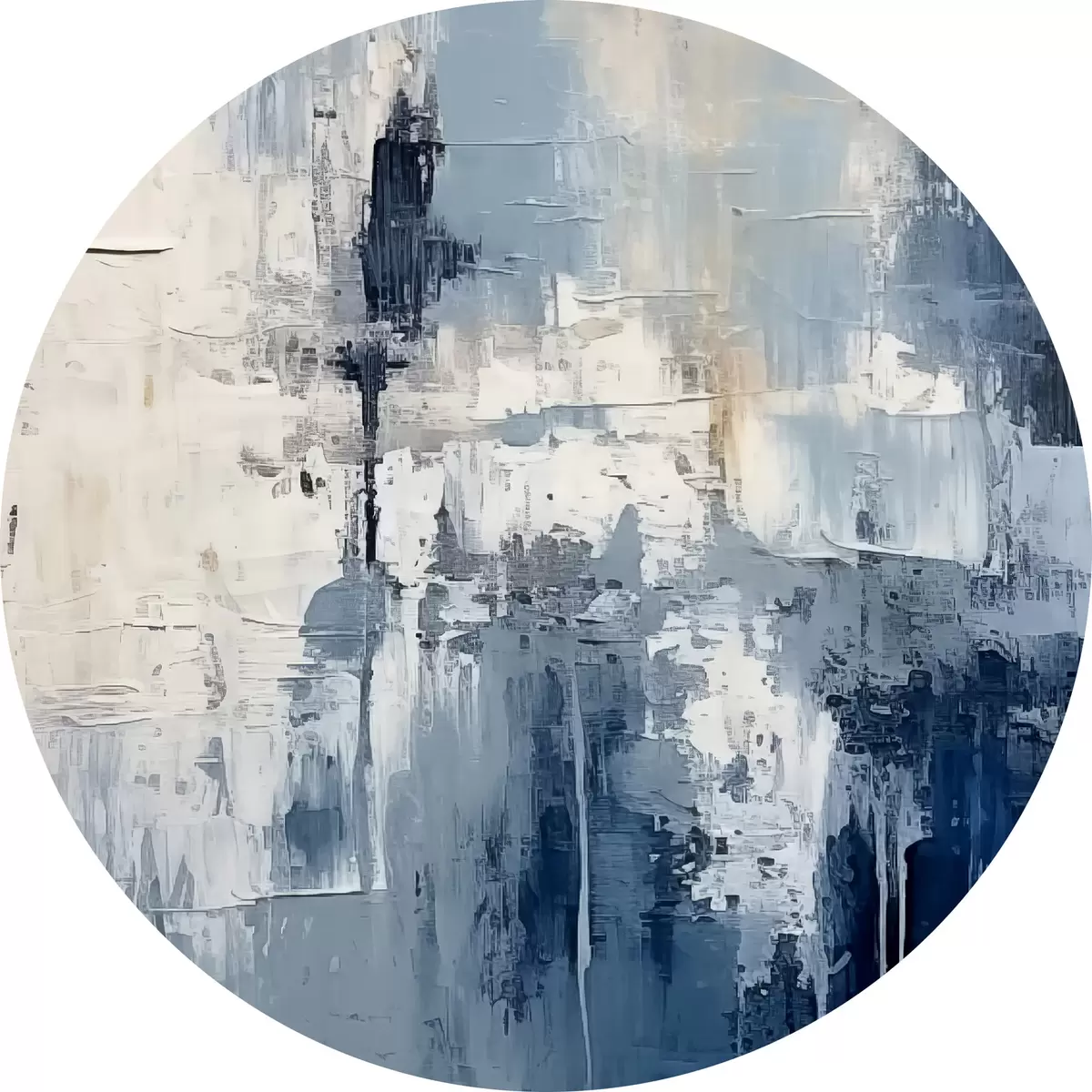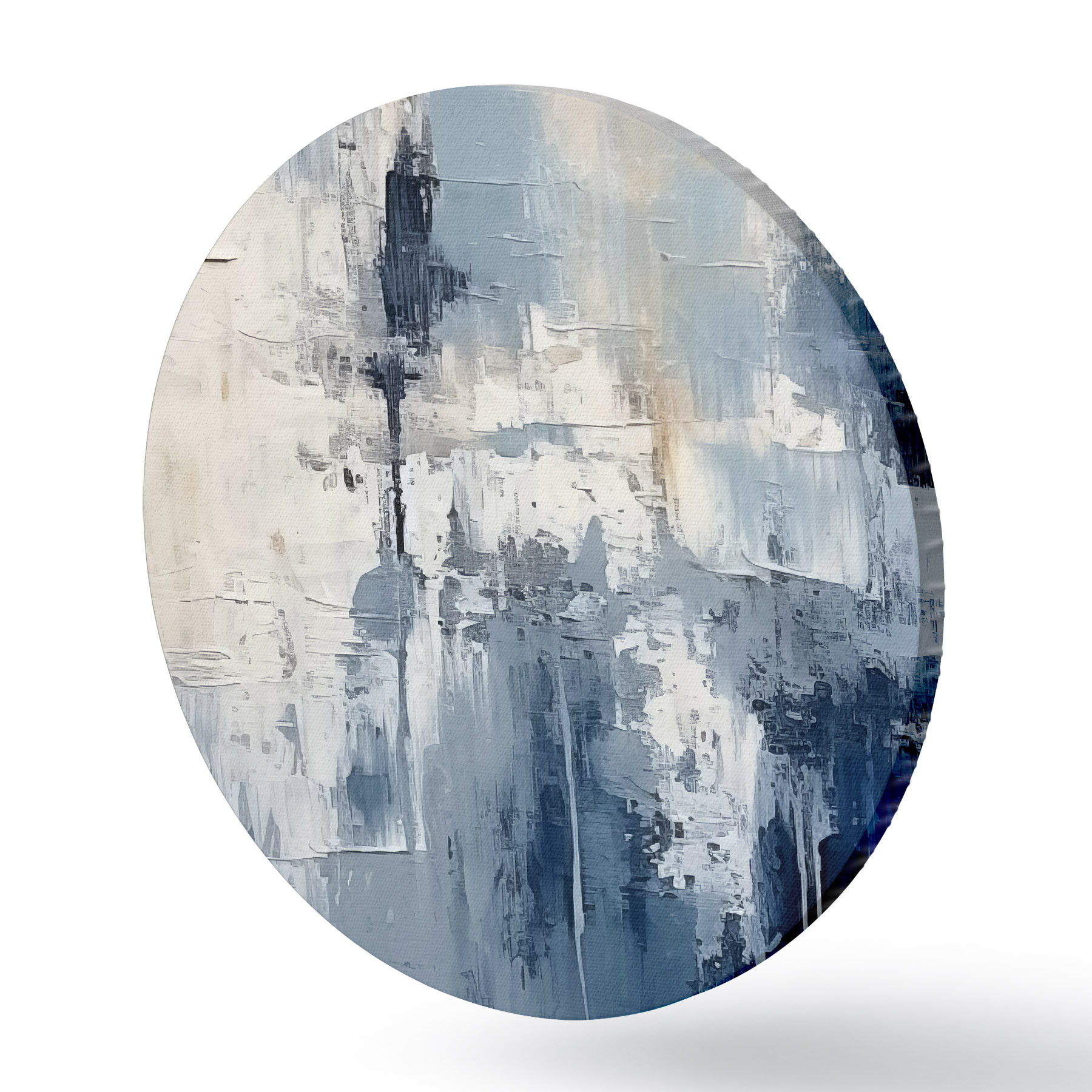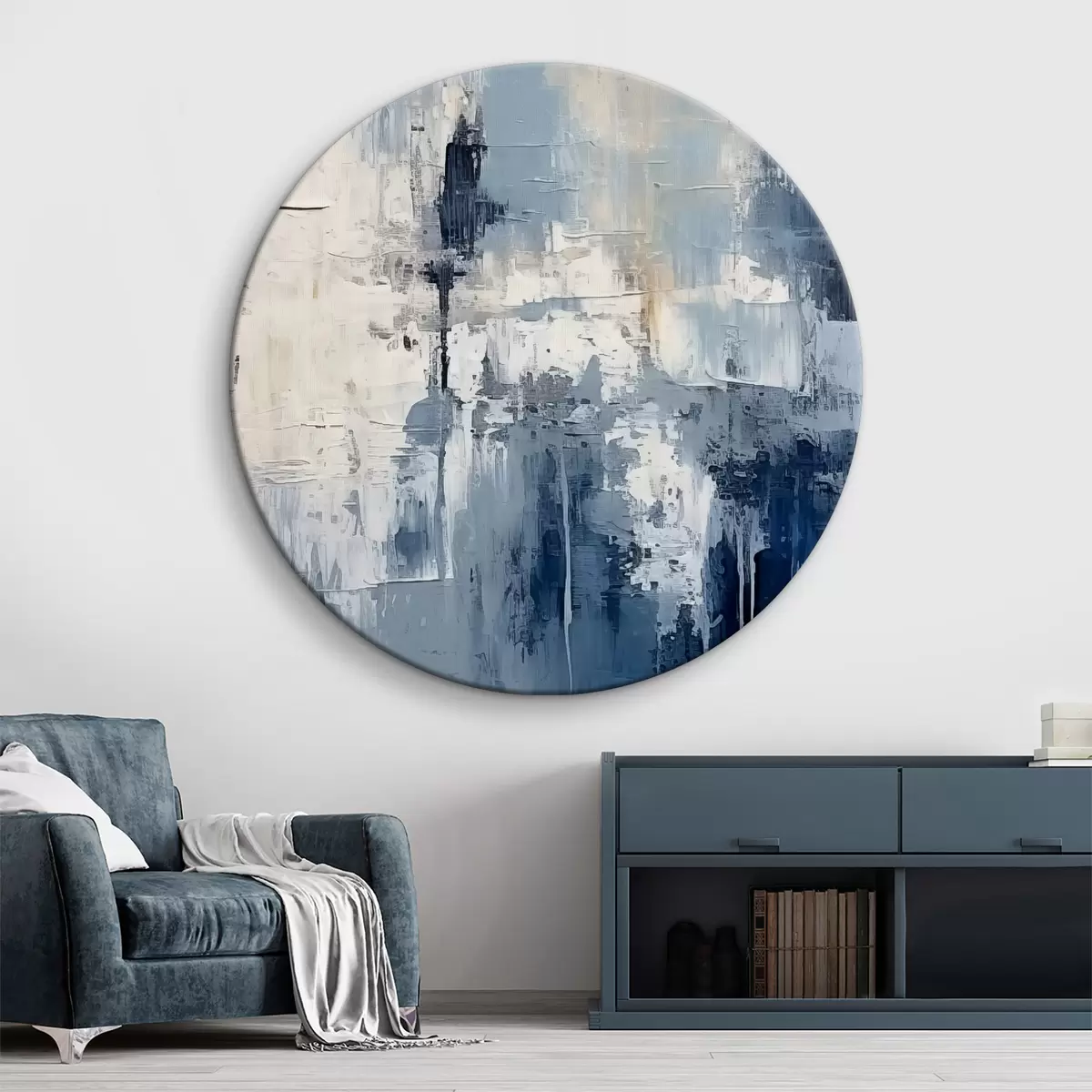 Tableaux ronds Peinture à l'huile abstraite minimaliste, frottée, géométrique, tache, couleur bleu et blanc r38906