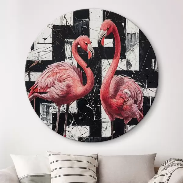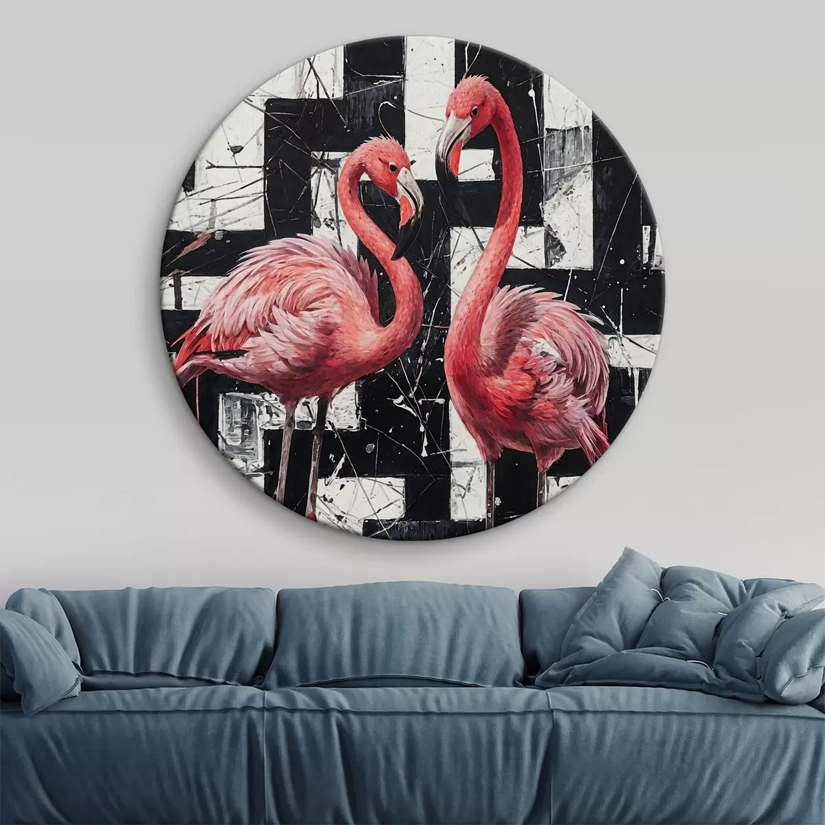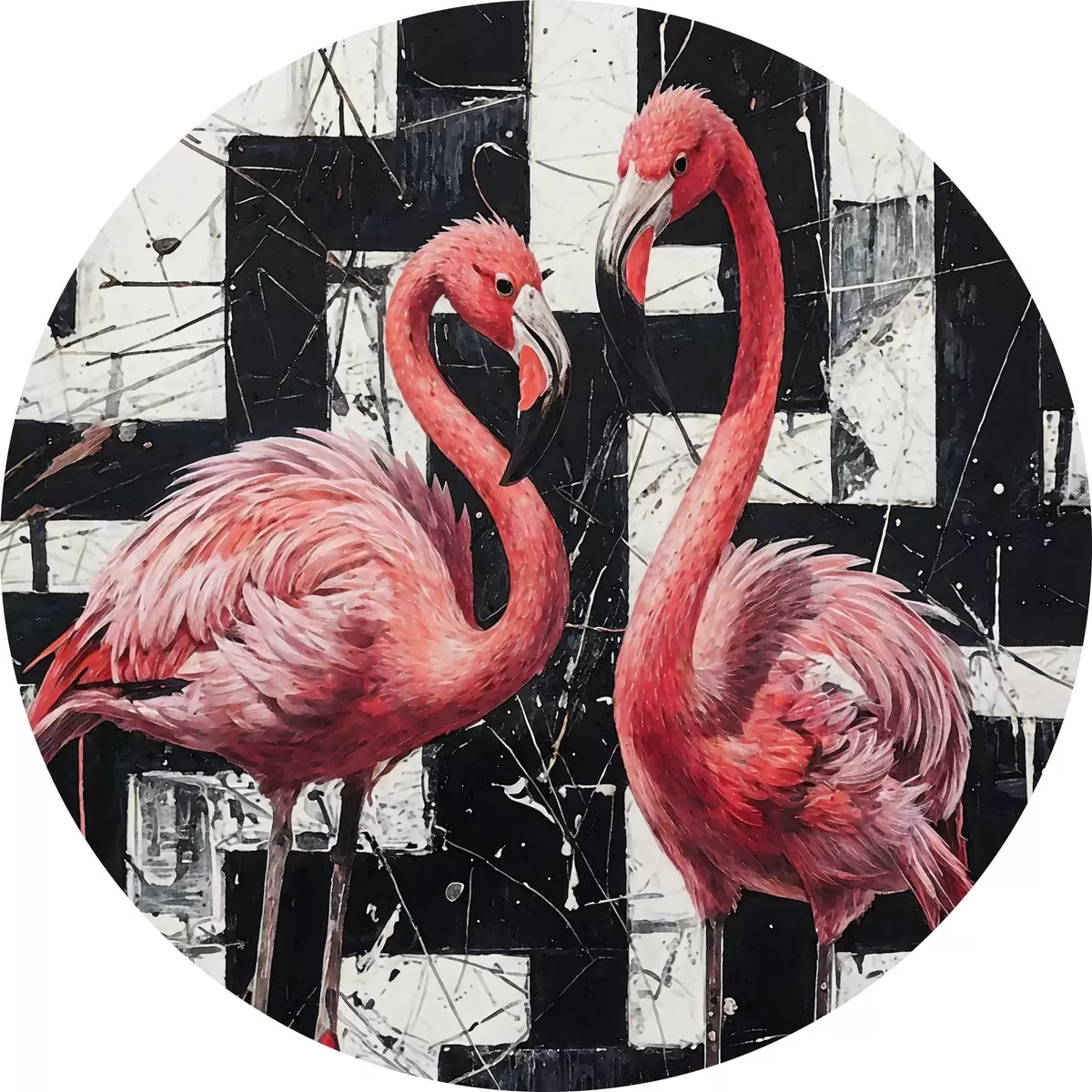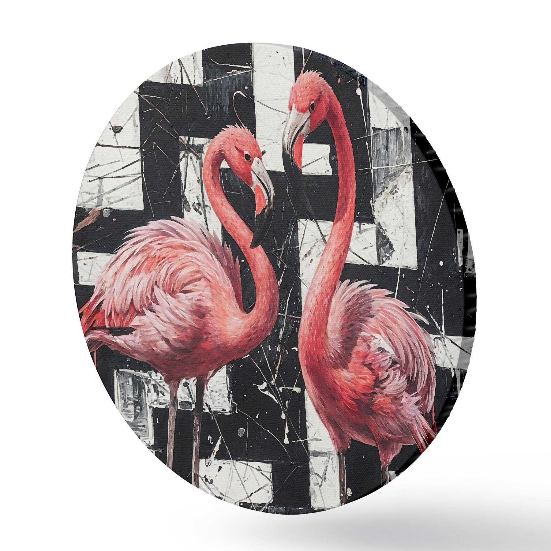 Tableaux ronds Deux flamants roses debout devant une peinture d'art de fond abstrait noir et blanc r38954