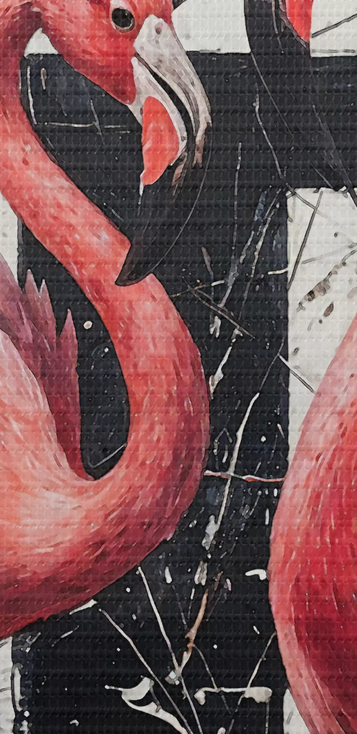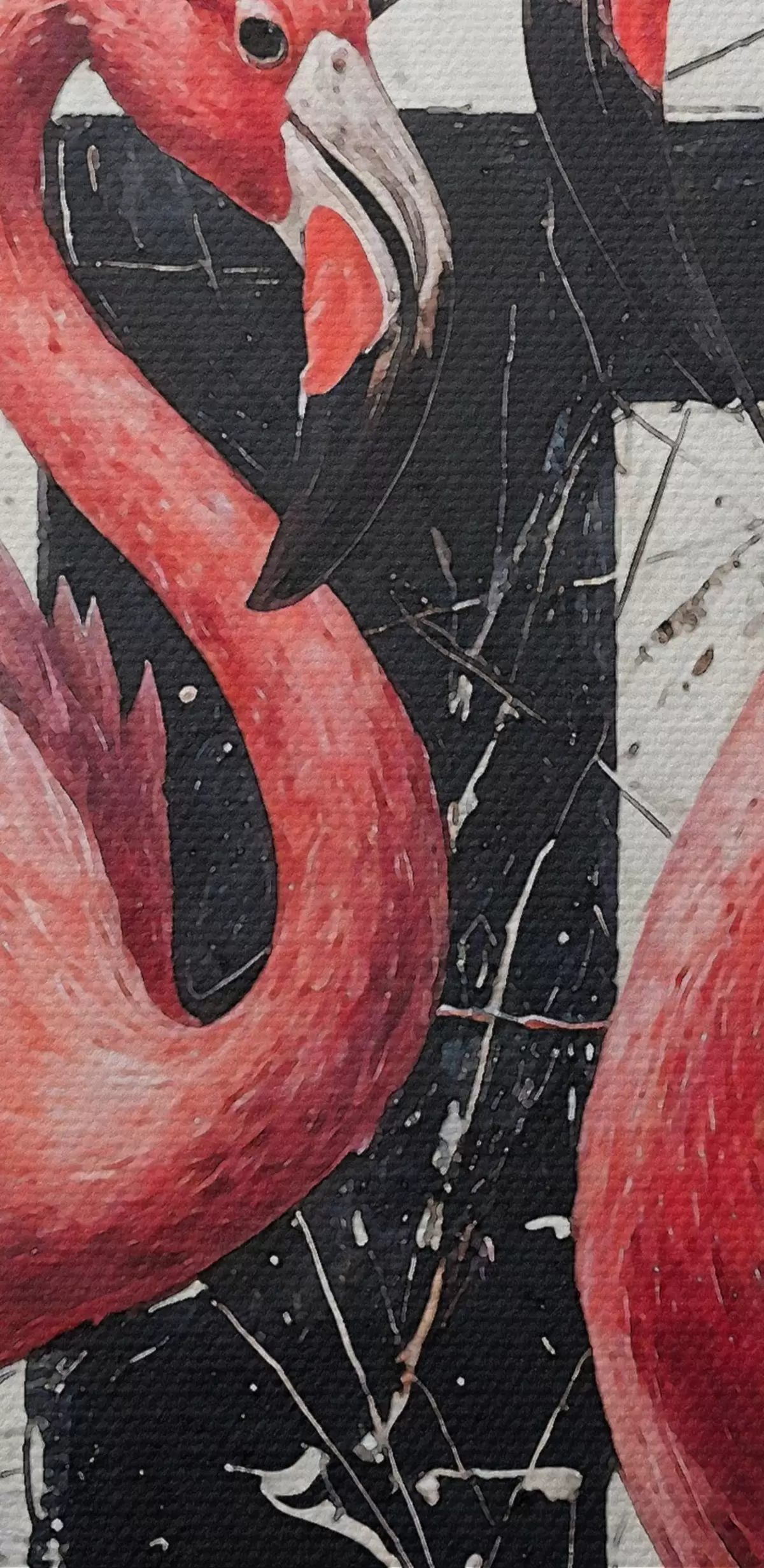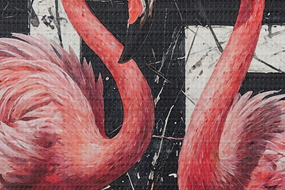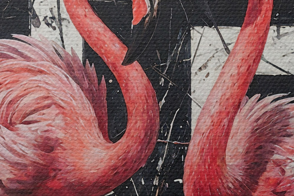 Image Deux flamants roses debout devant une peinture d'art de fond abstrait noir et blanc Nr r38954