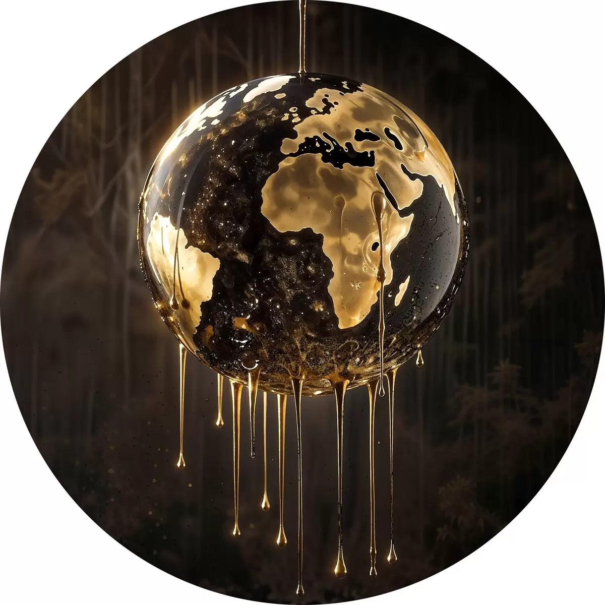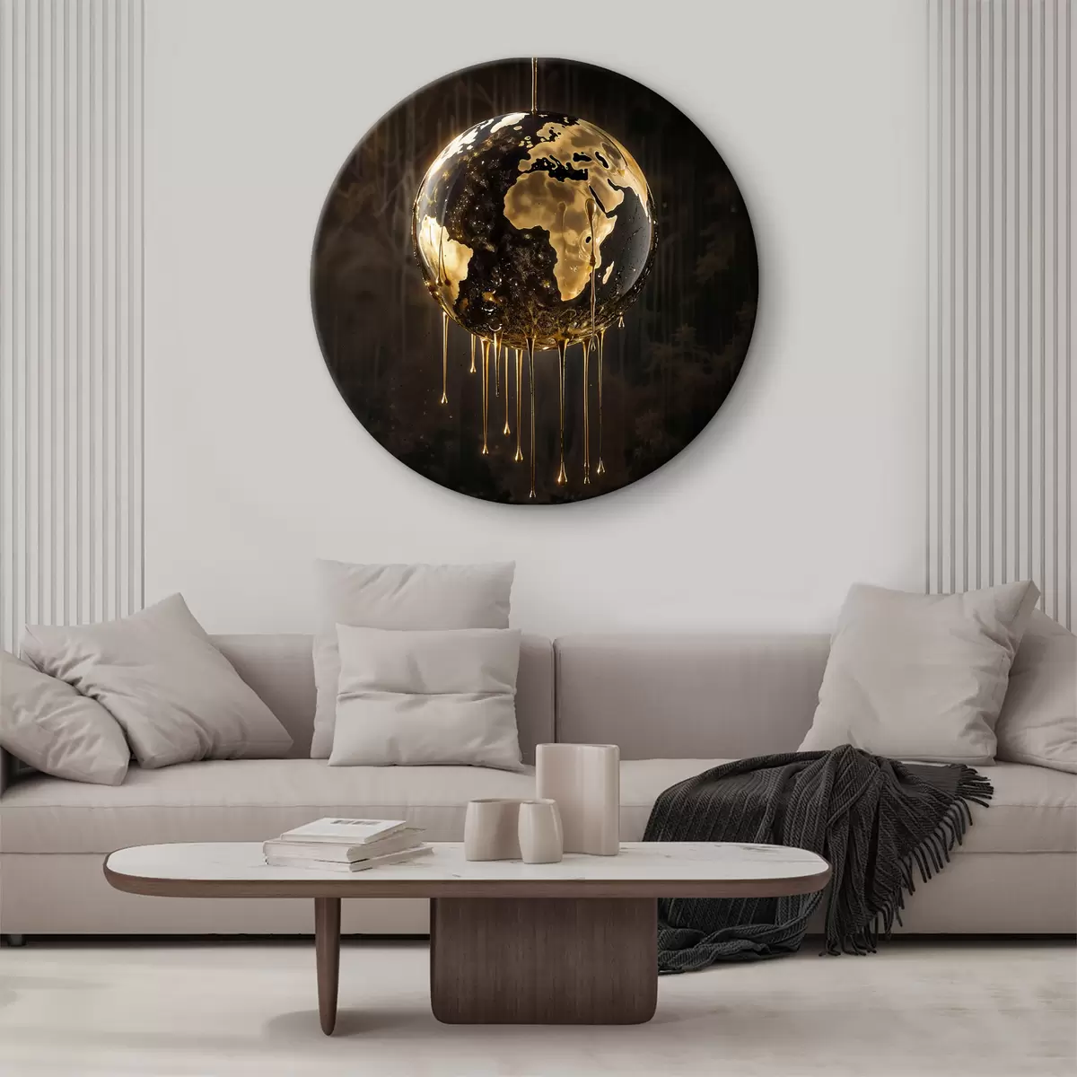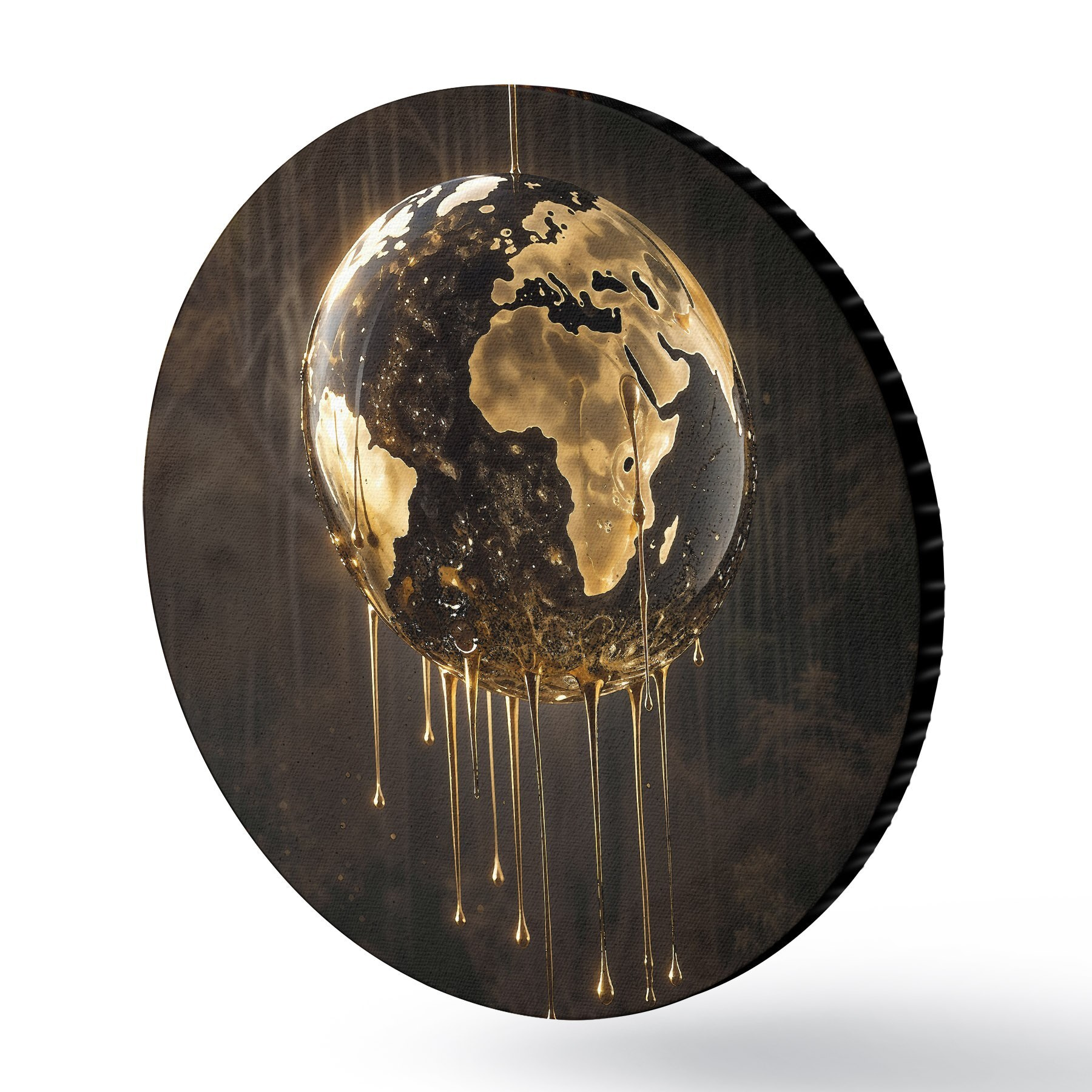 Tableaux ronds Un globe lumineux représentant la Terre entourée d'un liquide qui coule sur un fond sombre r38983