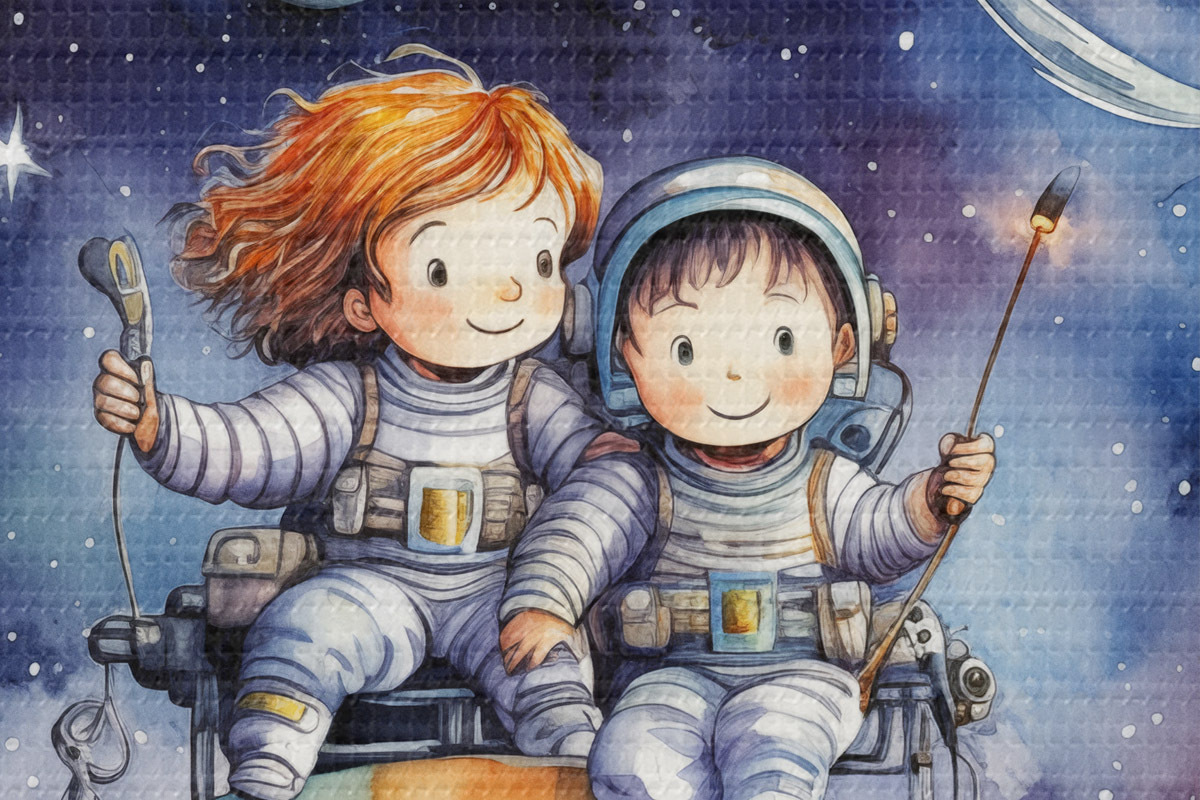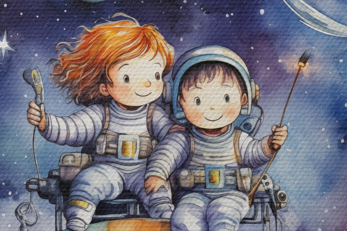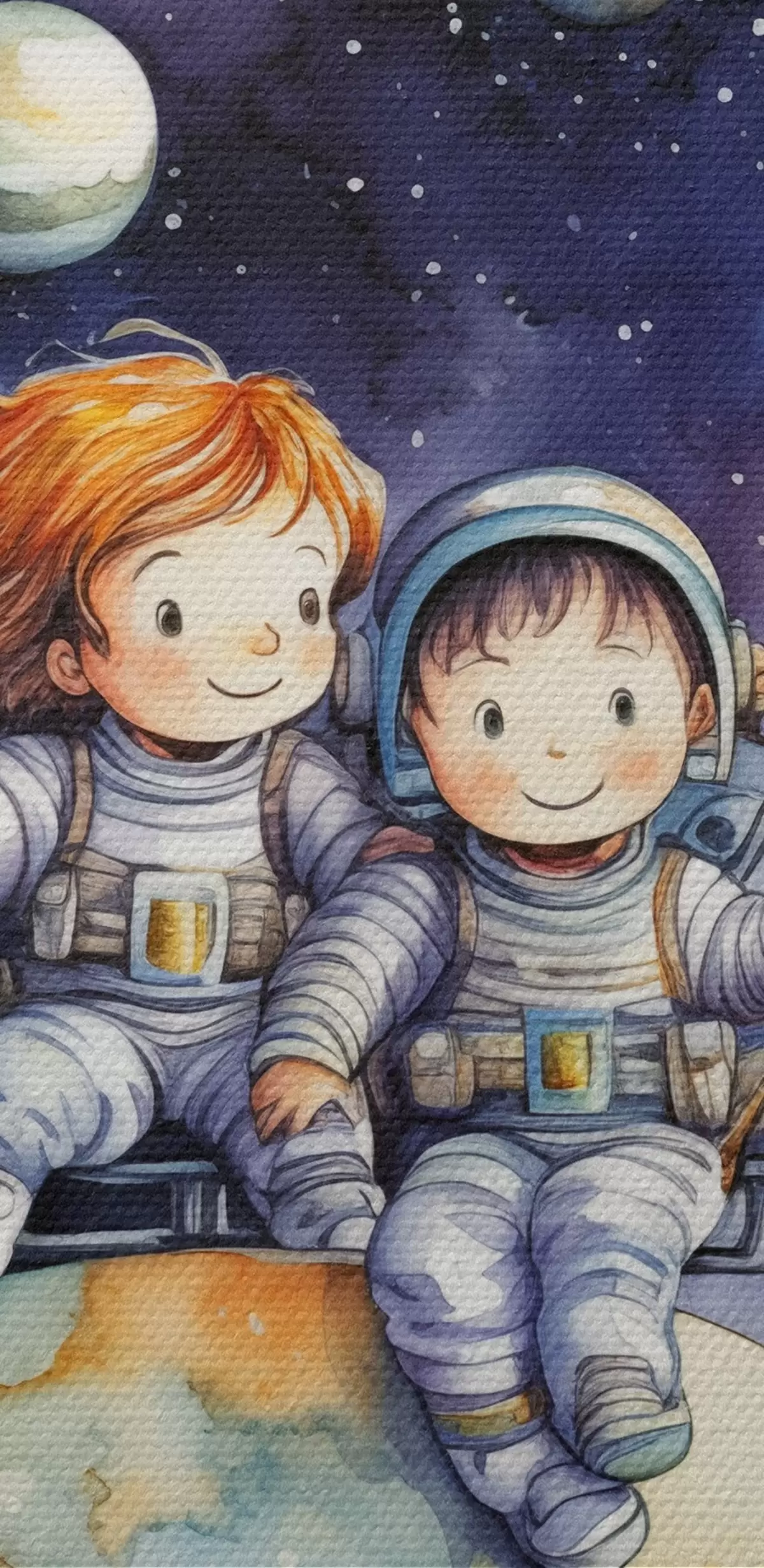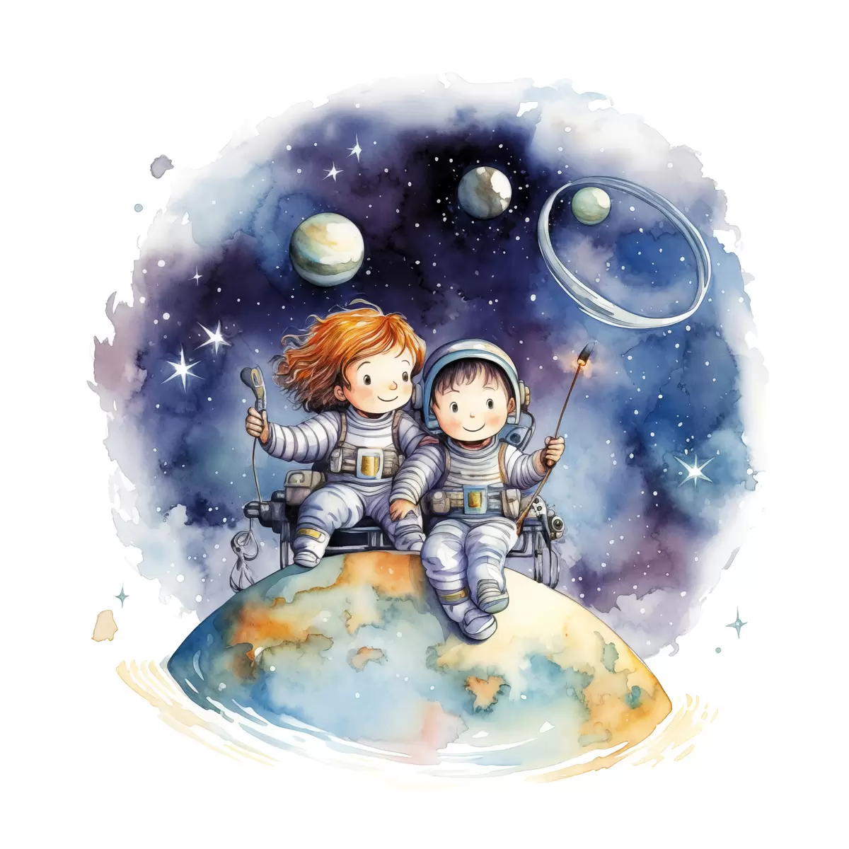 Image Enfants en combinaison spatiale assis sur une planète dans l'illustration aquarelle pour enfants de l'espace Nr r39117