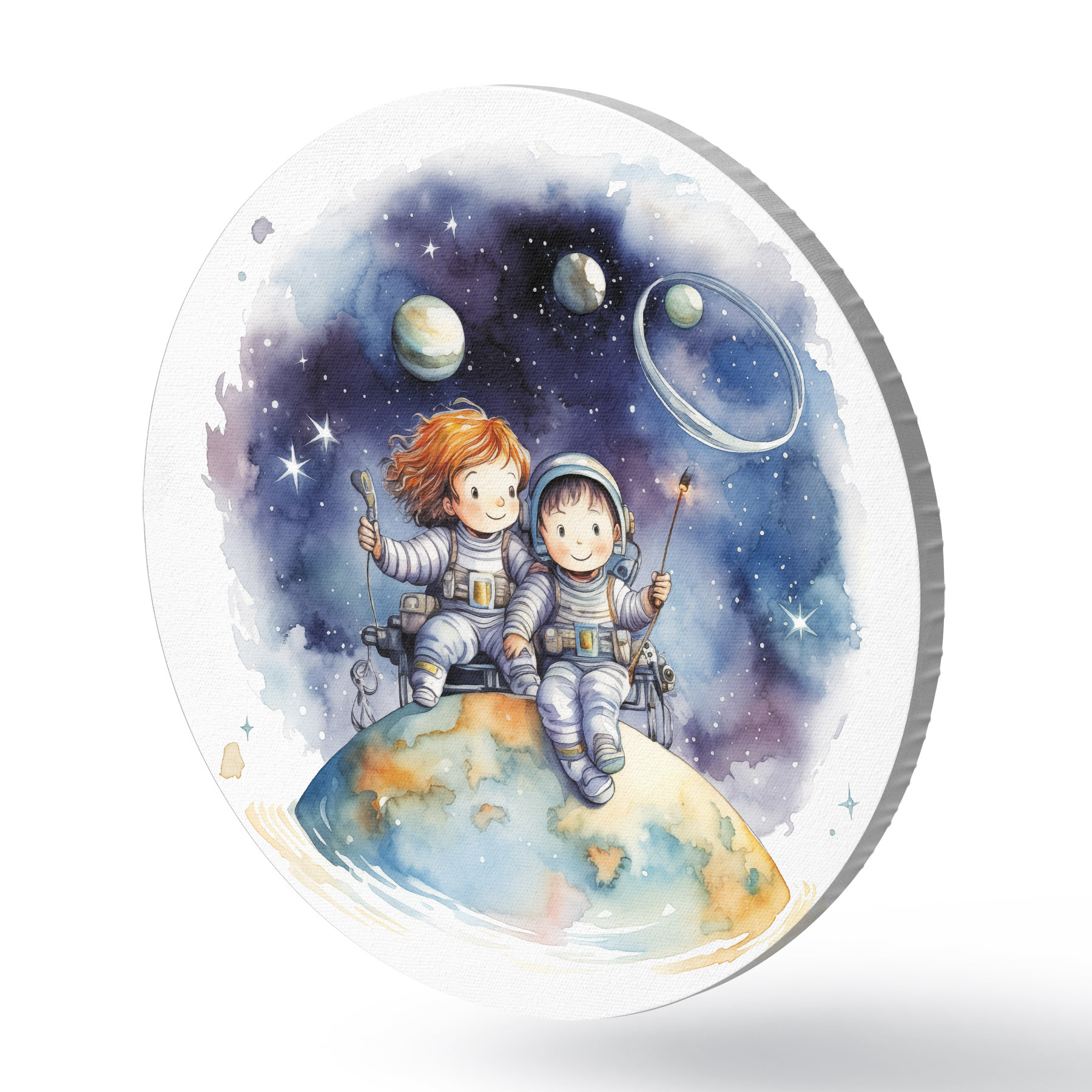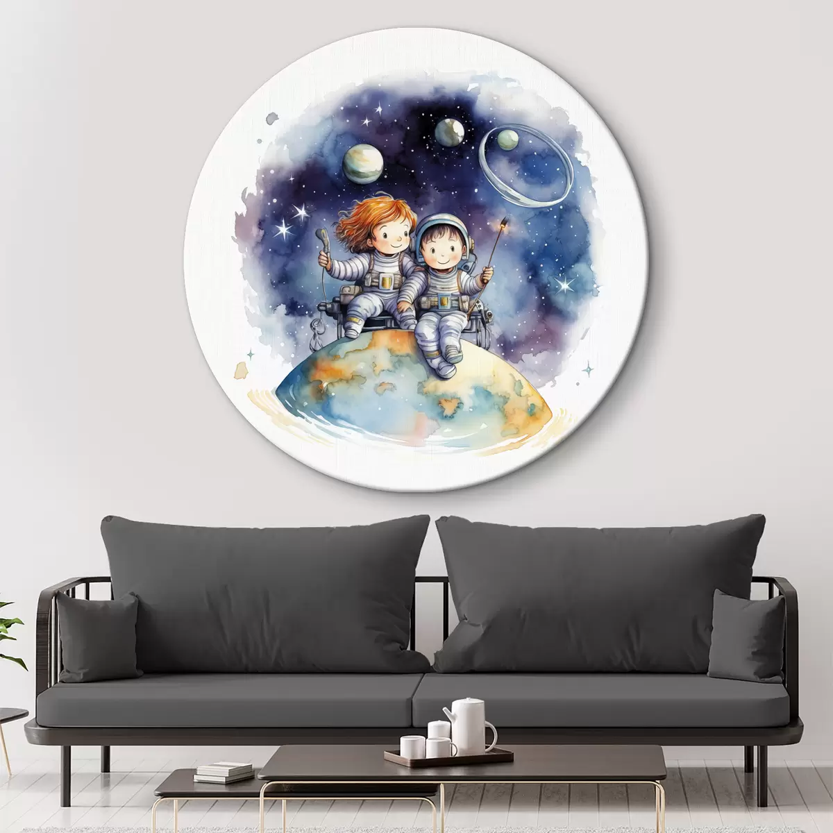 Tableaux ronds Enfants en combinaison spatiale assis sur une planète dans l'illustration aquarelle pour enfants de l'espace r39117