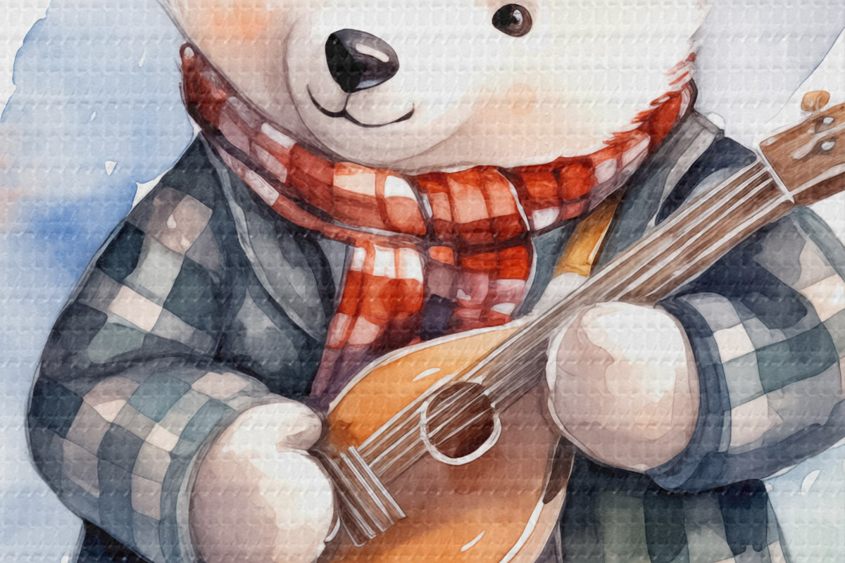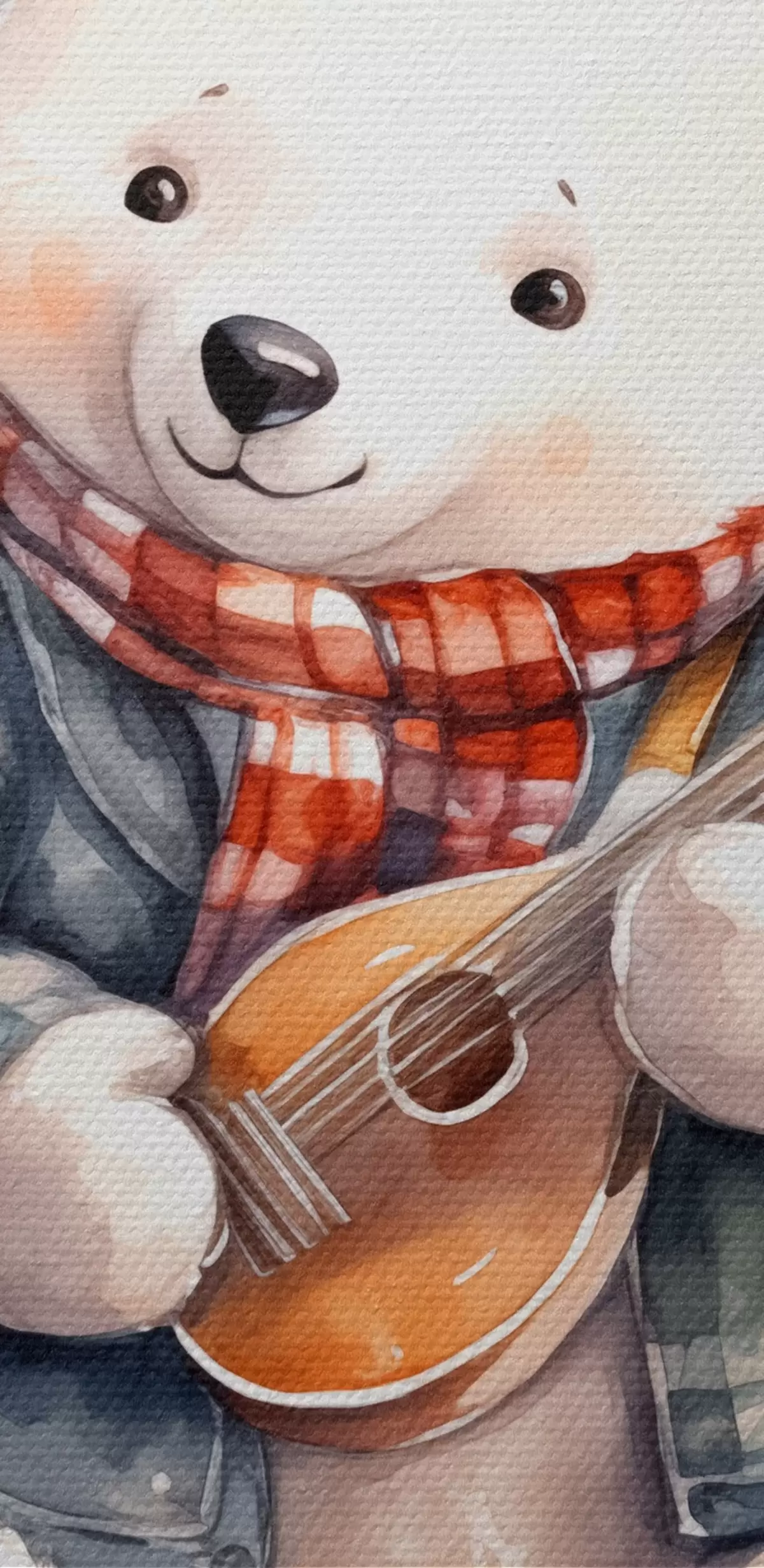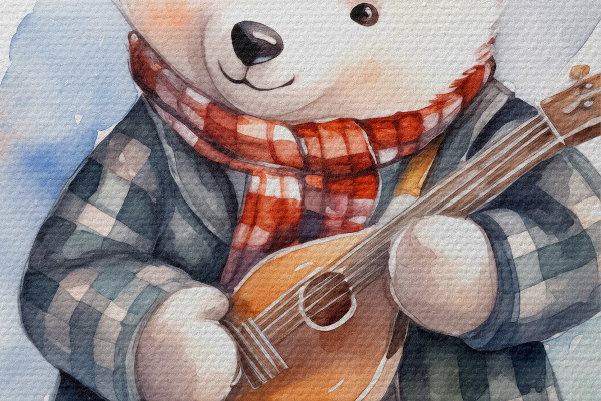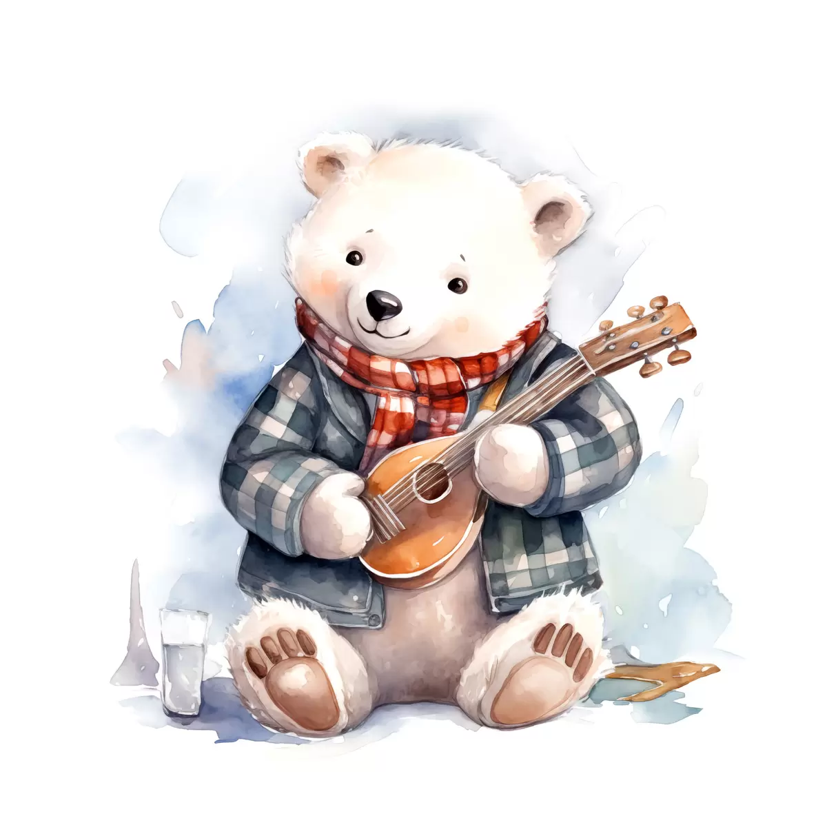 Image Musicien d'ours polaire dans un costume à carreaux bleu et une écharpe rouge joue de la guitare illustration aquarelle pour enfants Nr r39120