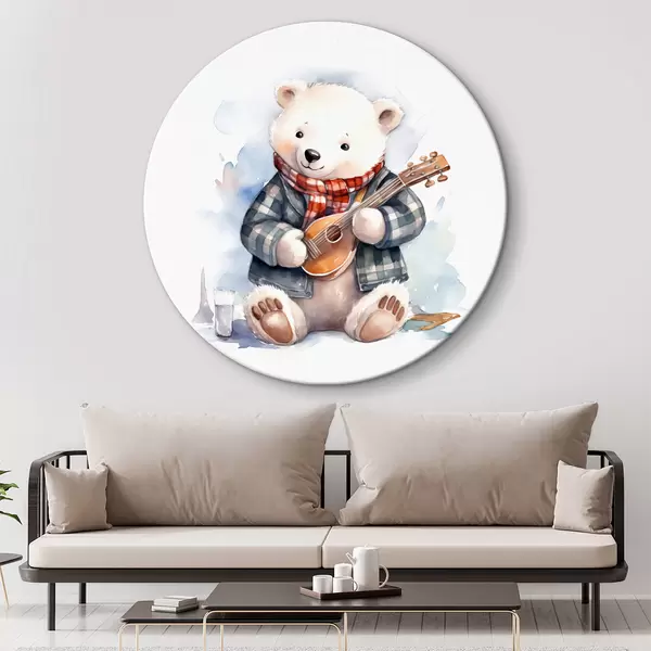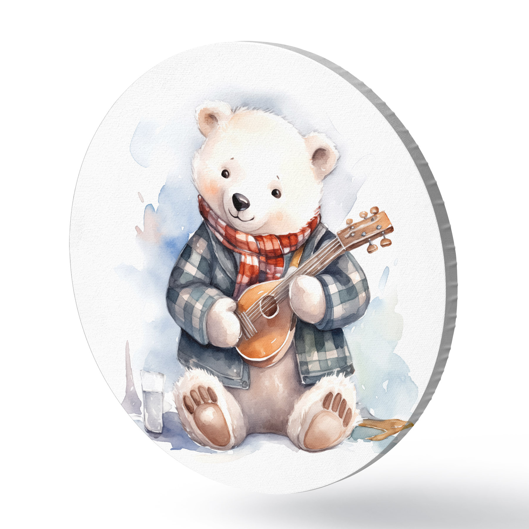 Tableaux ronds Musicien d'ours polaire dans un costume à carreaux bleu et une écharpe rouge joue de la guitare illustration aquarelle pour enfants r39120