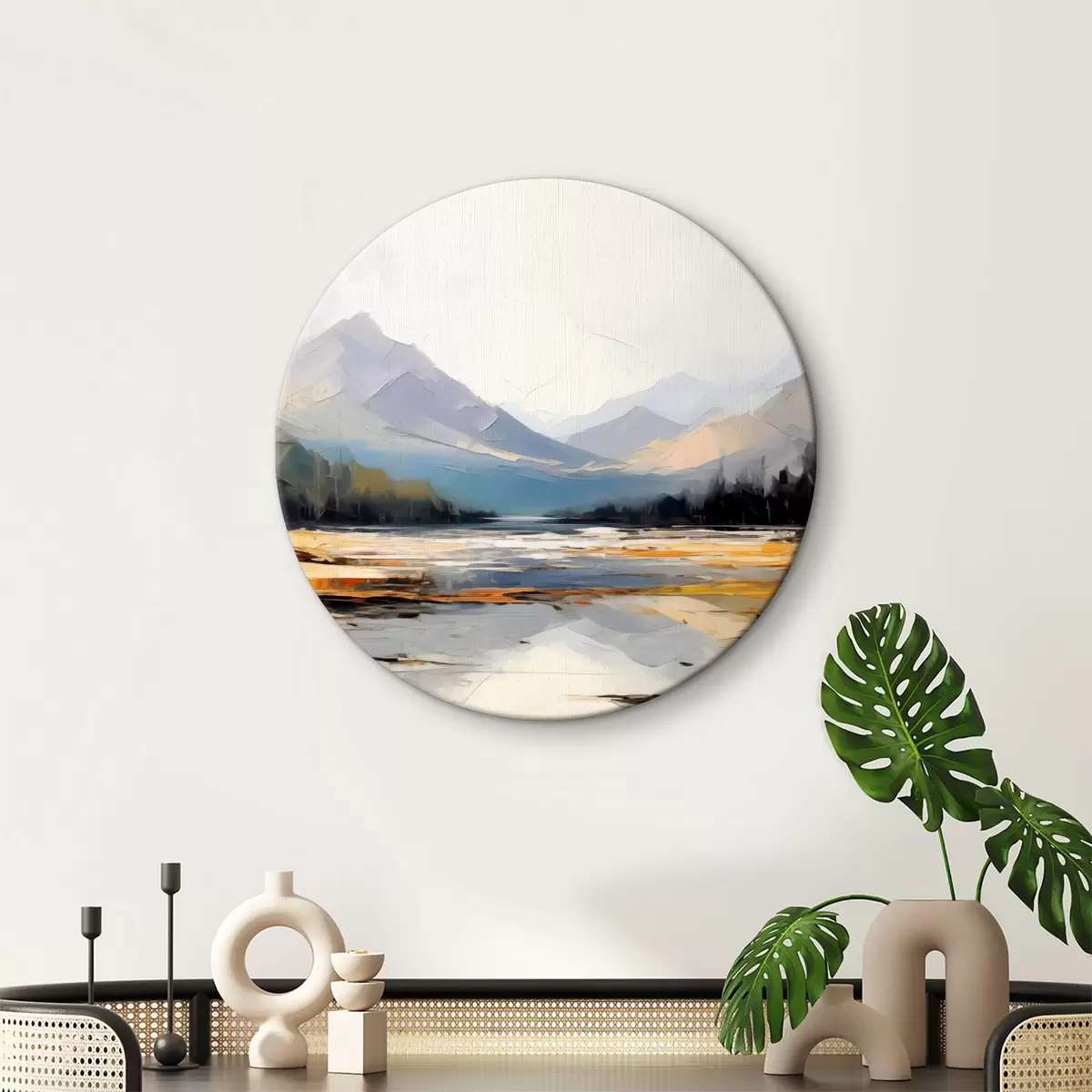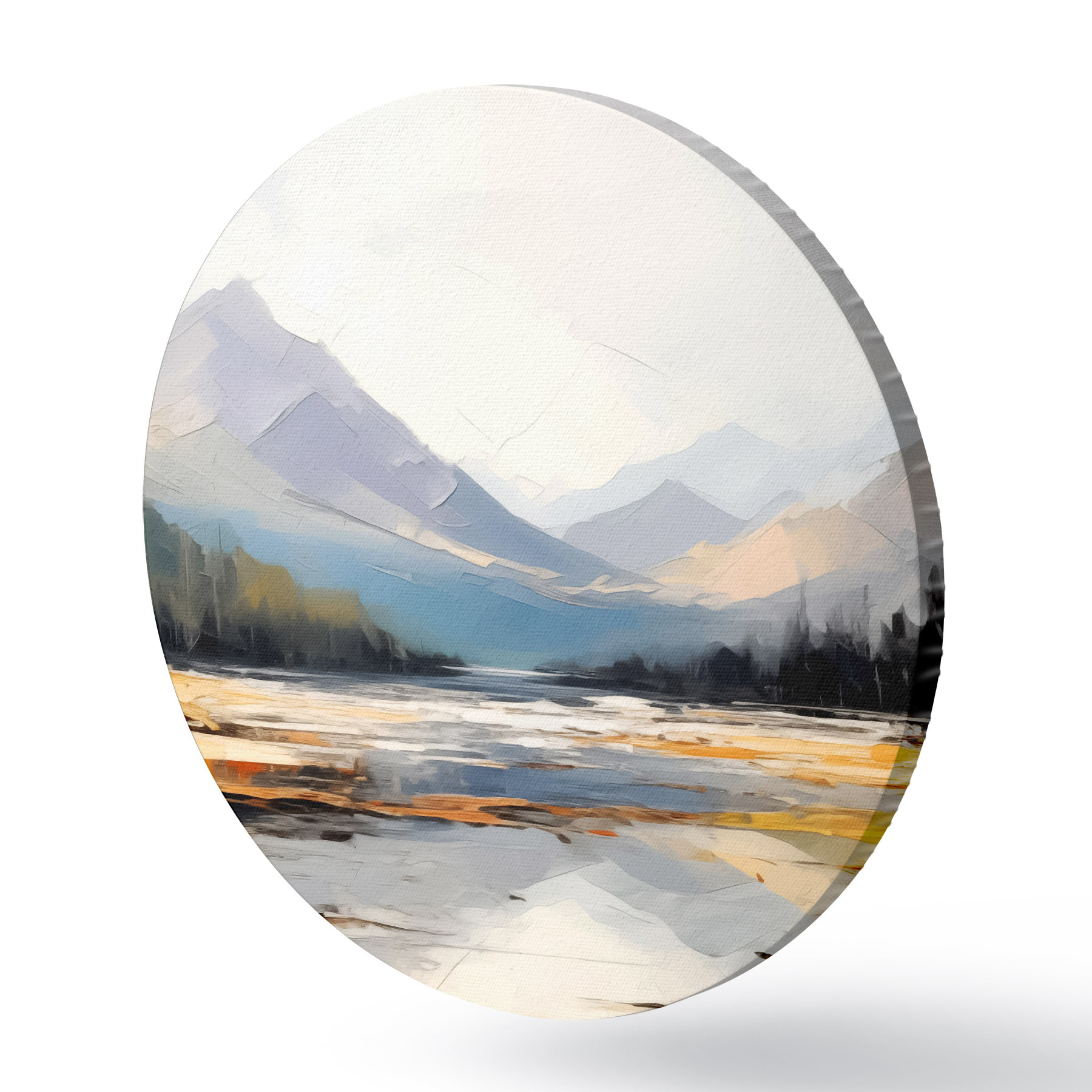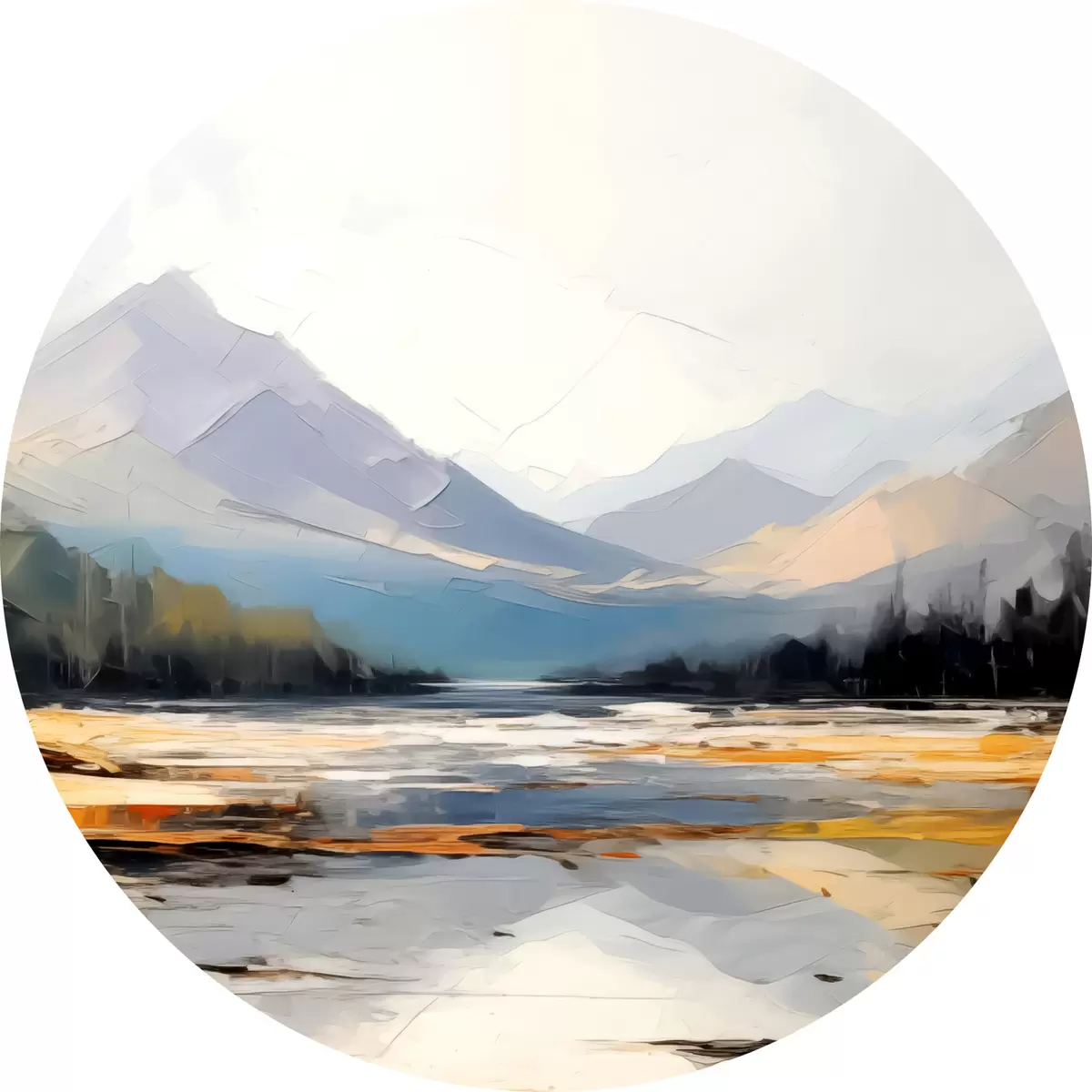 Tableaux ronds Chaînes de montagnes dans la peinture à l'huile de la vallée, paysage, nature, bleu, couleur jaune blanc r39128
