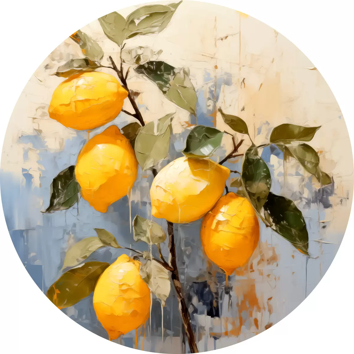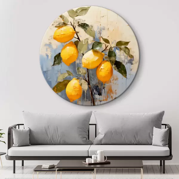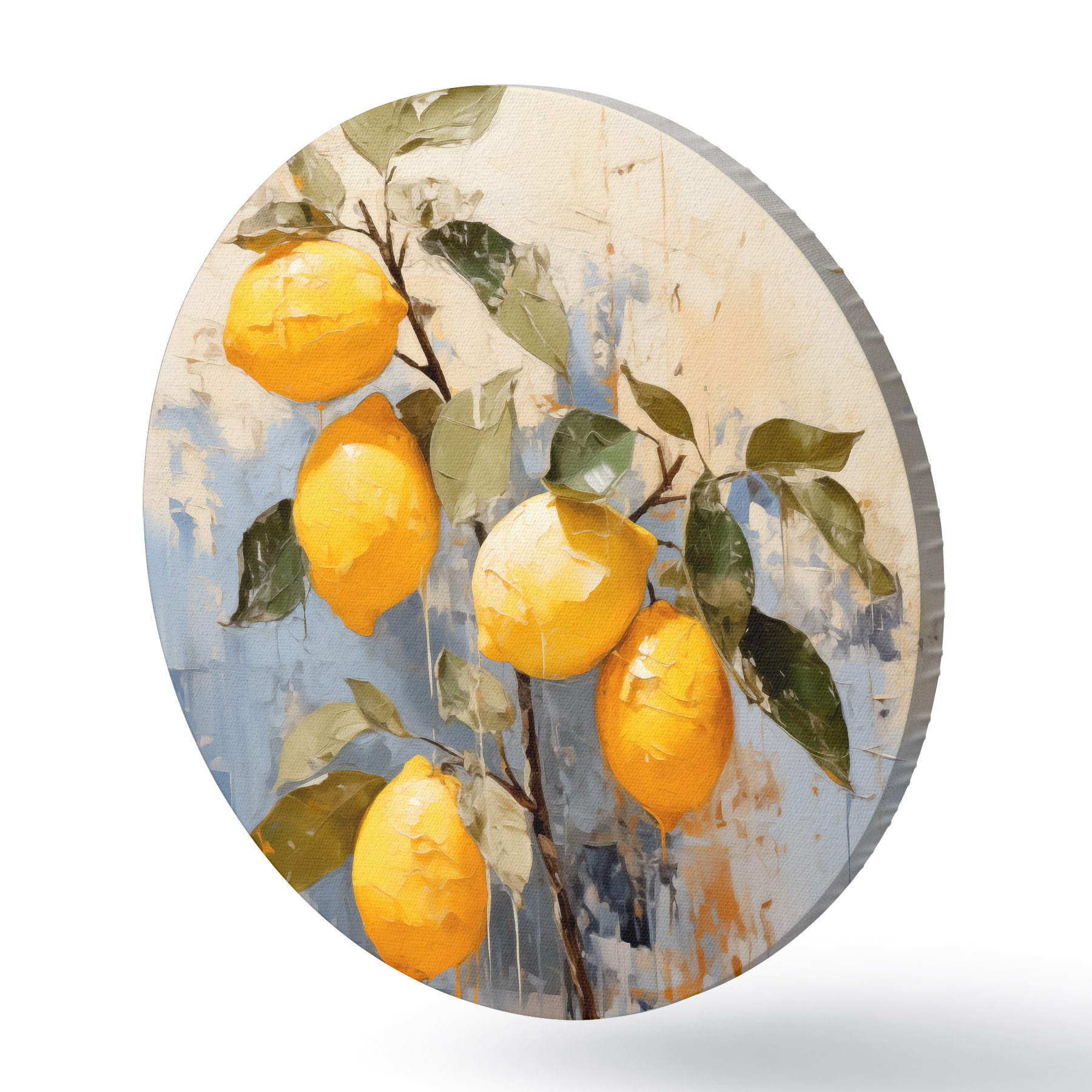 Tableaux ronds Branche avec des citrons mûrs peinture à l'huile art abstrait, couleur jaune, bleue et verte r39186