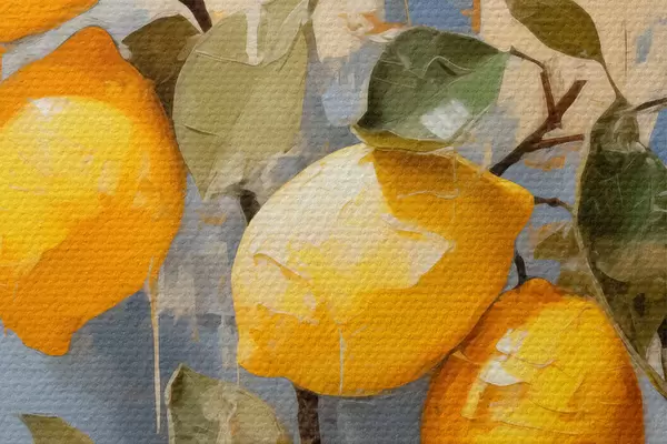 Image Branche avec des citrons mûrs peinture à l'huile art abstrait, couleur jaune, bleue et verte Nr r39186