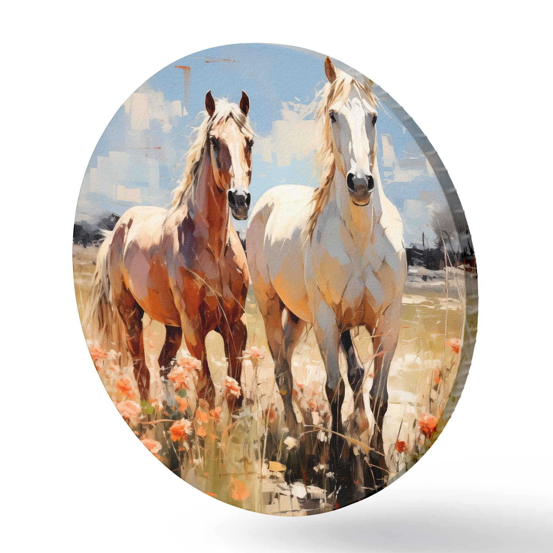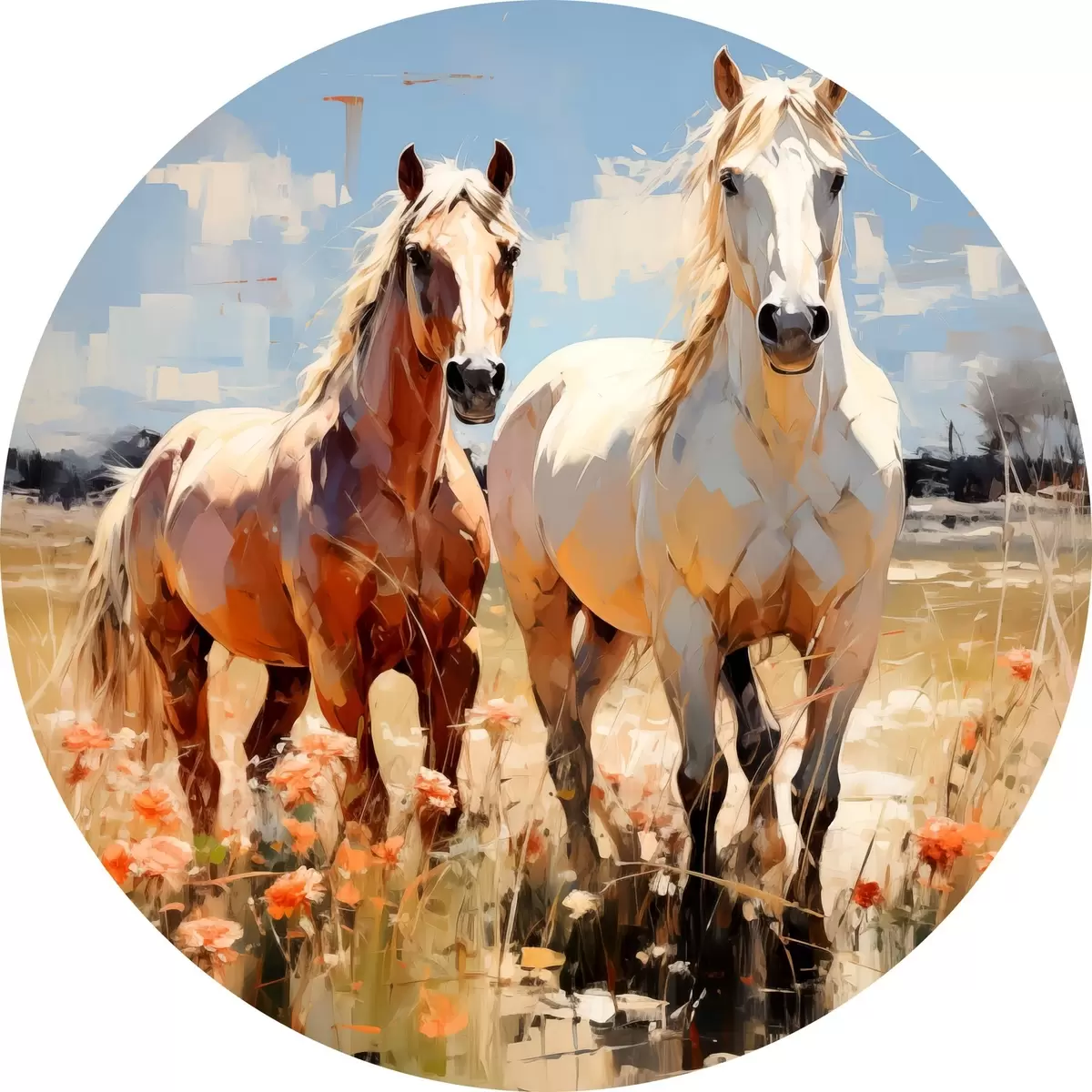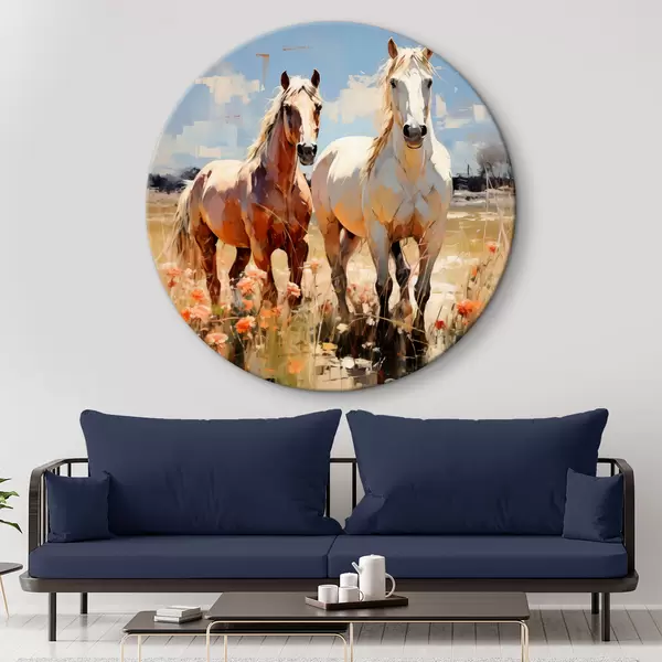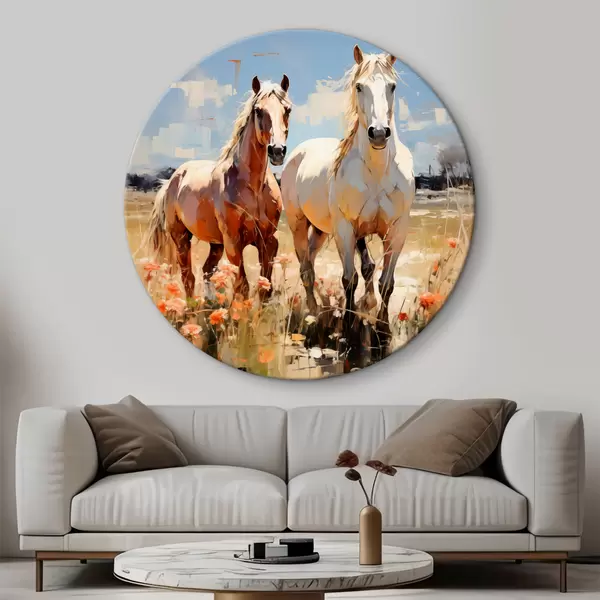 Tableaux ronds Les chevaux blancs et bruns paissent dans un pré parmi les fleurs sauvages peinture à l'huile art abstrait r39187