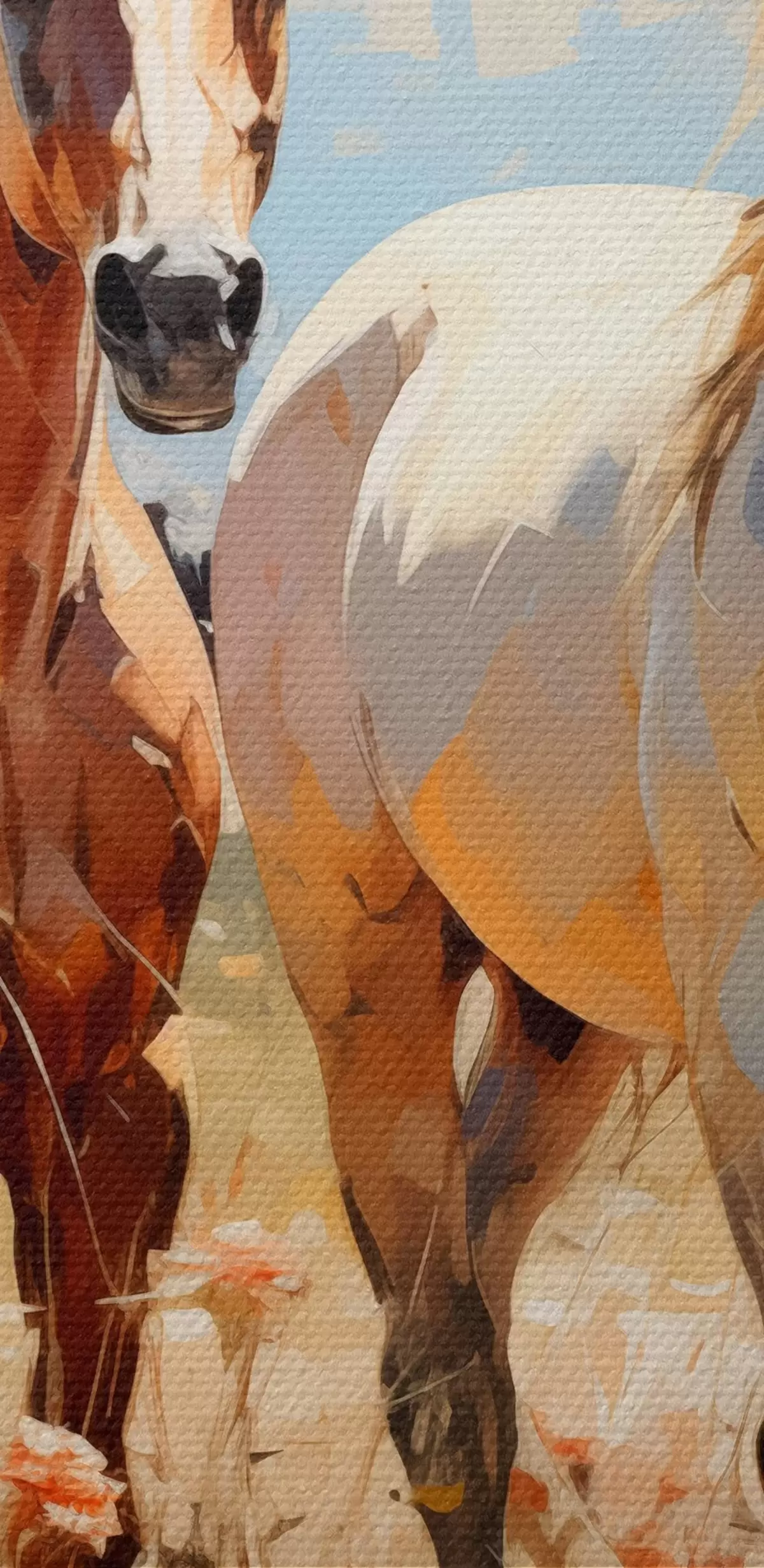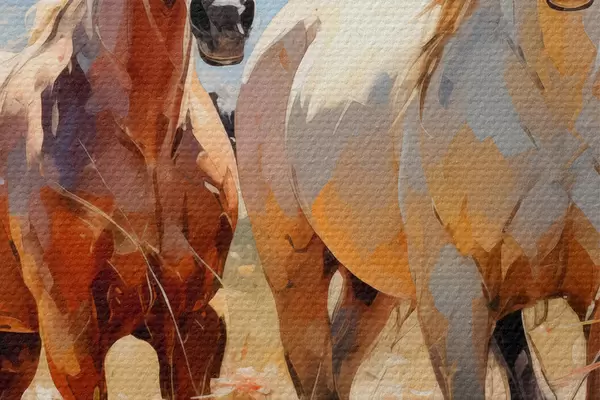 Image Les chevaux blancs et bruns paissent dans un pré parmi les fleurs sauvages peinture à l'huile art abstrait Nr r39187