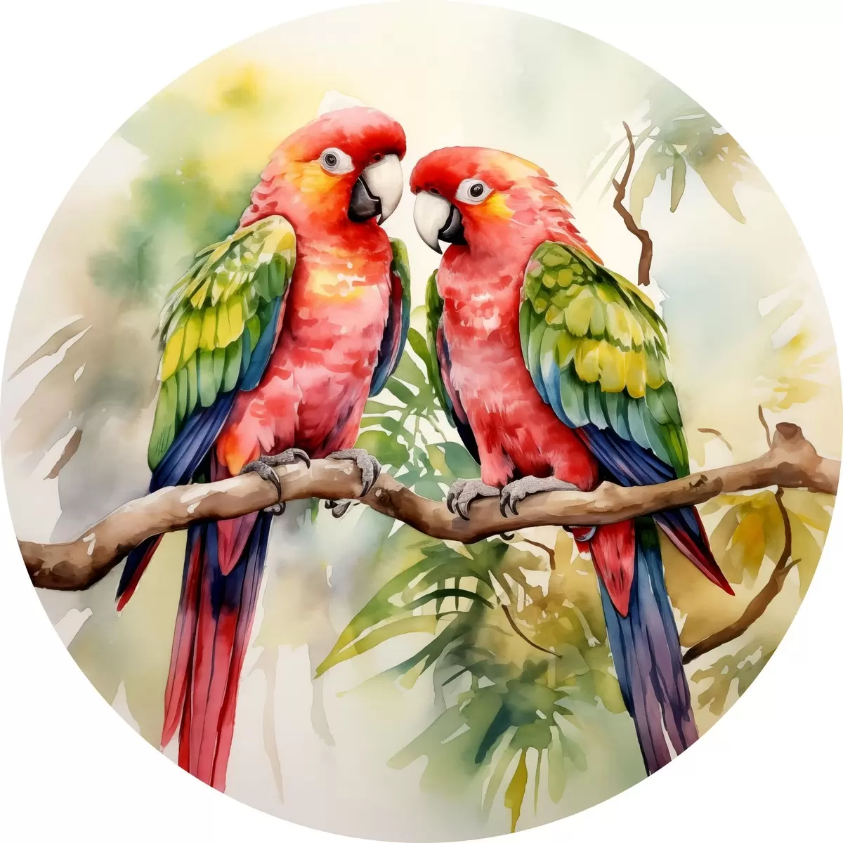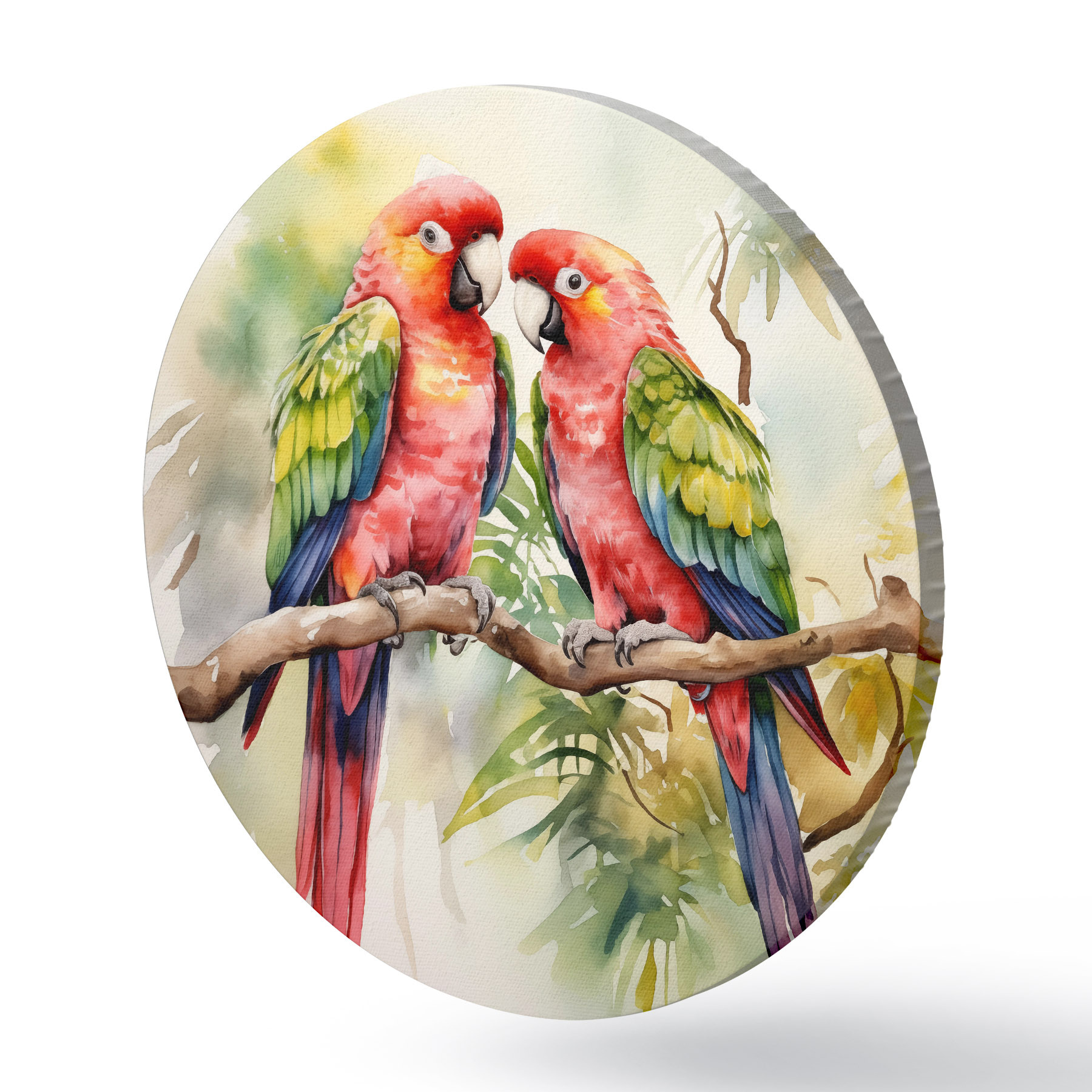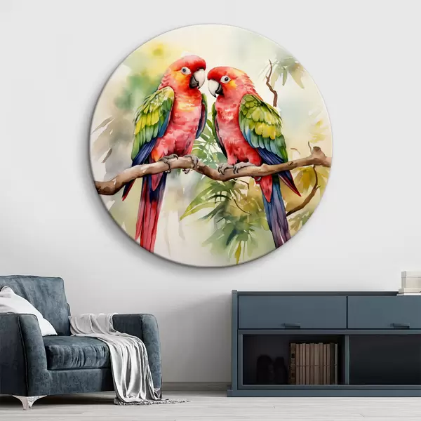 Tableaux ronds Deux perroquets aras brillants assis sur une aquarelle de branche r39333