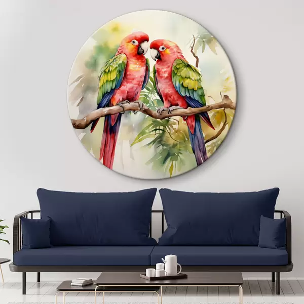 Tableaux ronds Deux perroquets aras brillants assis sur une aquarelle de branche r39333