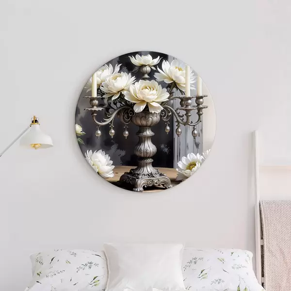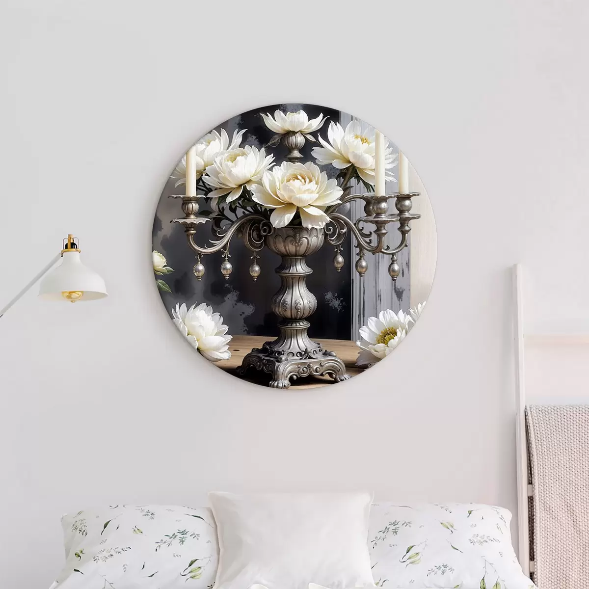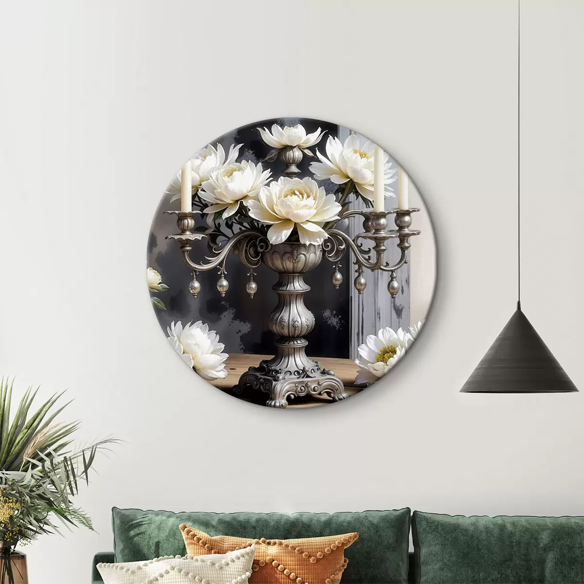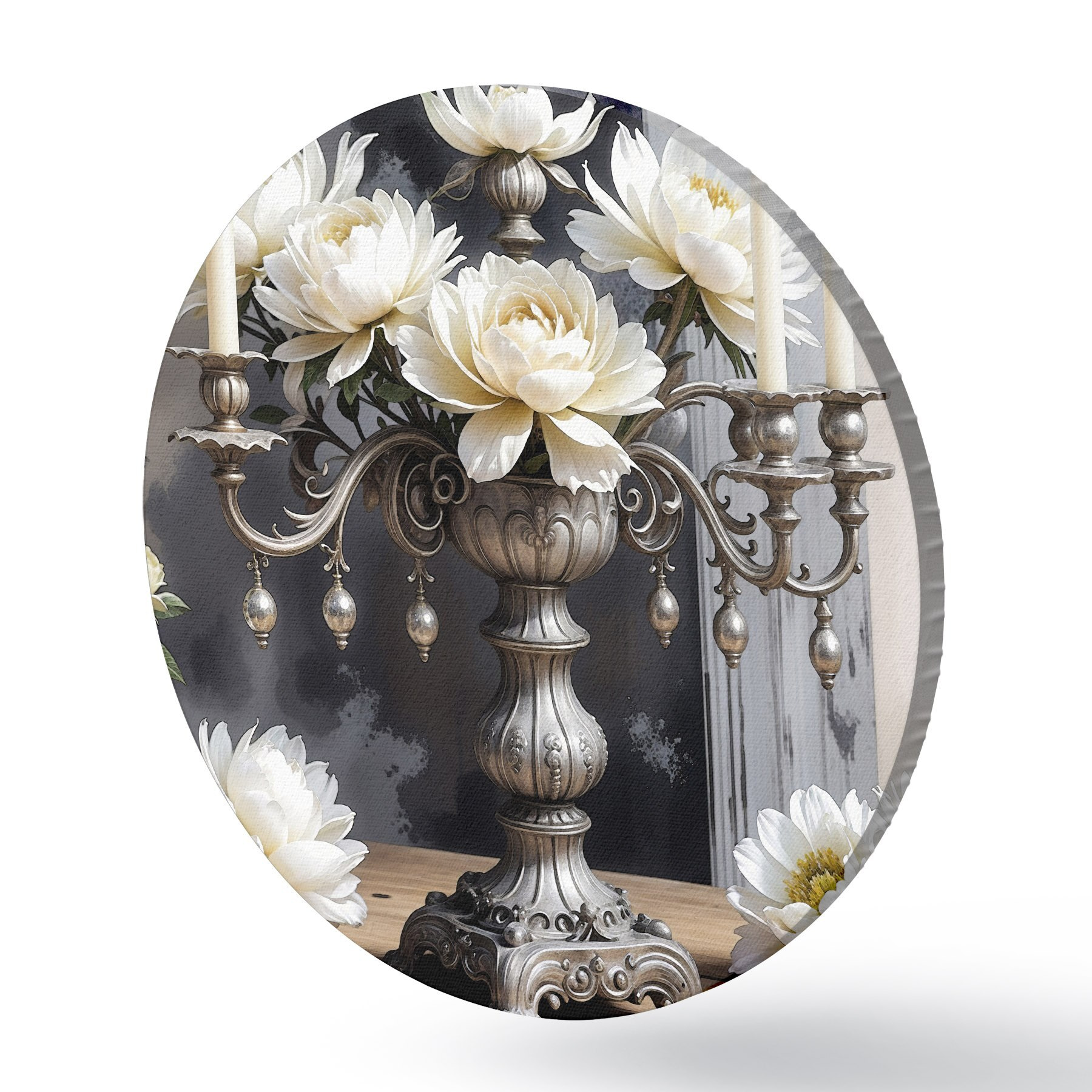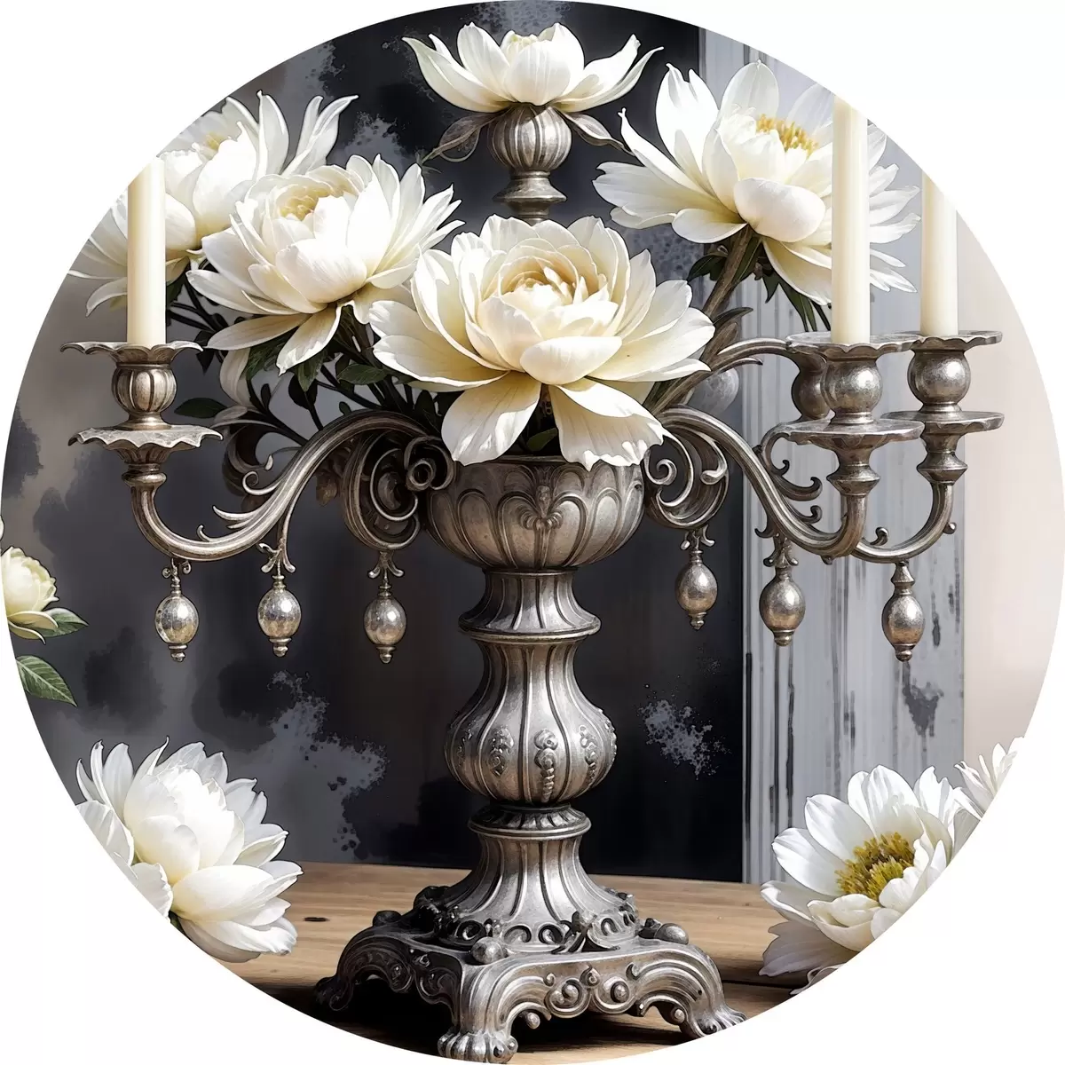 Tableaux ronds Un bouquet de grandes fleurs de dahlia blanches dans un vase argenté orné, entouré de bougies allumées sur une table en bois r39384