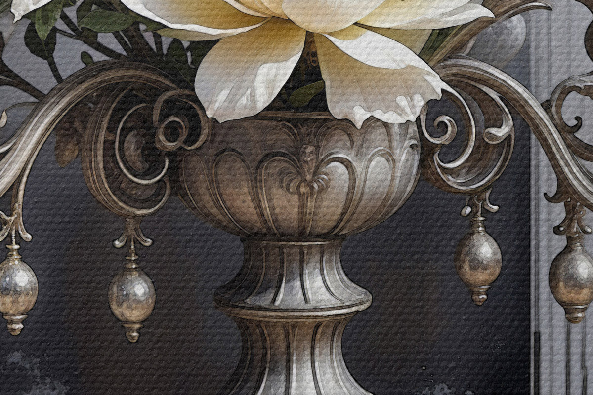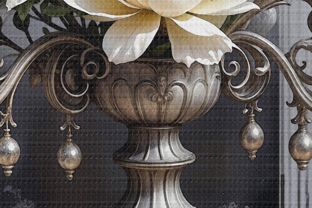 Image Un bouquet de grandes fleurs de dahlia blanches dans un vase argenté orné, entouré de bougies allumées sur une table en bois Nr r39384