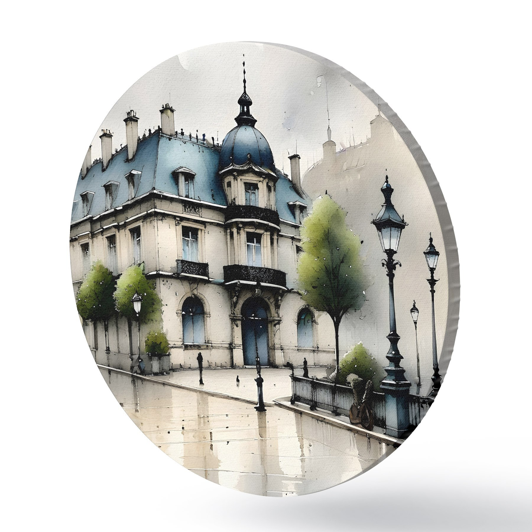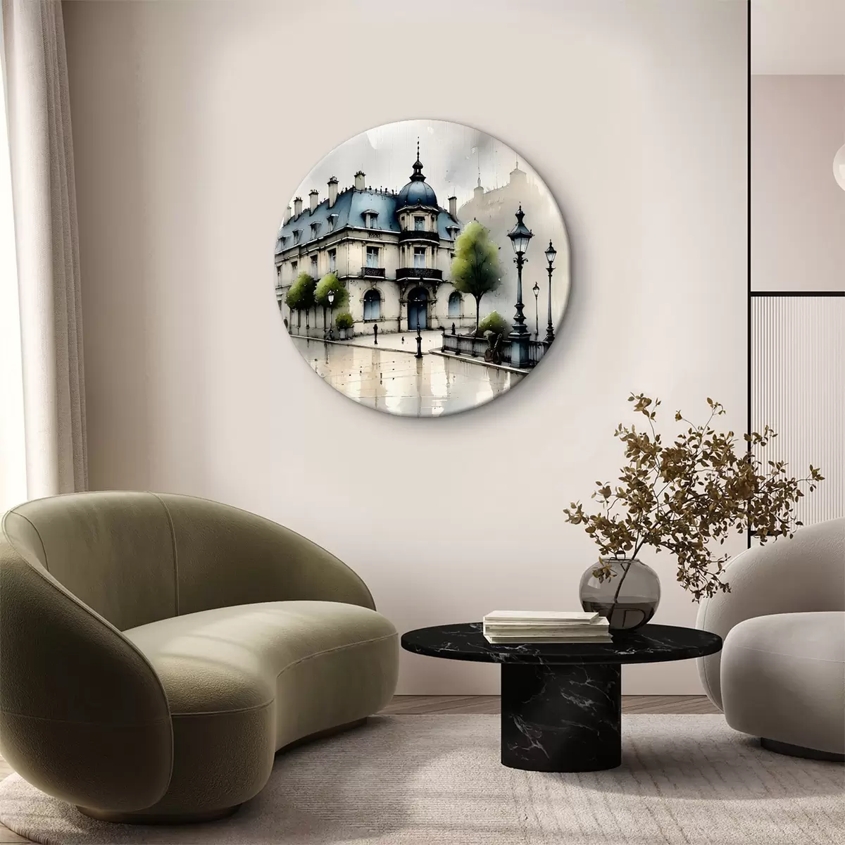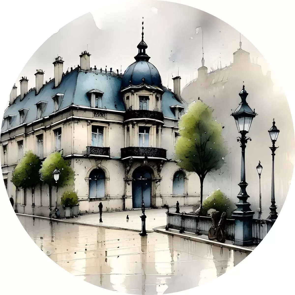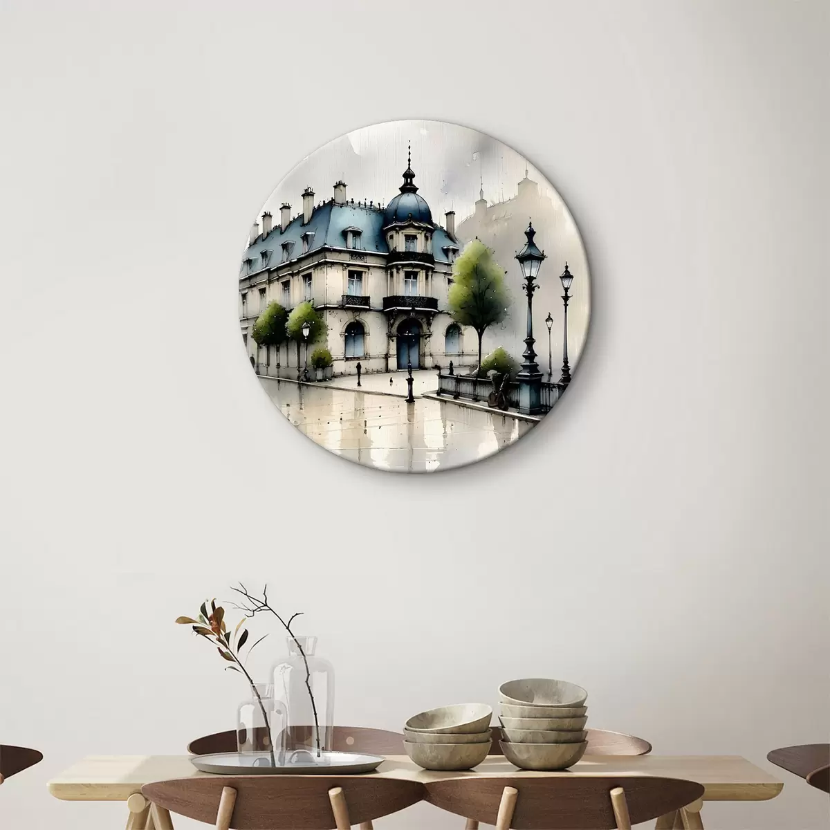 Tableaux ronds Un grand bâtiment d'aquarelle entouré de lampadaires et d'arbres, un jour de pluie r39391