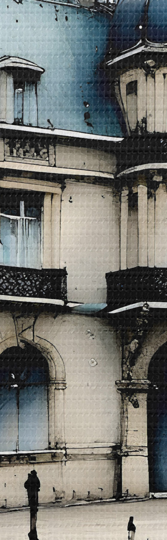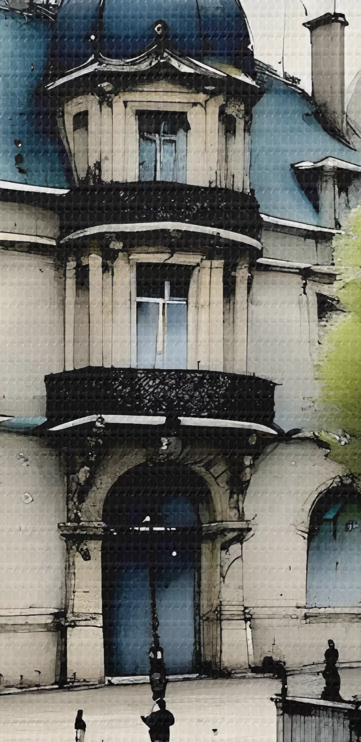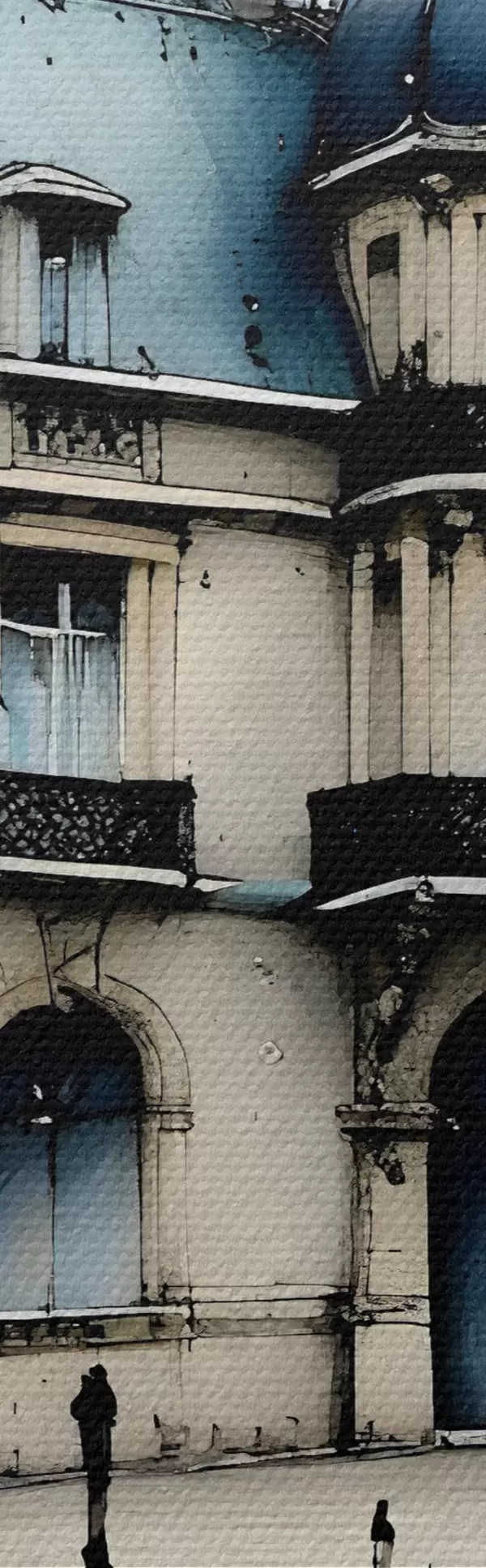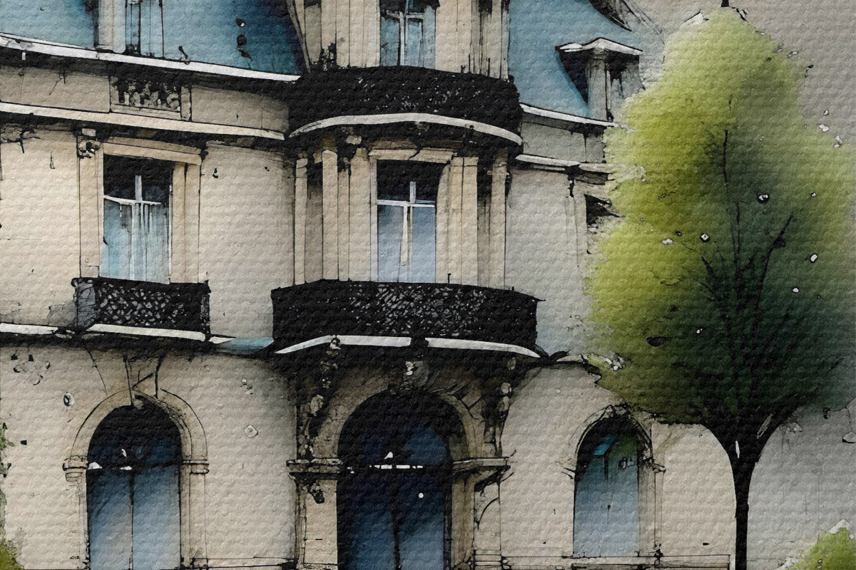 Image Un grand bâtiment d'aquarelle entouré de lampadaires et d'arbres, un jour de pluie Nr r39391
