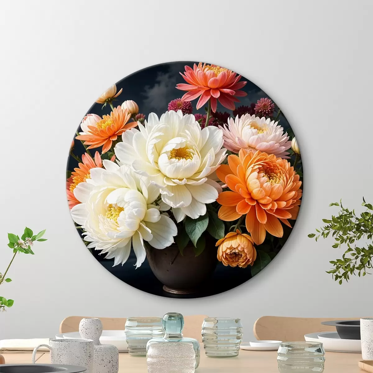 Tableaux ronds Un bouquet de fleurs de dahlia vibrantes de différentes couleurs sur fond sombre r39399