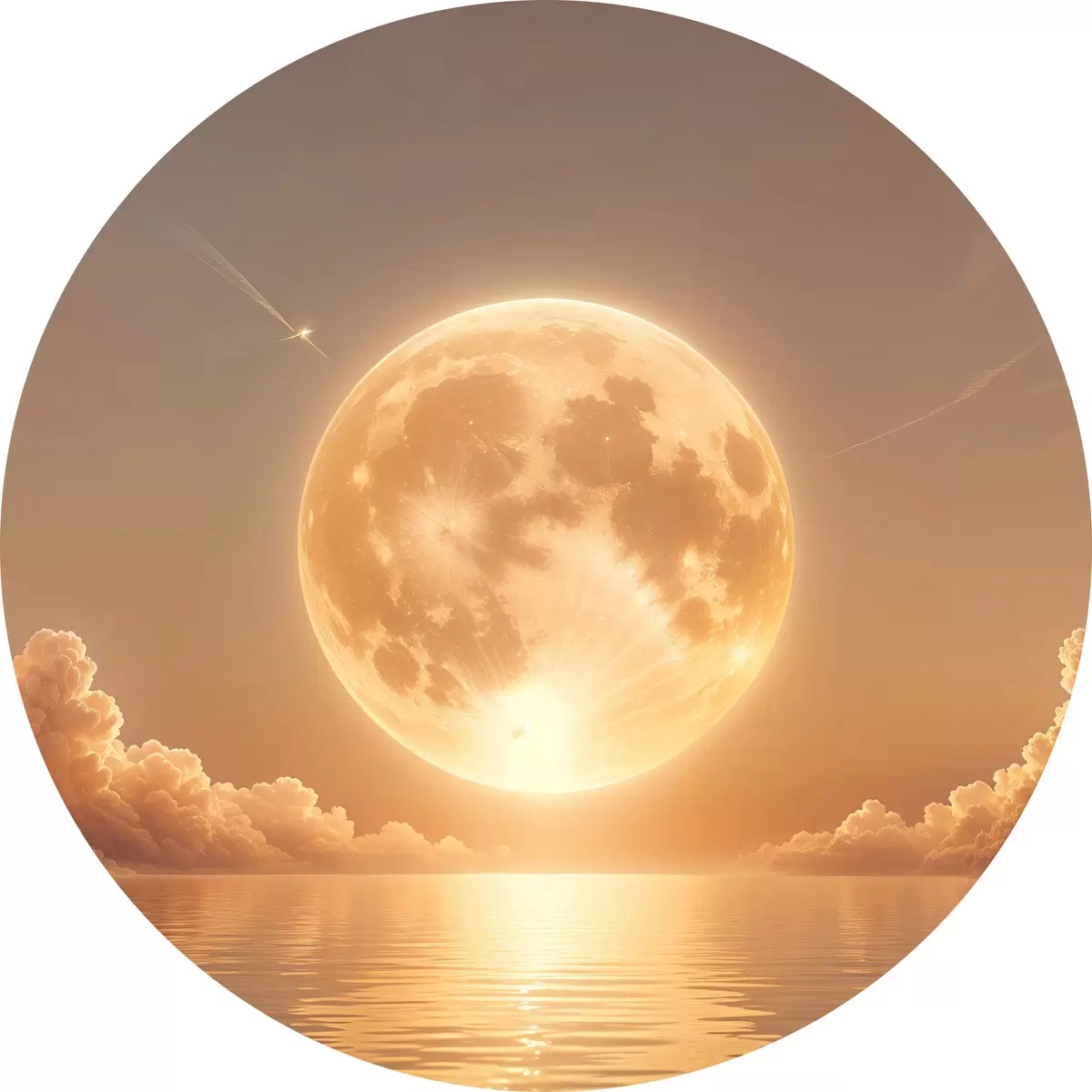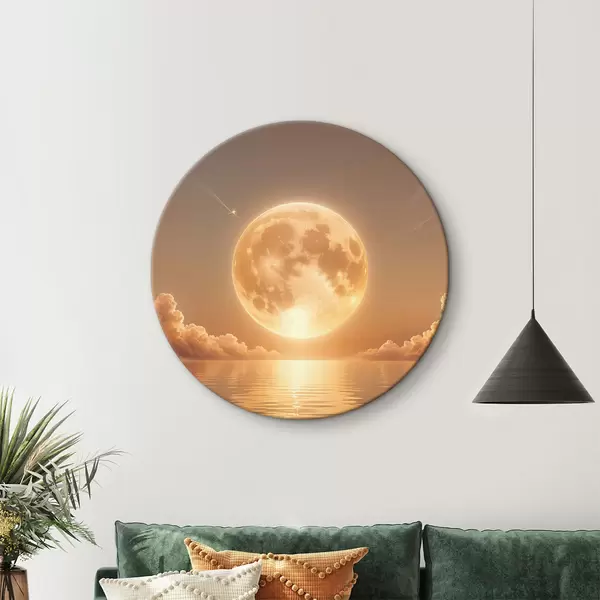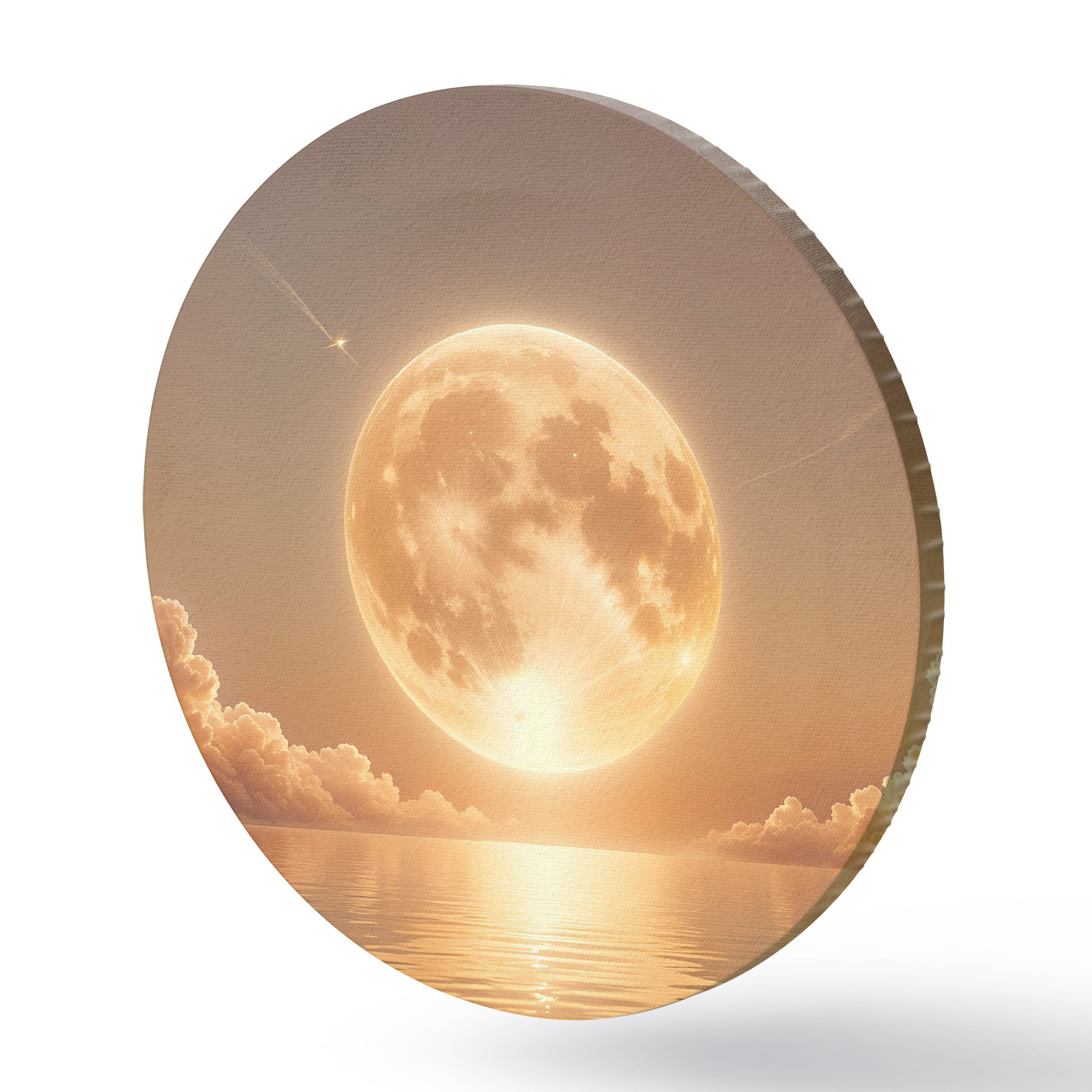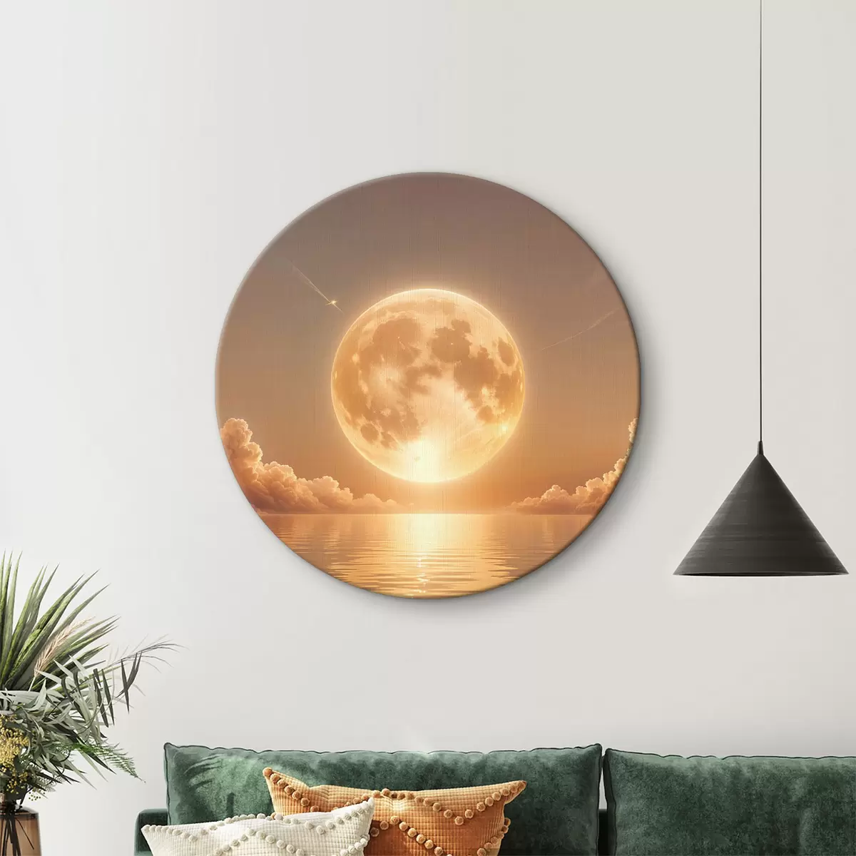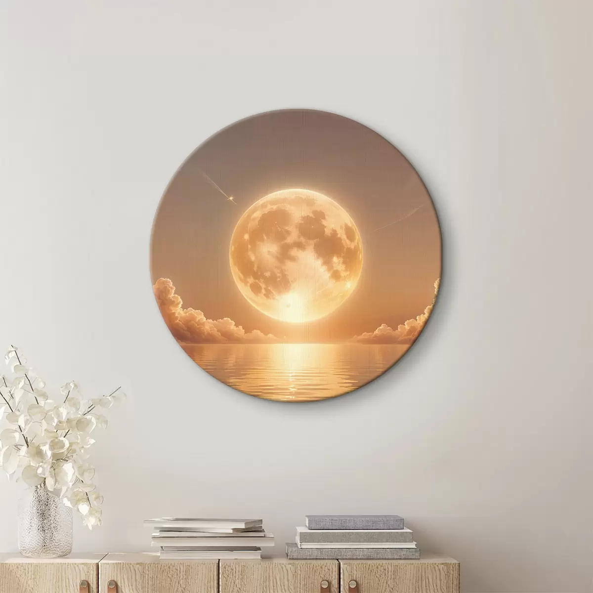 Tableaux ronds Une grande et lumineuse pleine lune se levant sur un océan calme et réfléchissant au coucher du soleil r39403