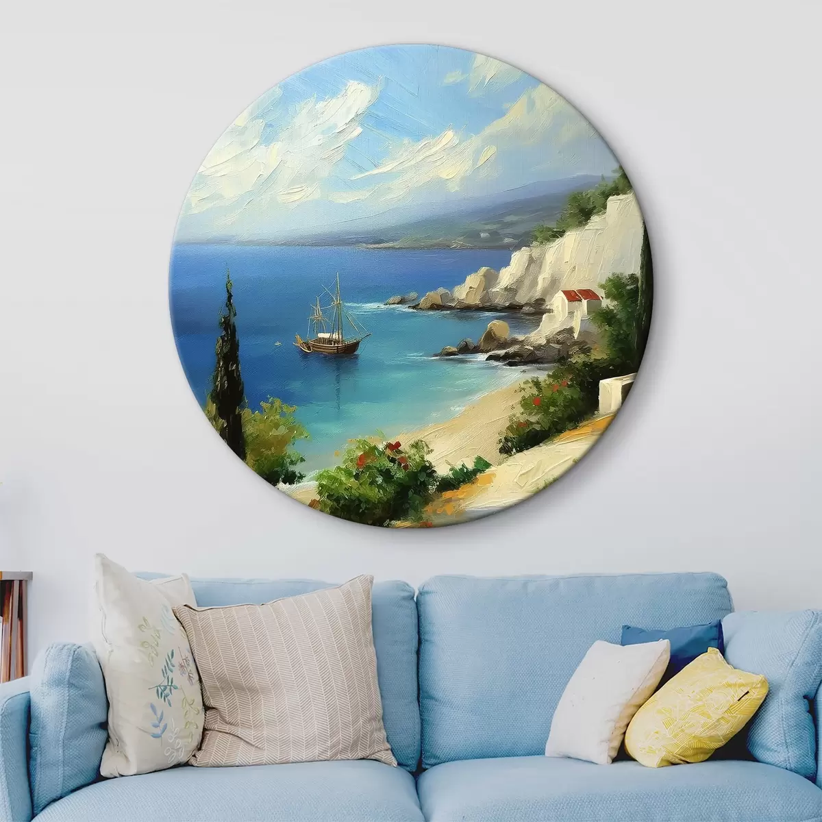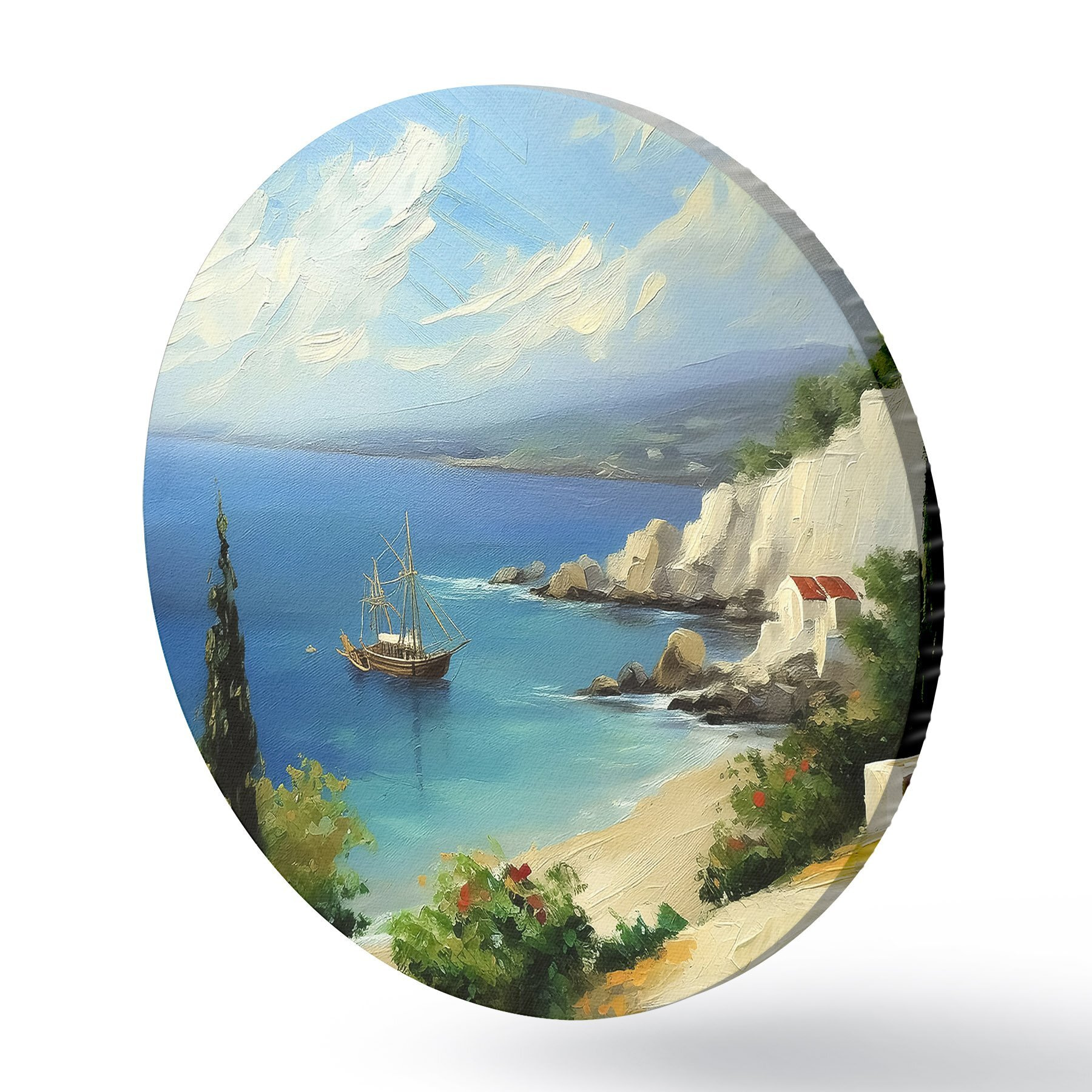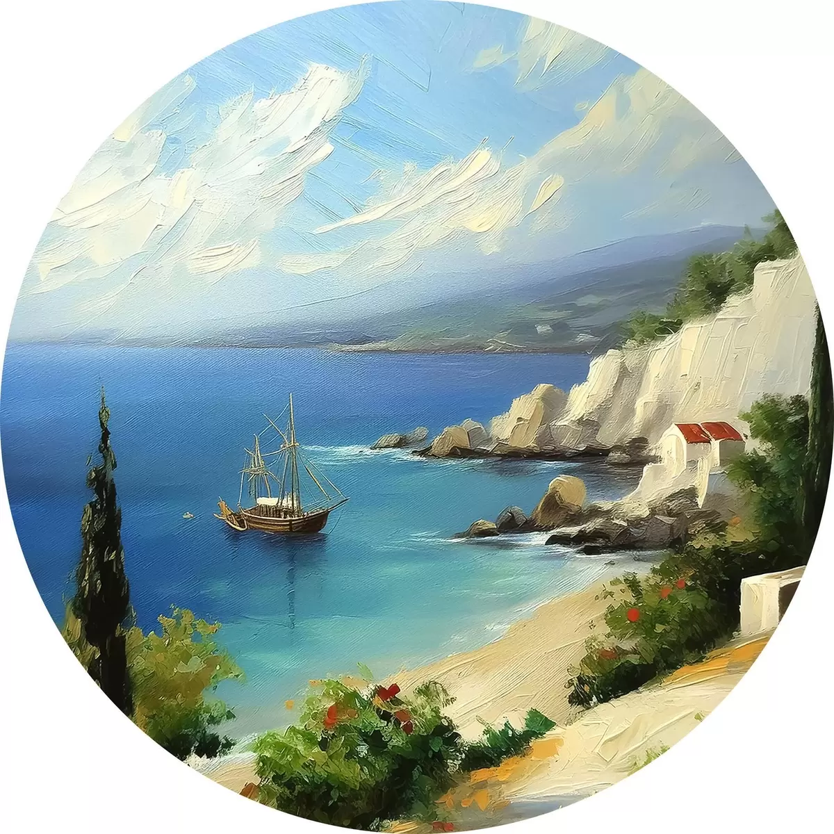 Tableaux ronds Côte maritime de Grèce, navire, eau bleue, peinture à l'huile, nature estivale, rochers, coups de pinceau vifs r39425