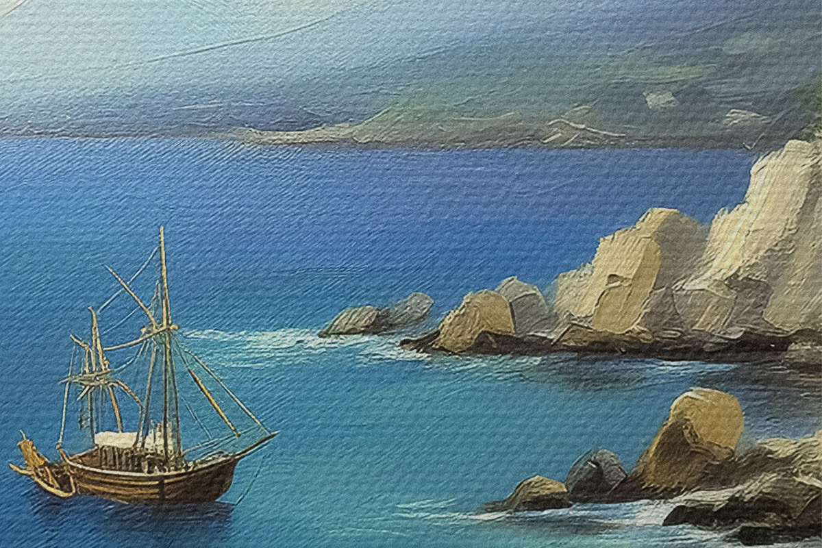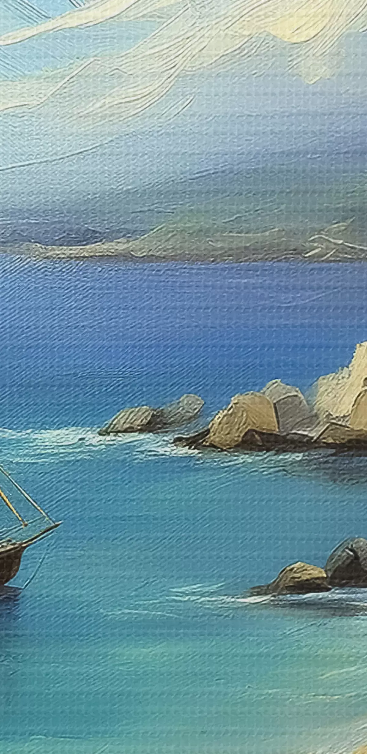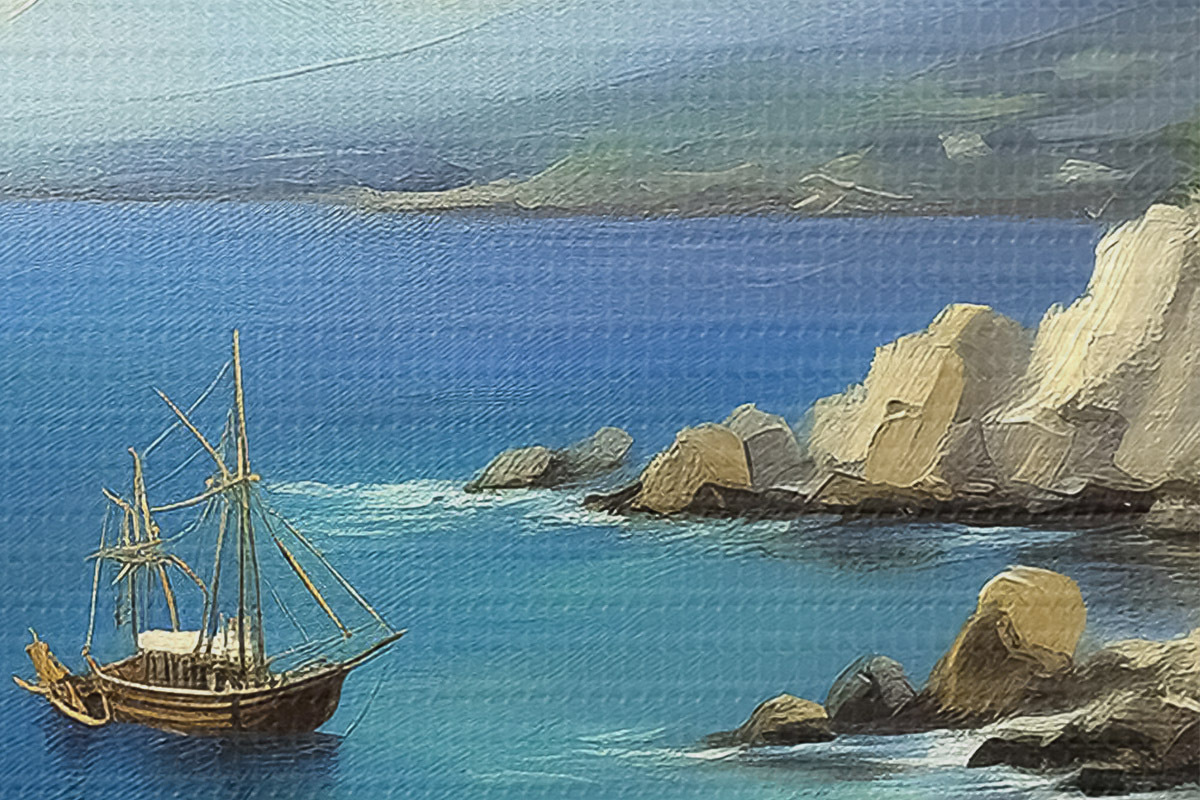 Image Côte maritime de Grèce, navire, eau bleue, peinture à l'huile, nature estivale, rochers, coups de pinceau vifs Nr r39425