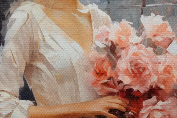 Image Une fille en robe blanche à la gare tient un bouquet de roses roses dans ses mains peinture à l'huile Nr r39438