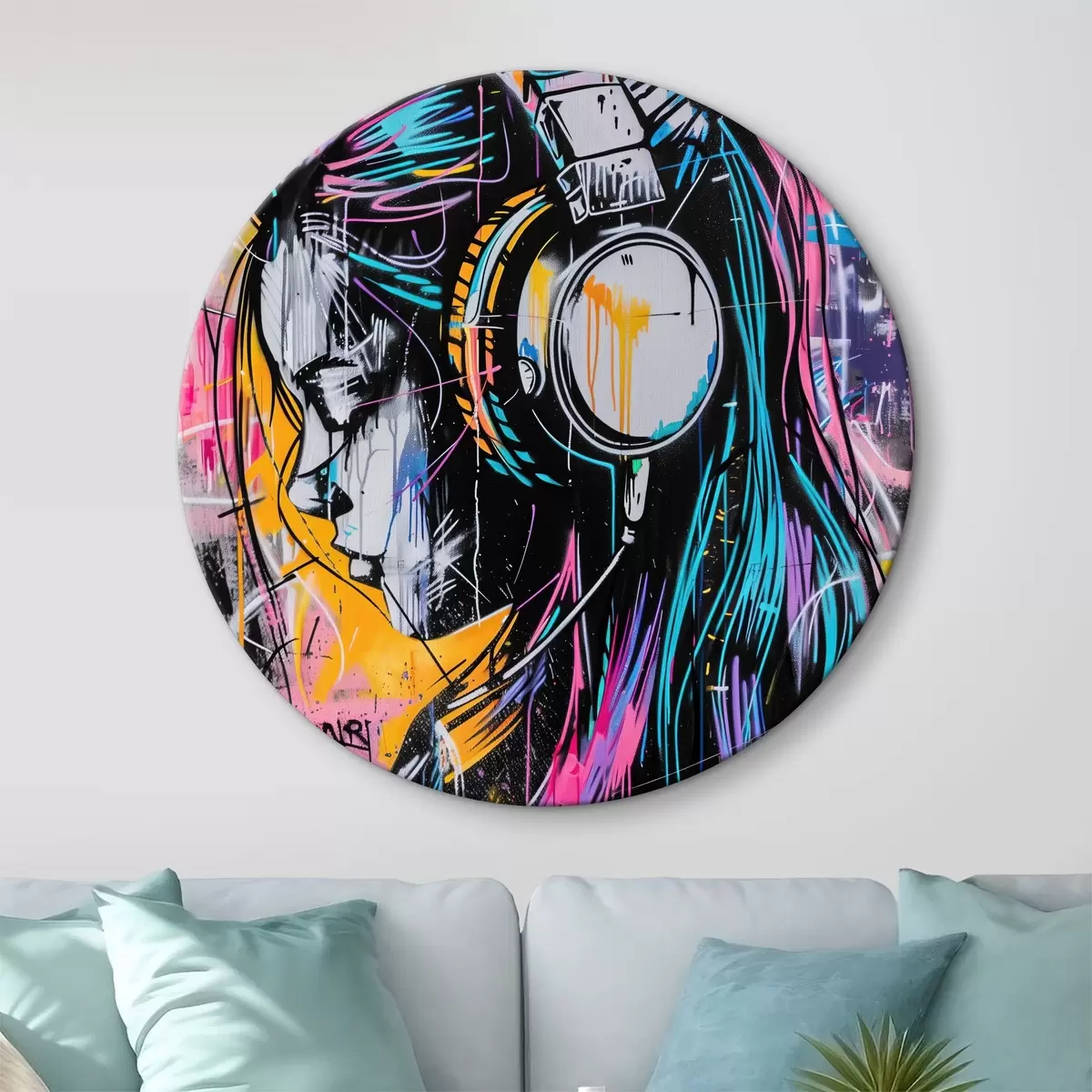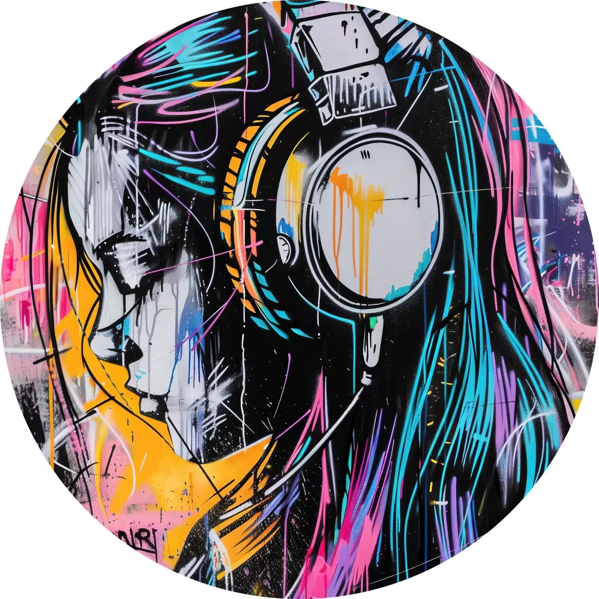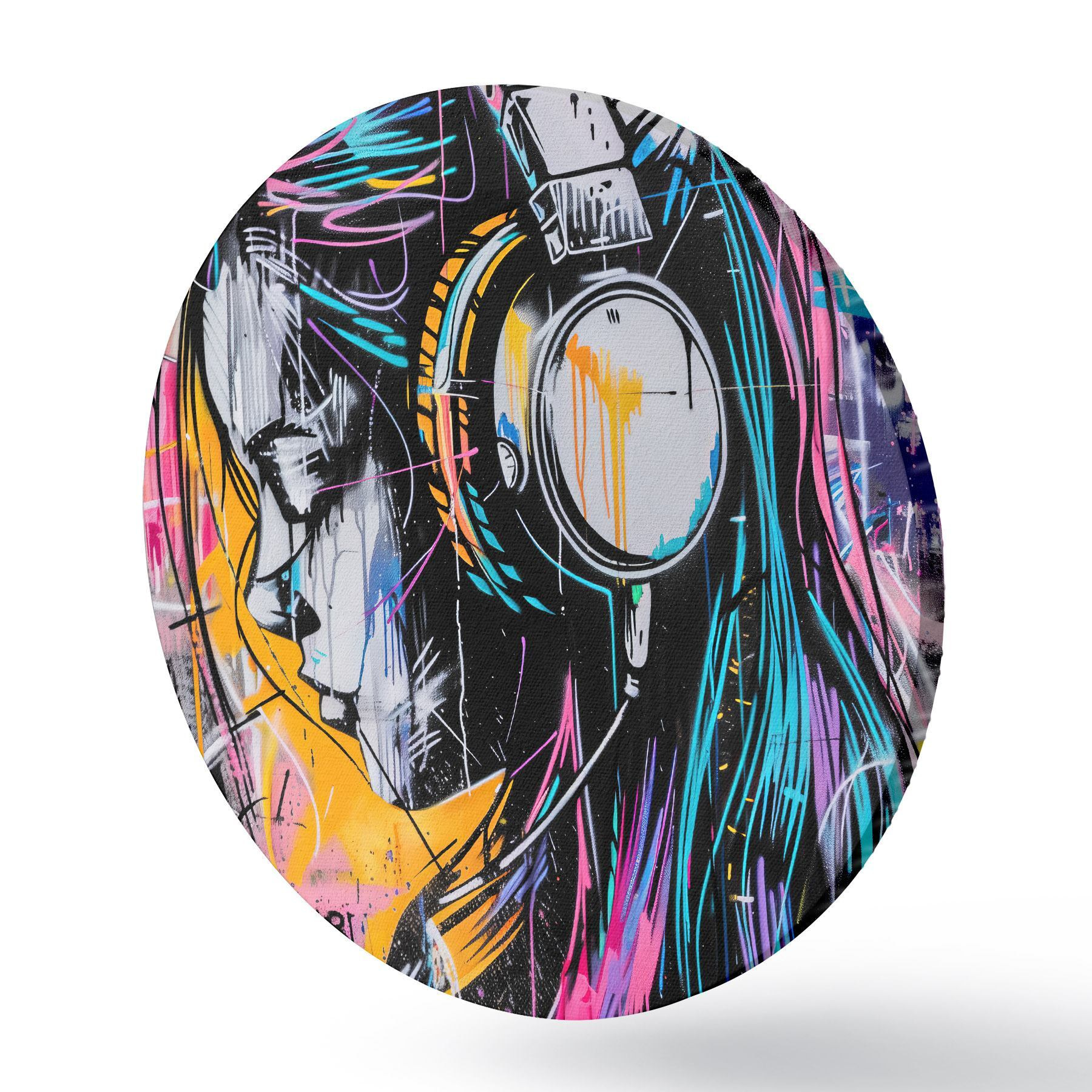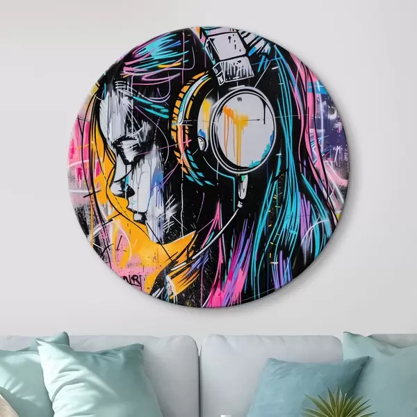 Tableaux ronds Femme avec des écouteurs dans un style graffiti r39443
