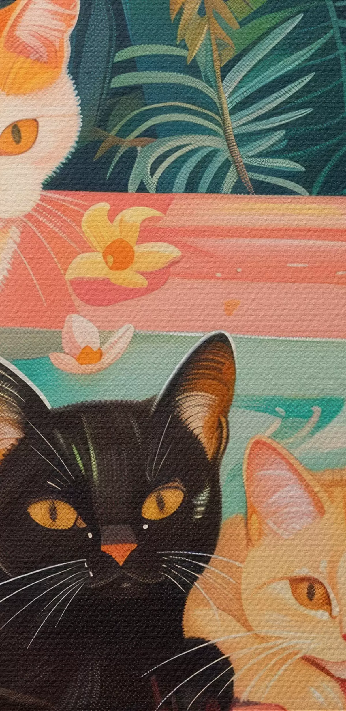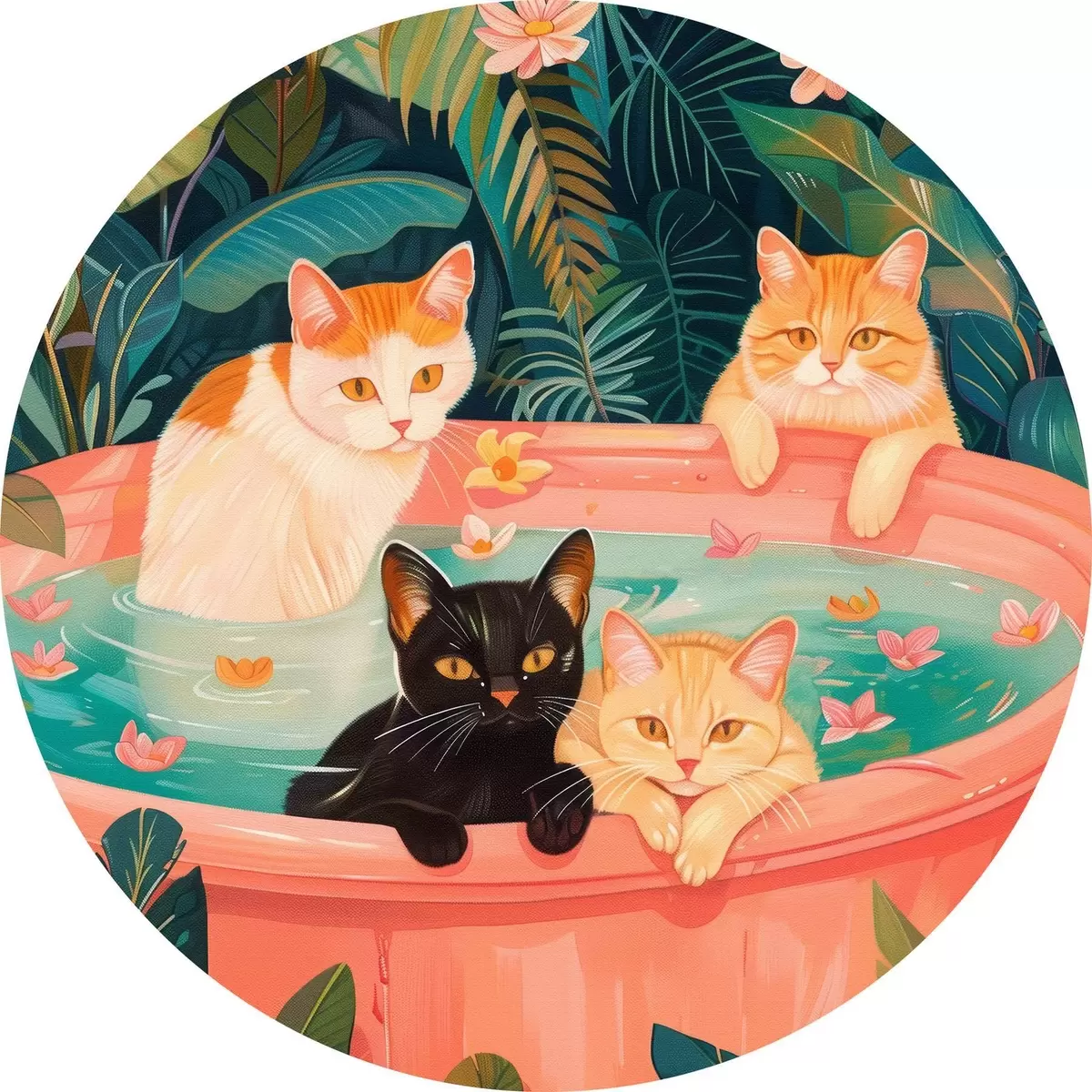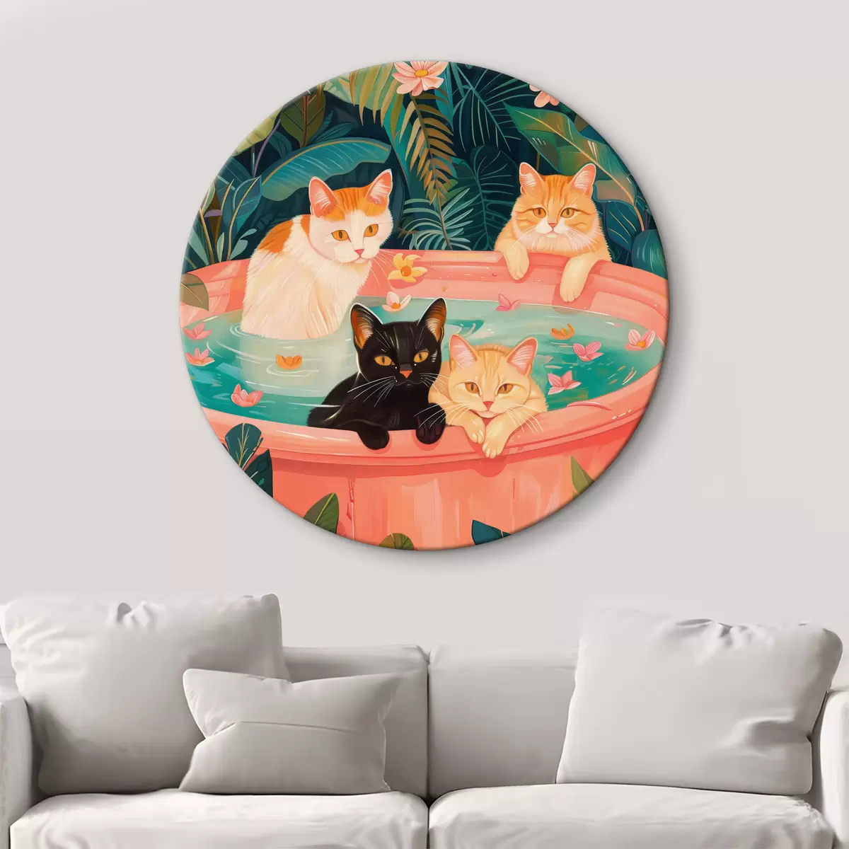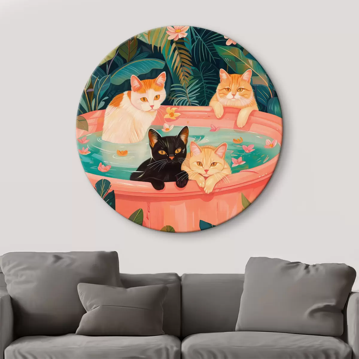 Tableaux ronds Chats dans un bain rose aux feuilles vertes, ambiance jungle r39465