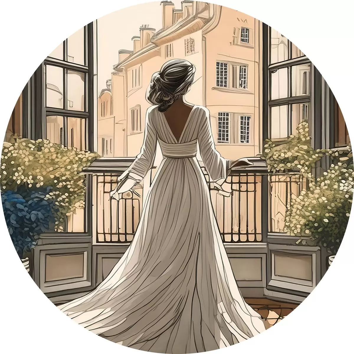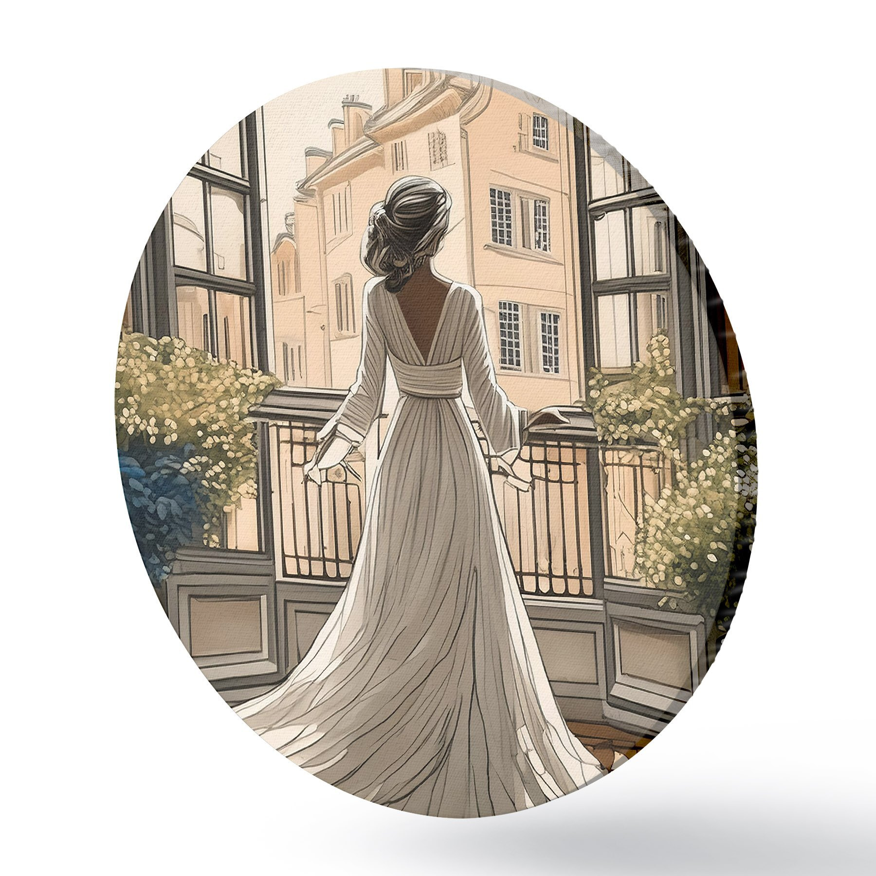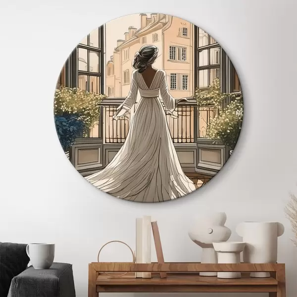 Tableaux ronds silhouette d'une jeune fille vêtue d'une robe blanche près d'une grande fenêtre r39480