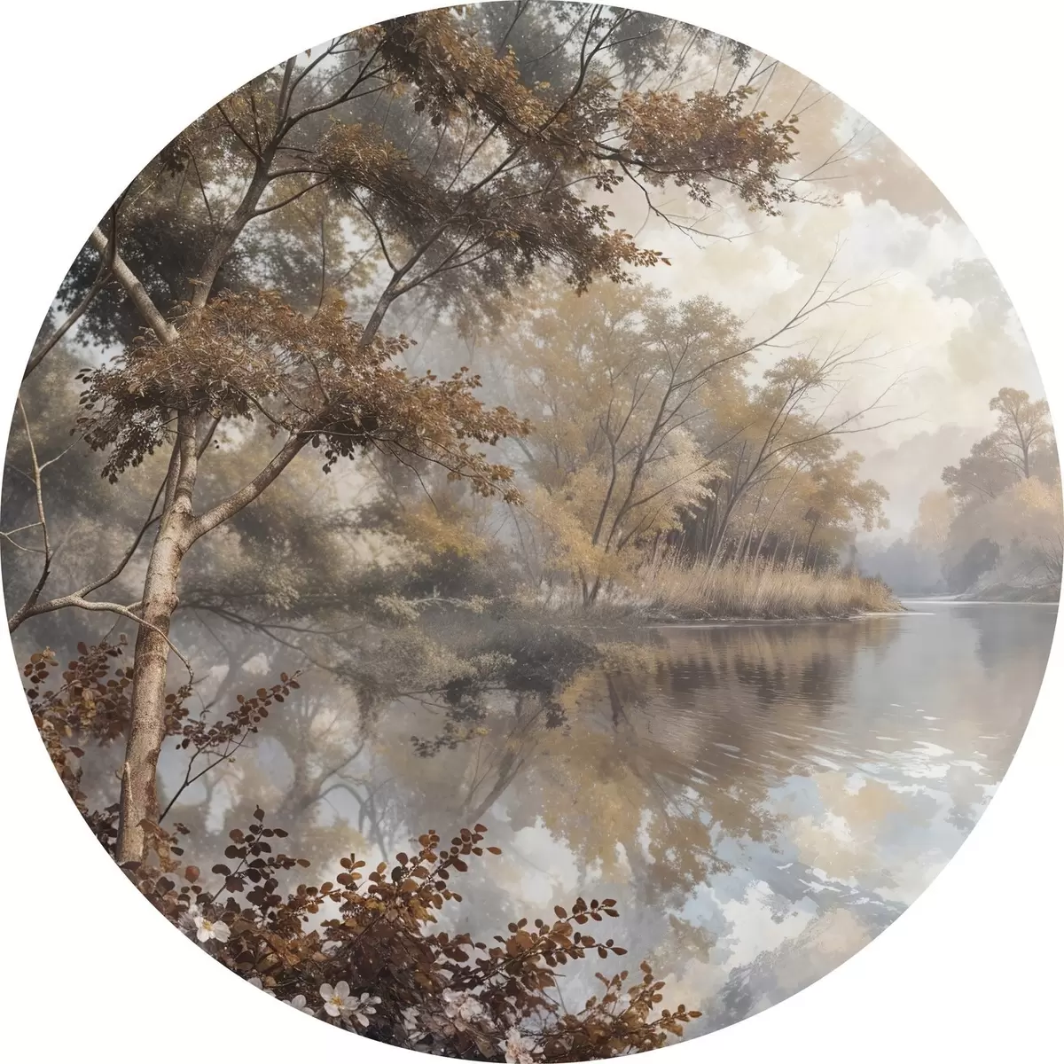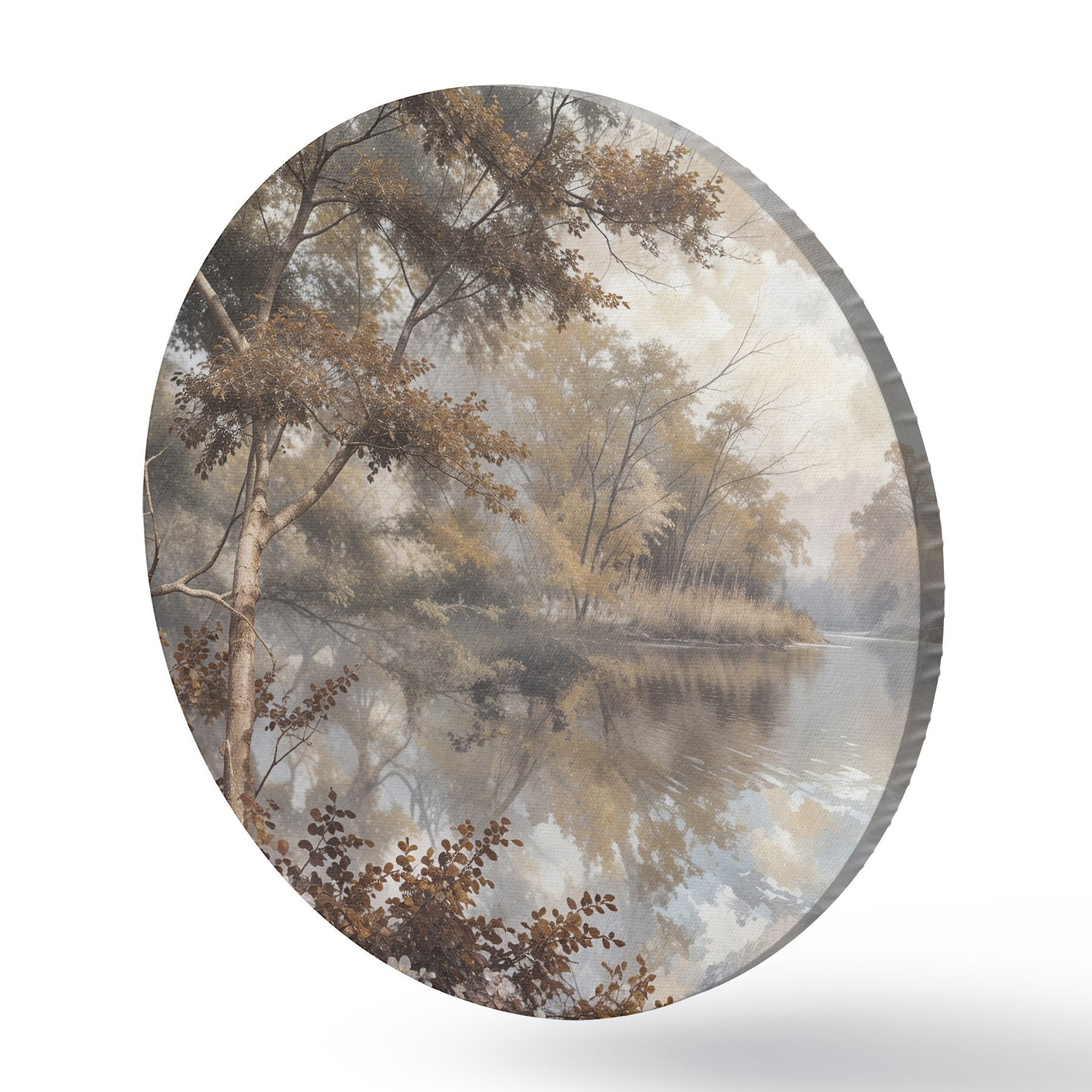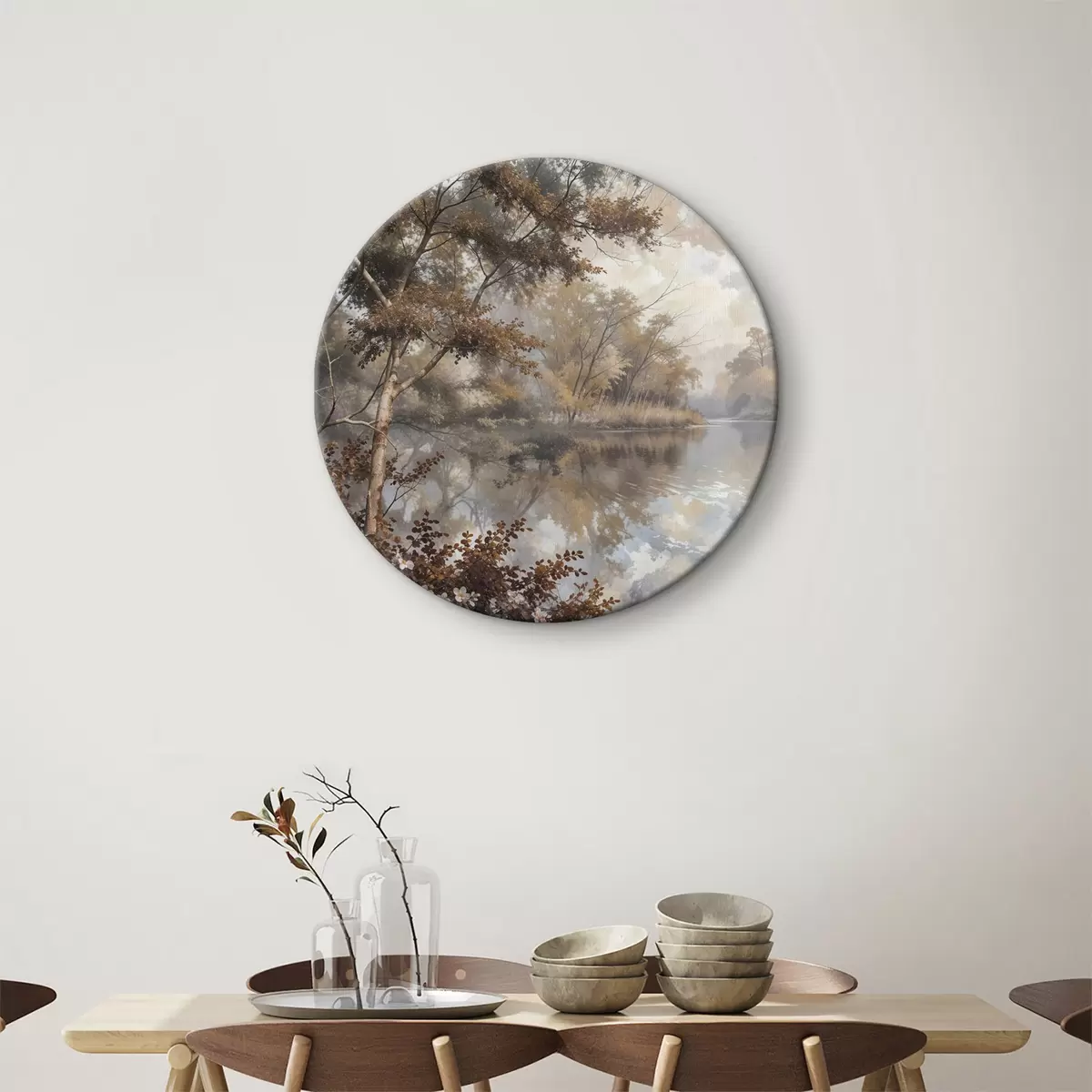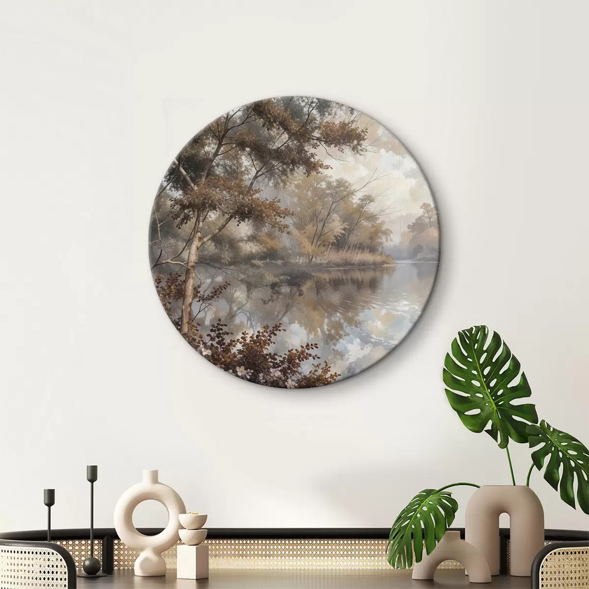 Tableaux ronds Paysage d'automne avec un lac calme entouré d'arbres au feuillage orange et jaune vif r39511