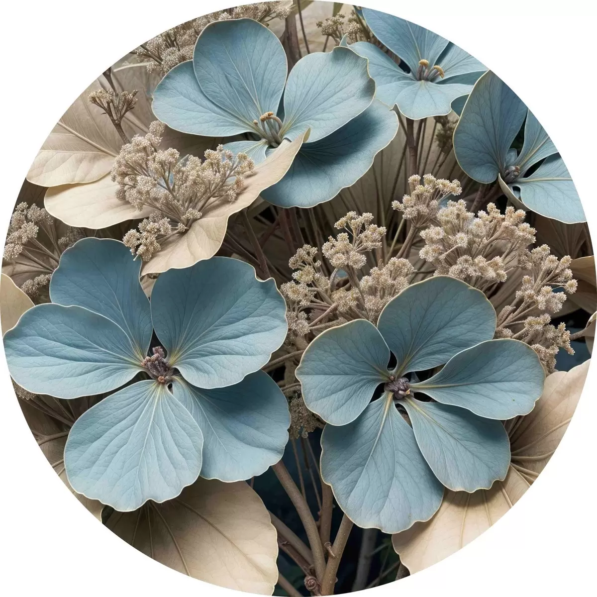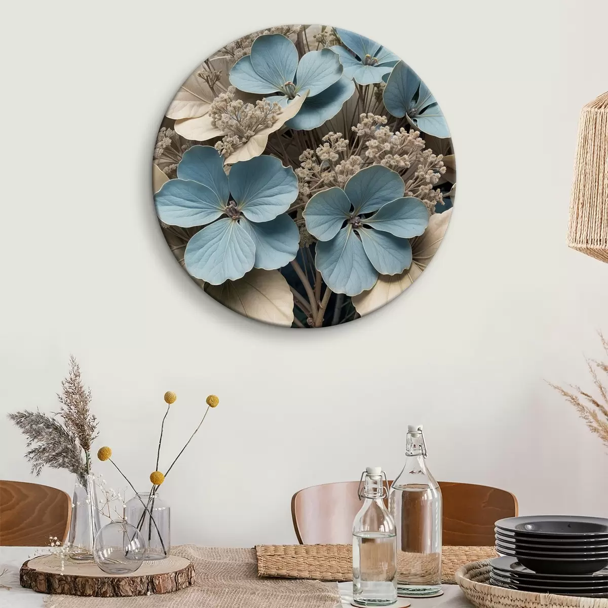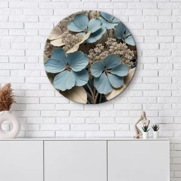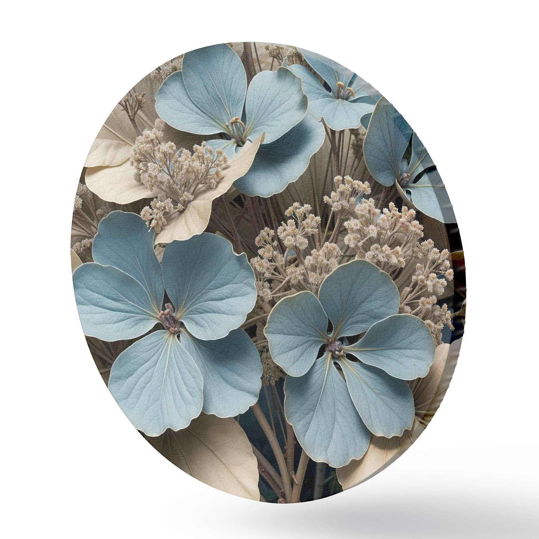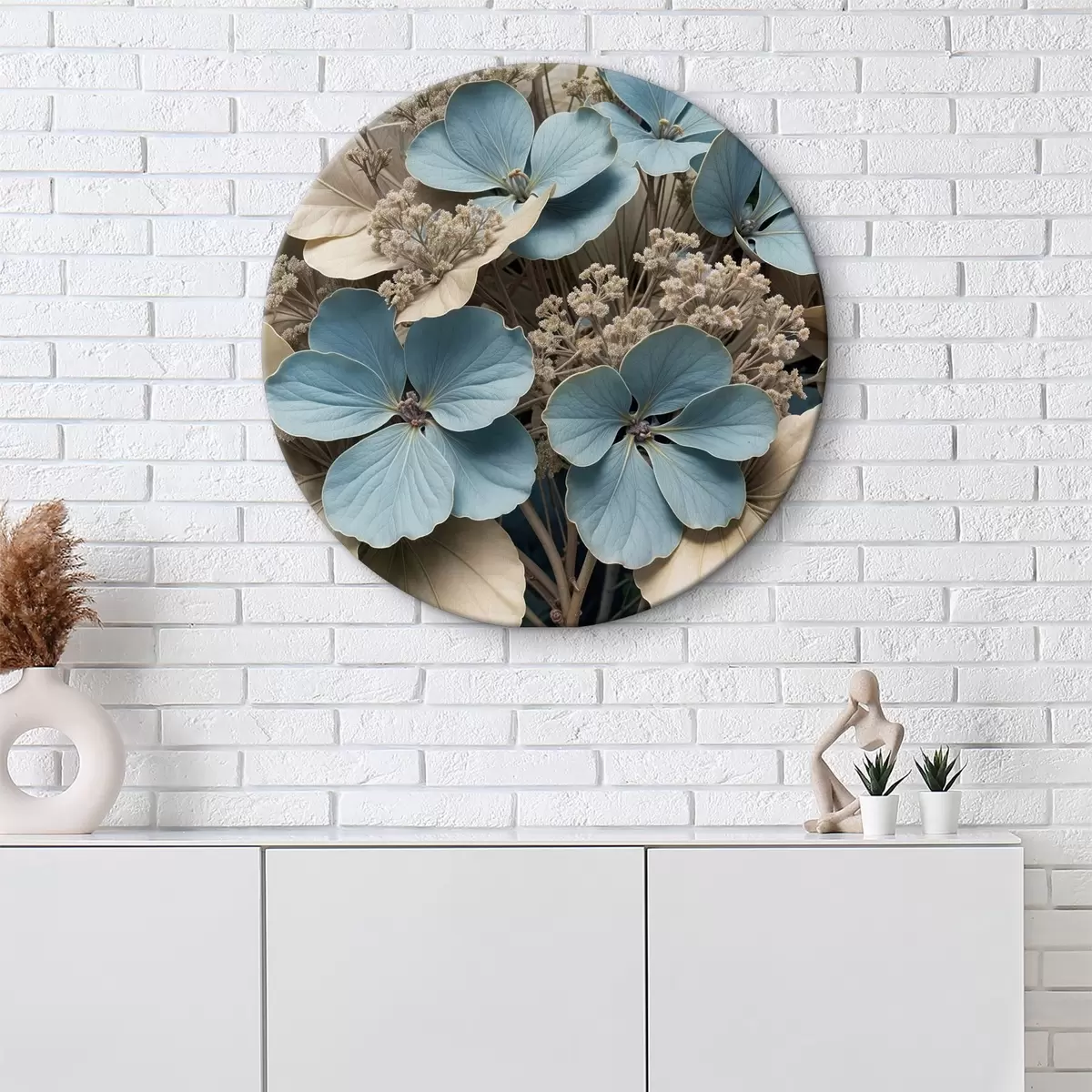 Tableaux ronds Gros plan de fleurs bleues et blanches aux pétales doux et flous sur fond brun r39517