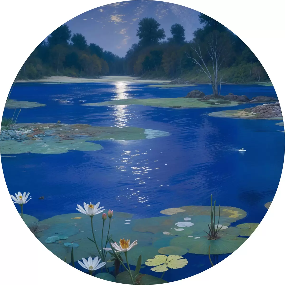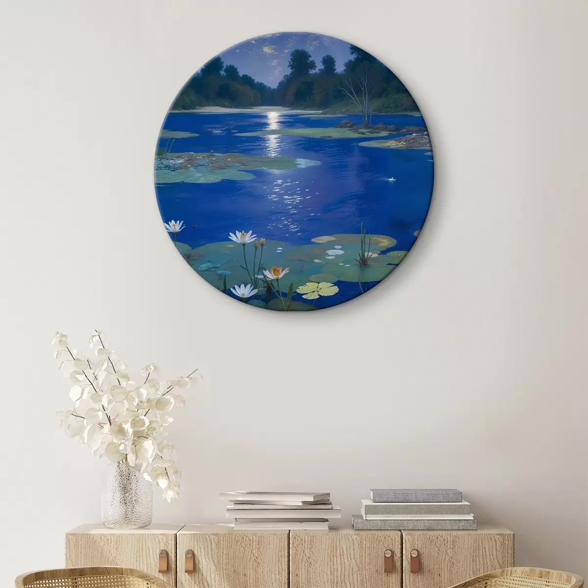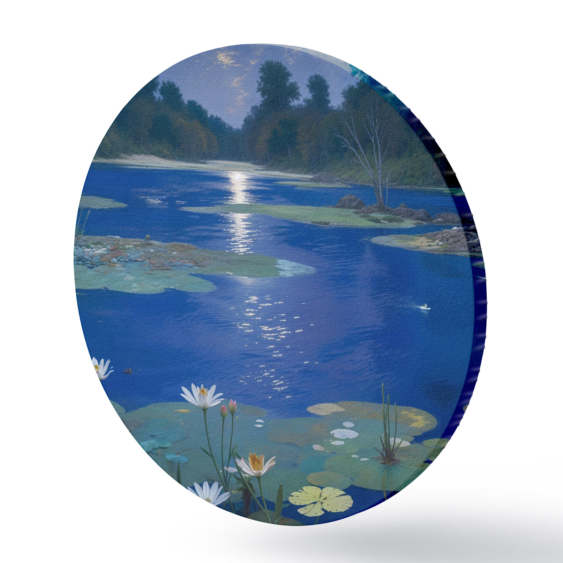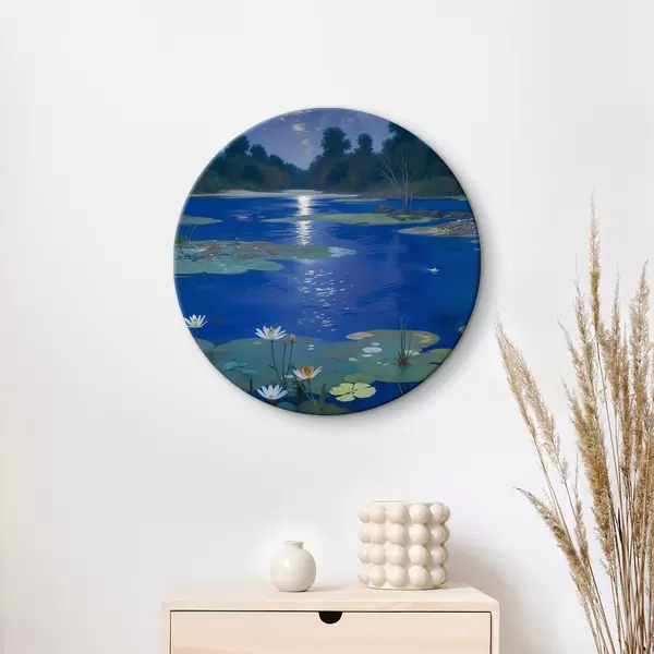 Tableaux ronds Lac de nuit avec la pleine lune se reflétant dans l'eau, avec des arbres verts et des nénuphars r39526